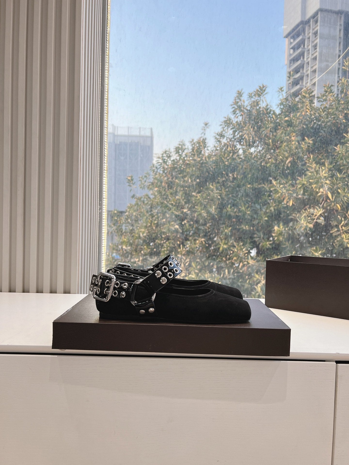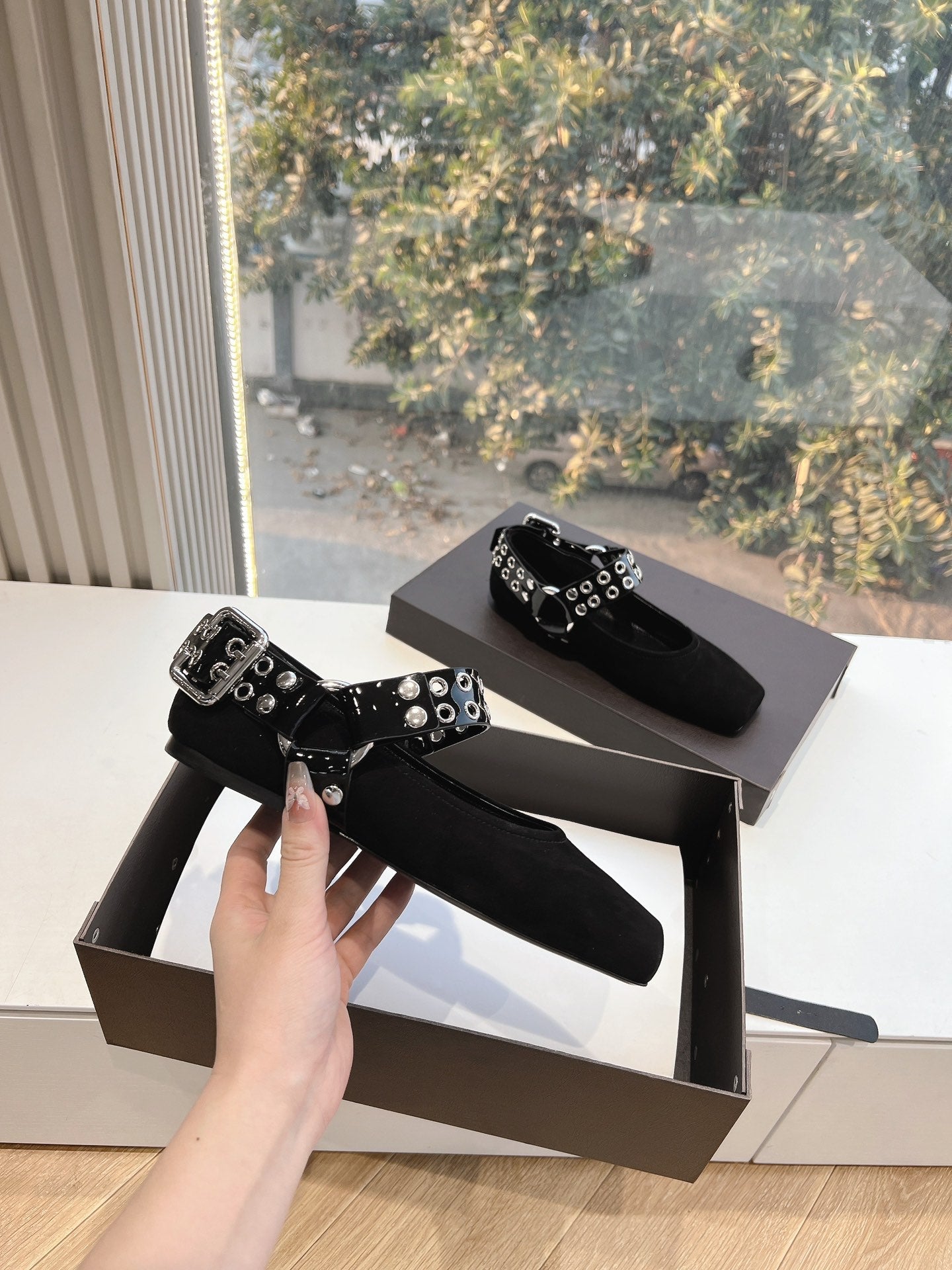ALAIA 26S FLATS IN BLACK SUEDE WITH SILVER STUD STRAP