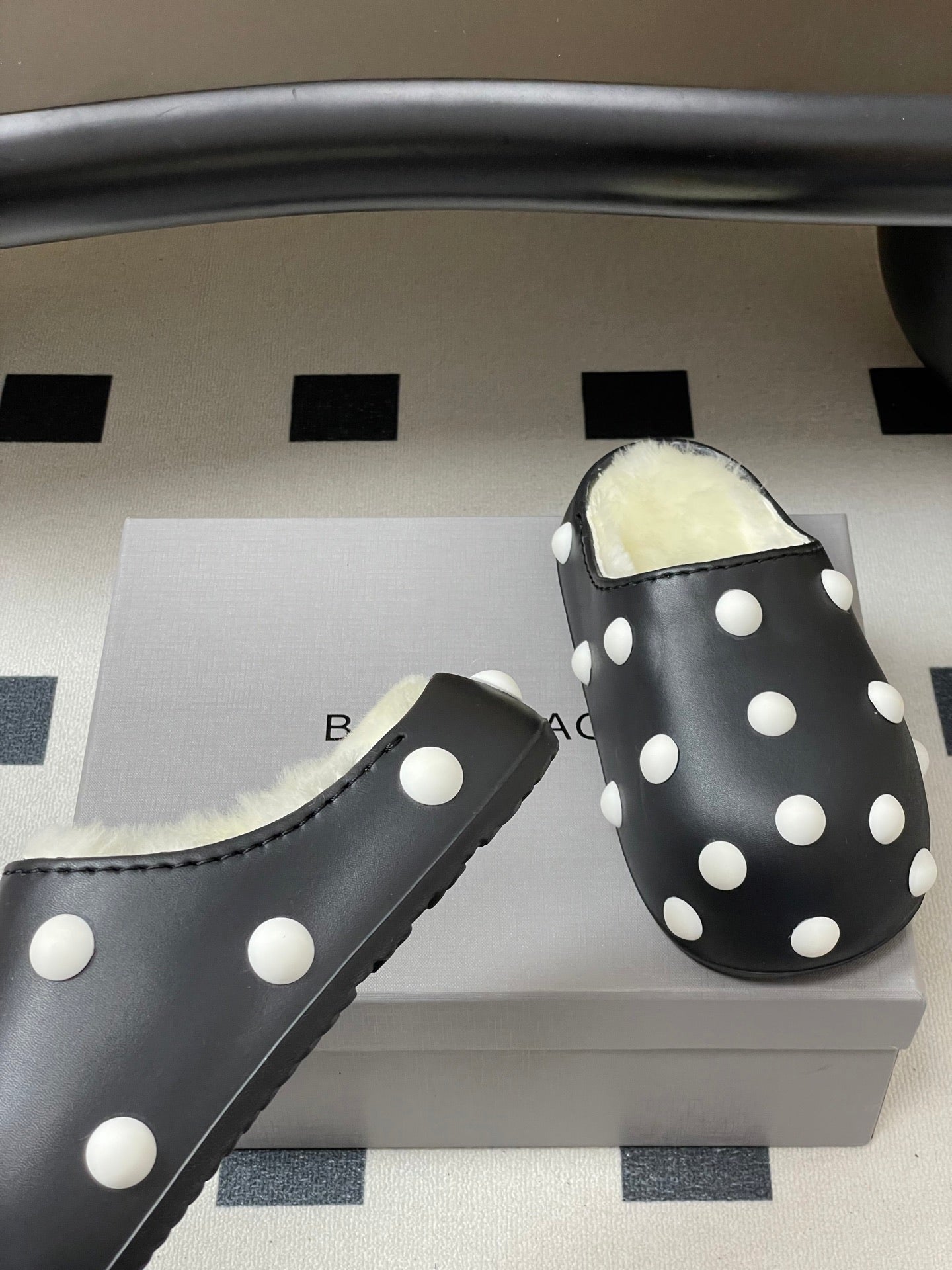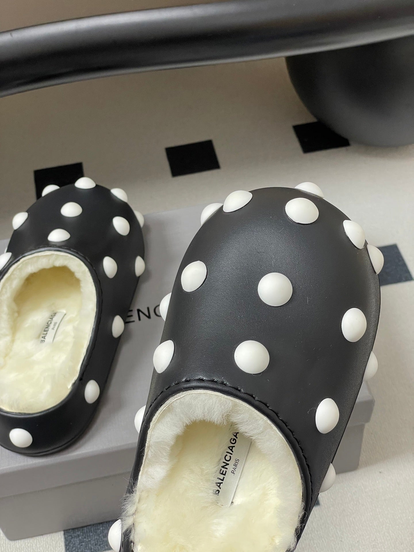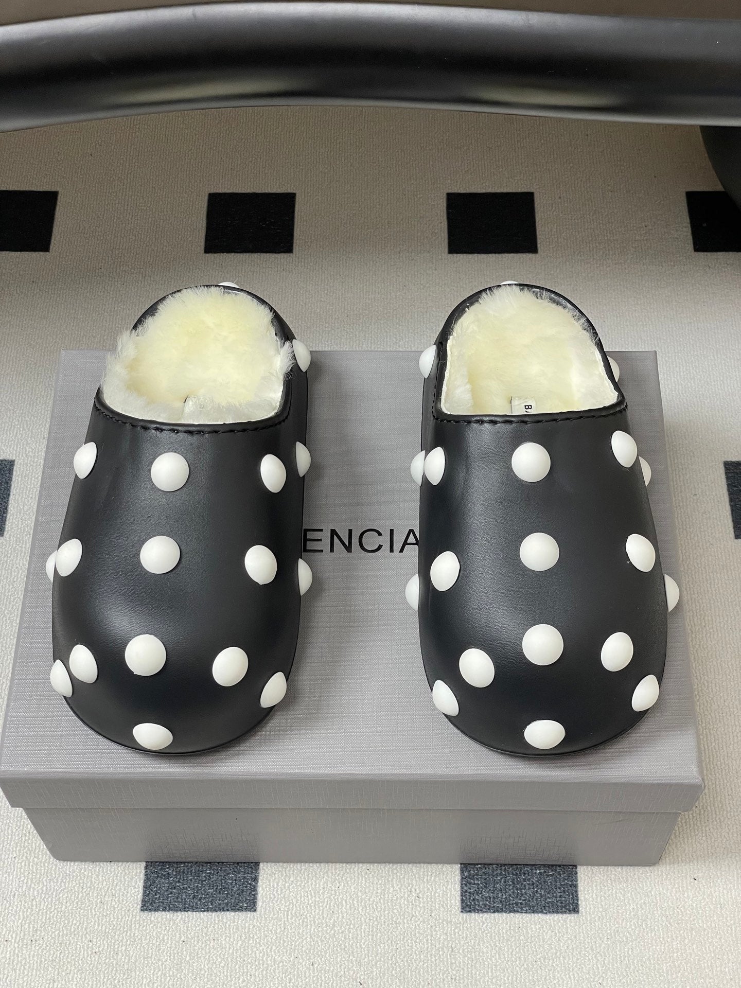 BALENCIAGA 25S FUR-LINED MULES IN BLACK AND WHITE FAUX LEATHER