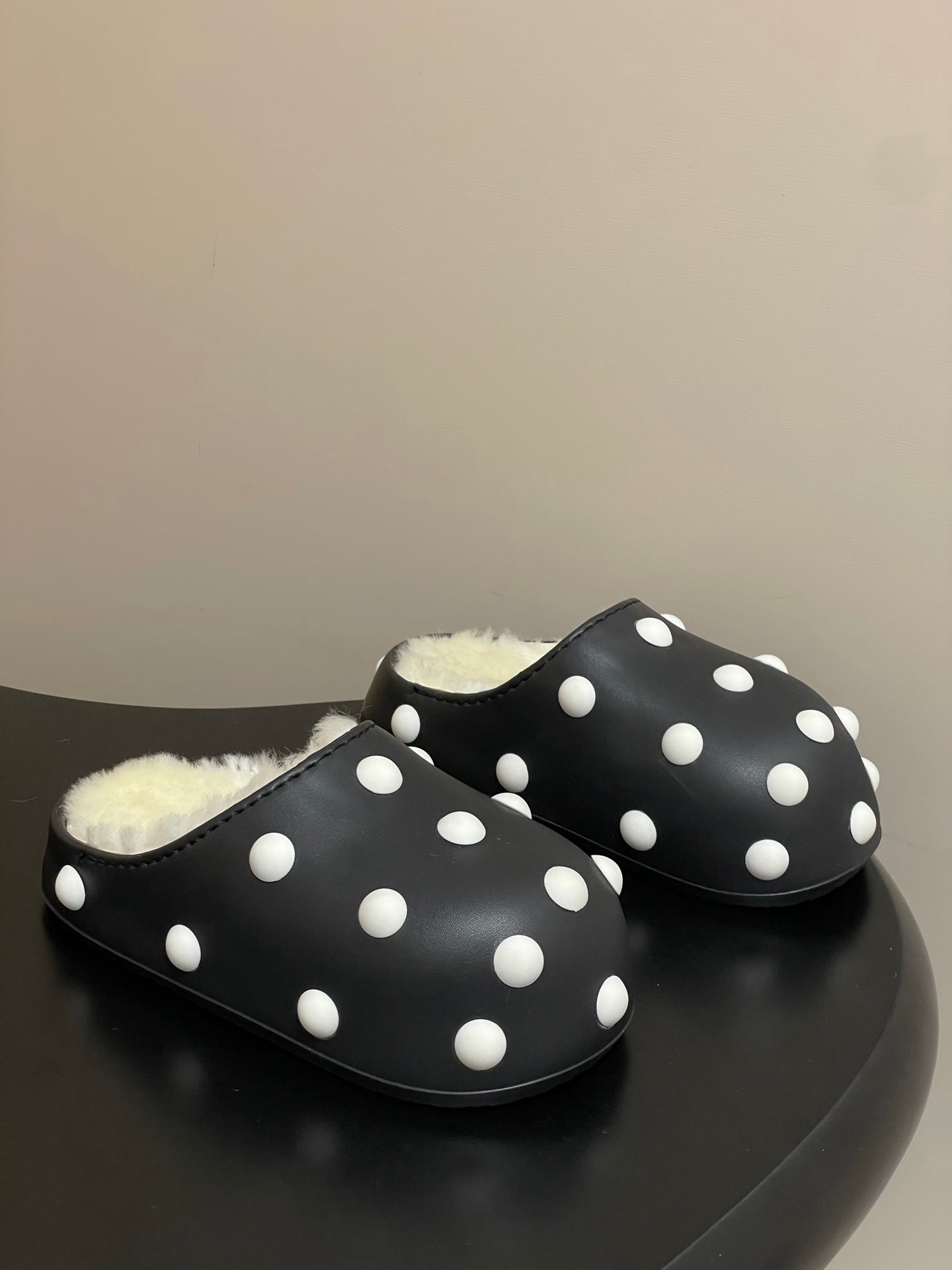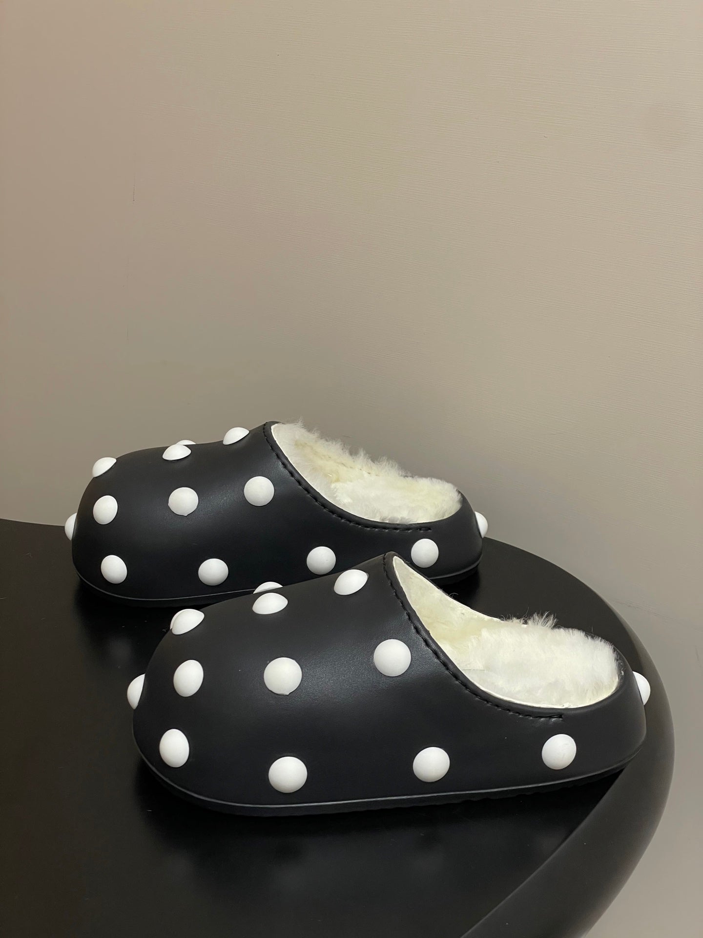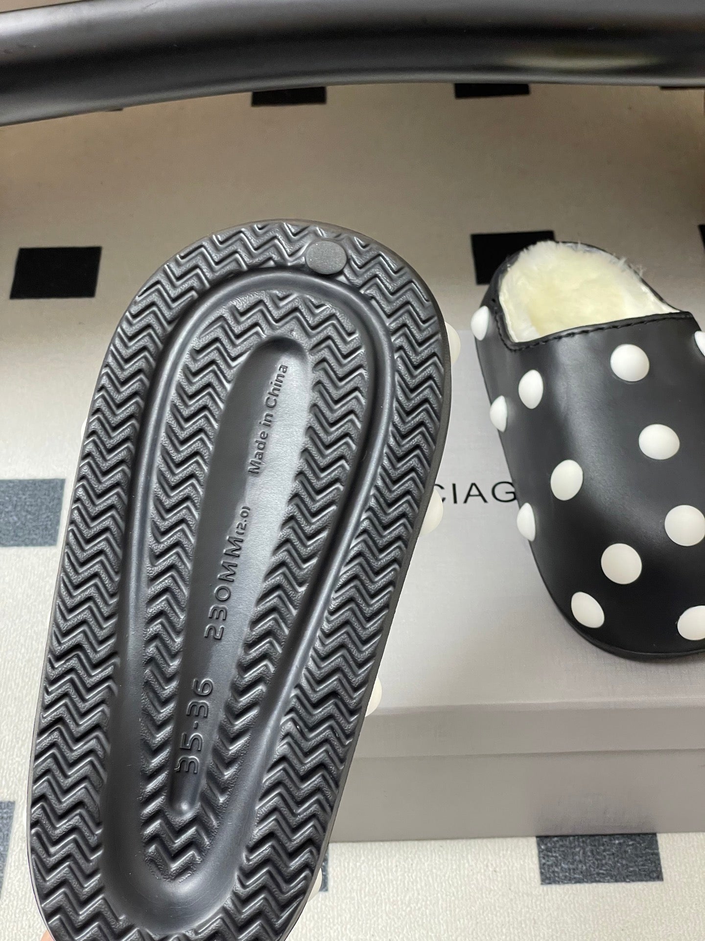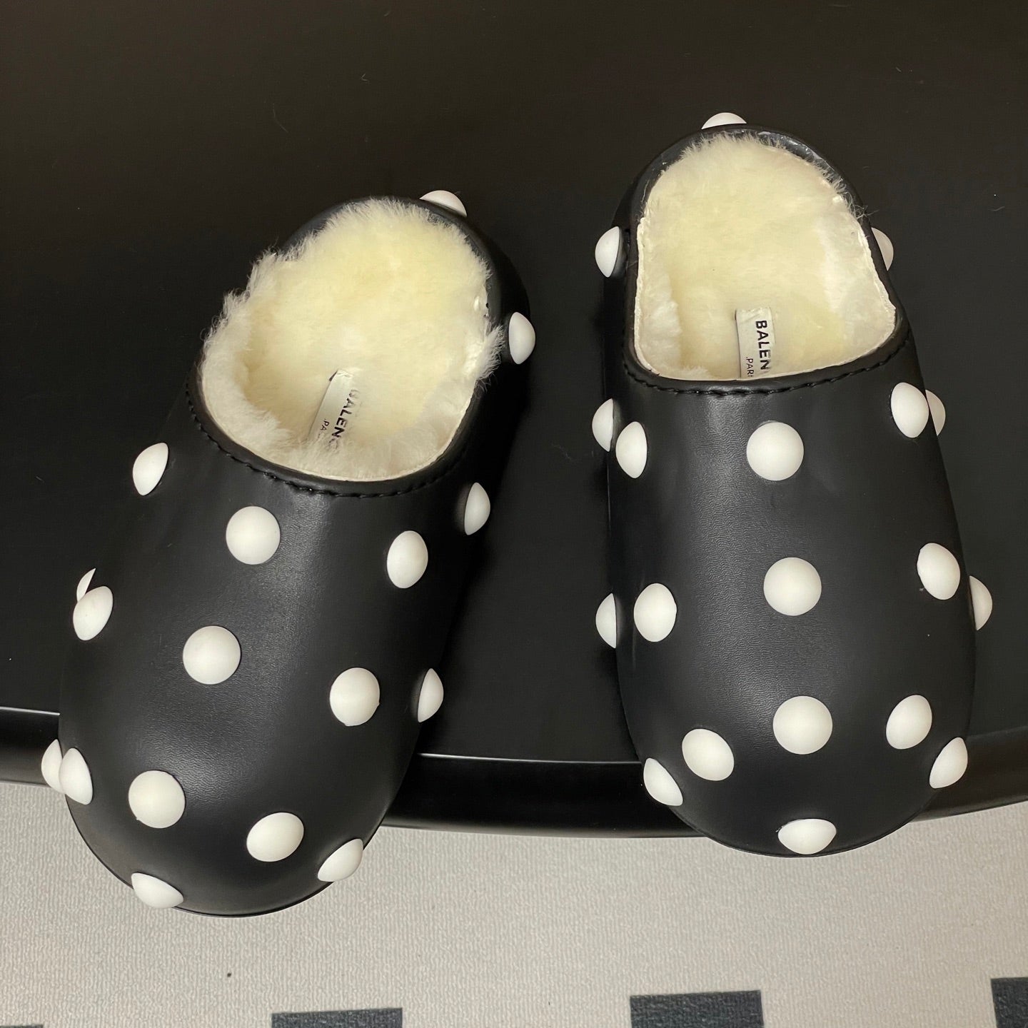 BALENCIAGA 25S FUR-LINED MULES IN BLACK AND WHITE FAUX LEATHER