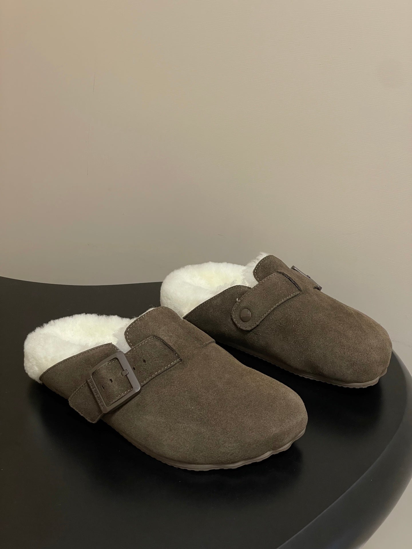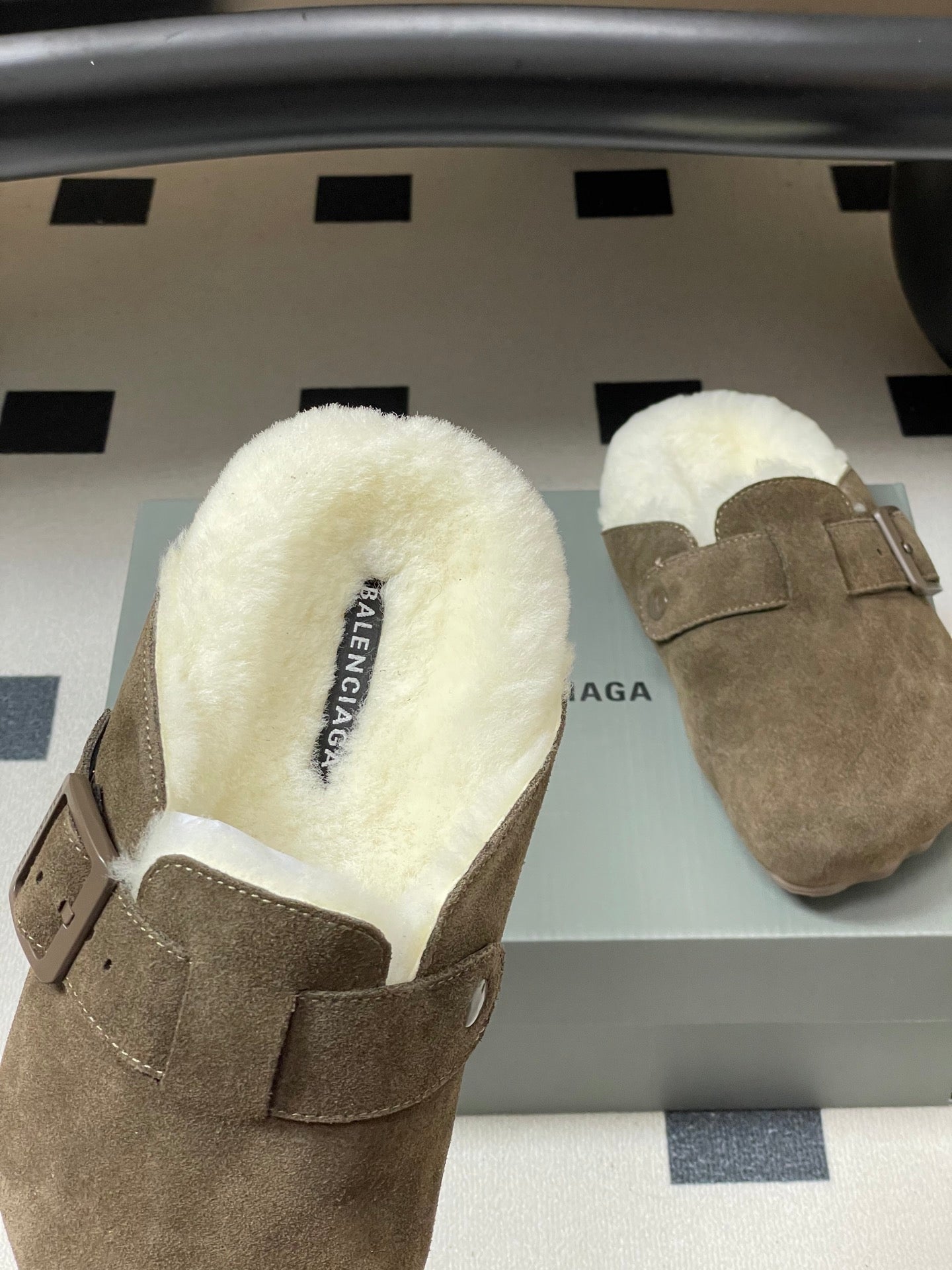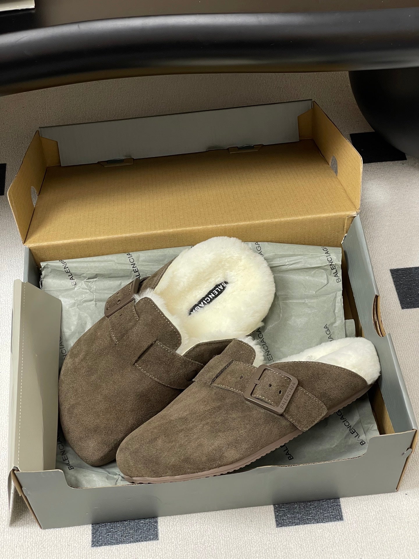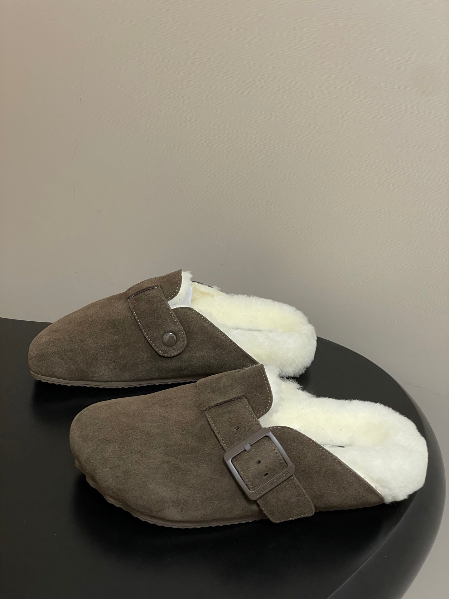 BALENCIAGA 25S FUR-LINED MULES IN DARK EARTH BROWN FAUX LEATHER