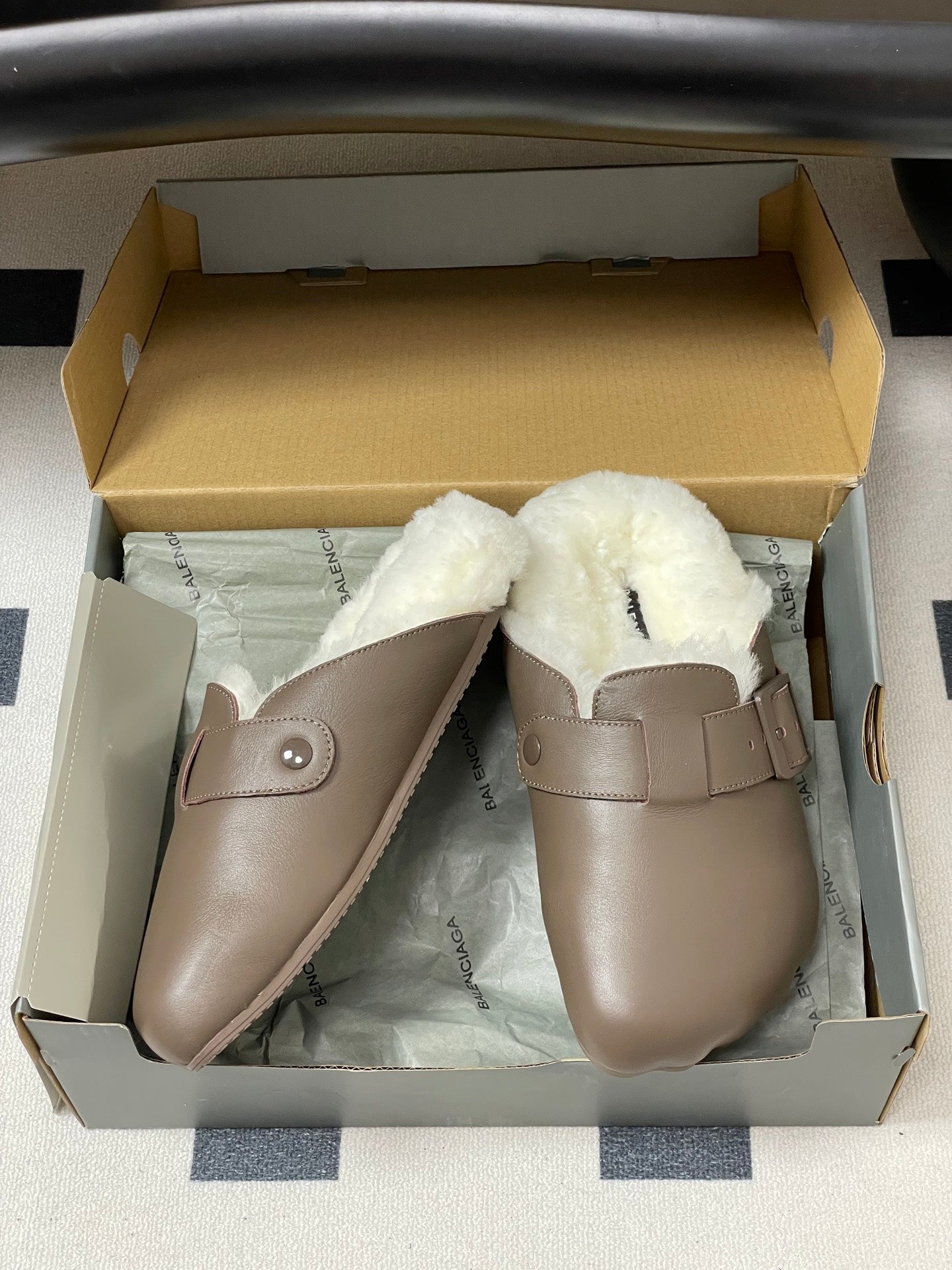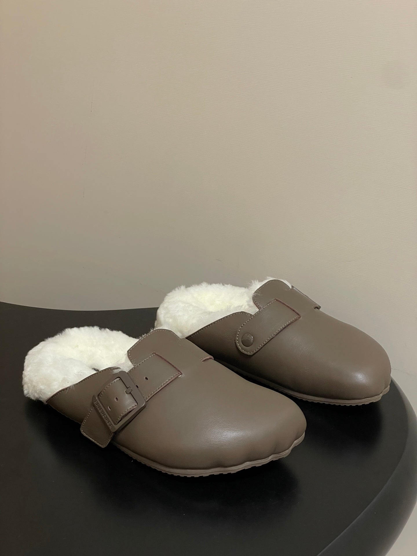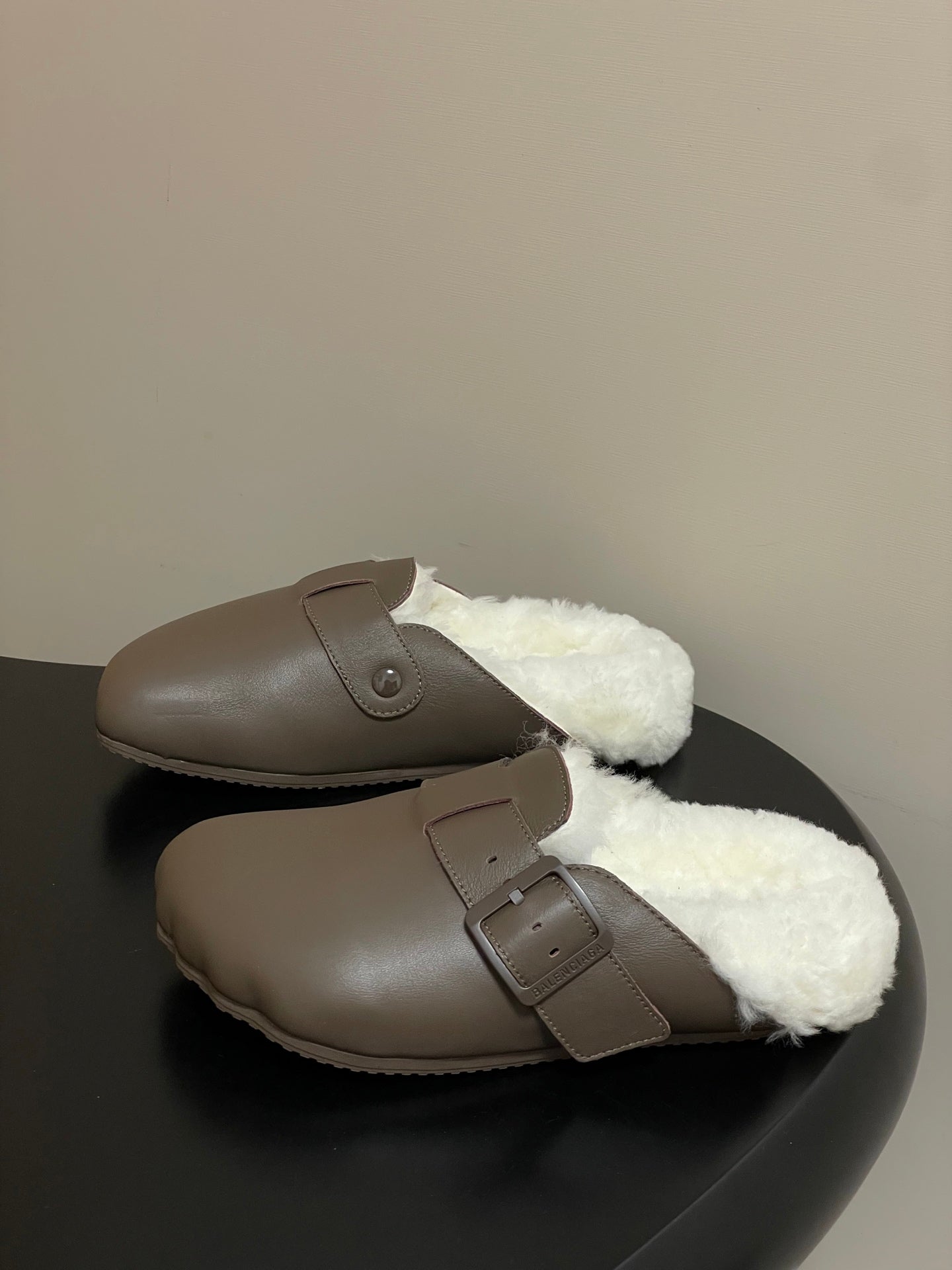 BALENCIAGA 25S FUR-LINED MULES IN TAUPE GRAY FAUX LEATHER