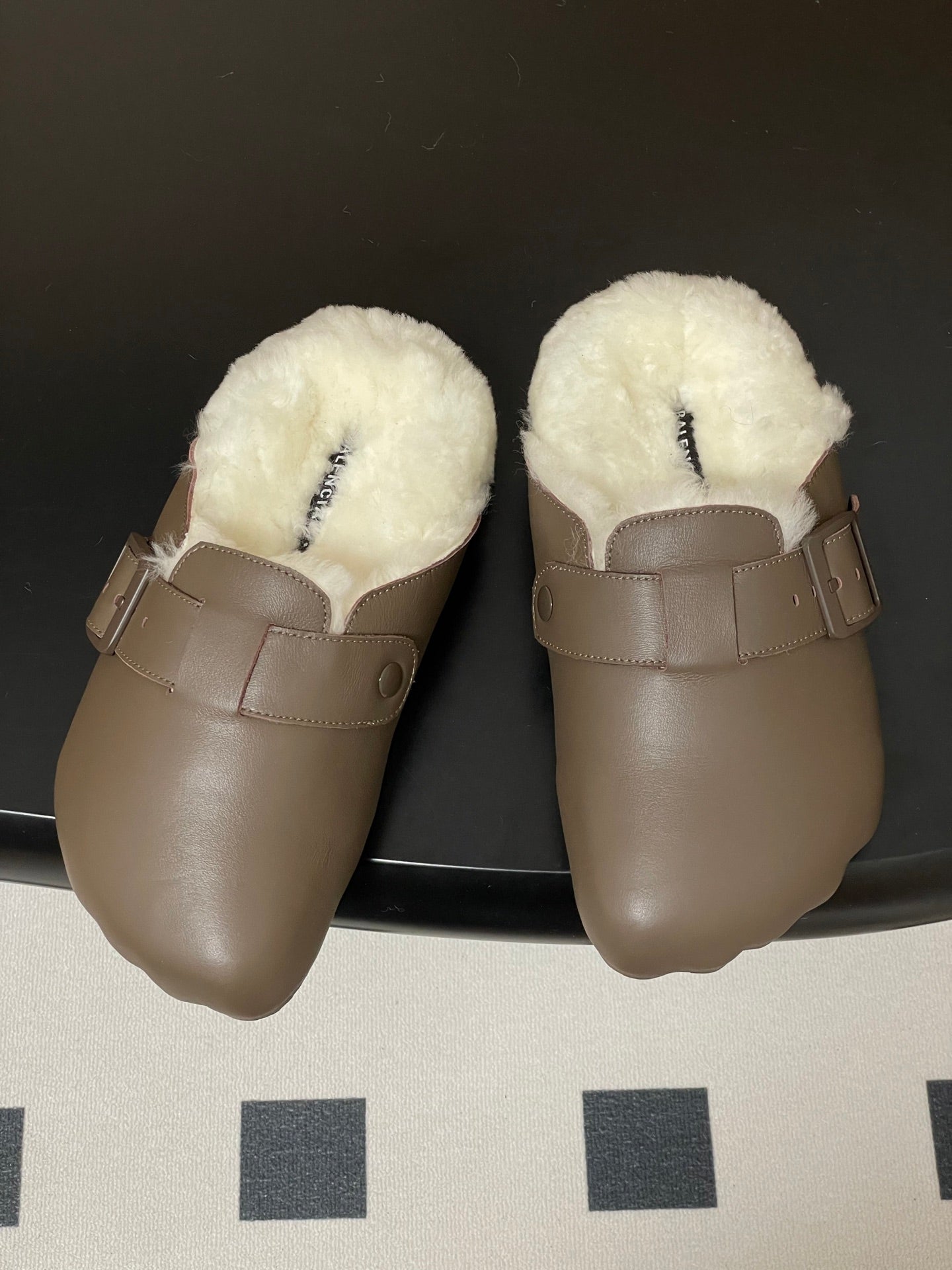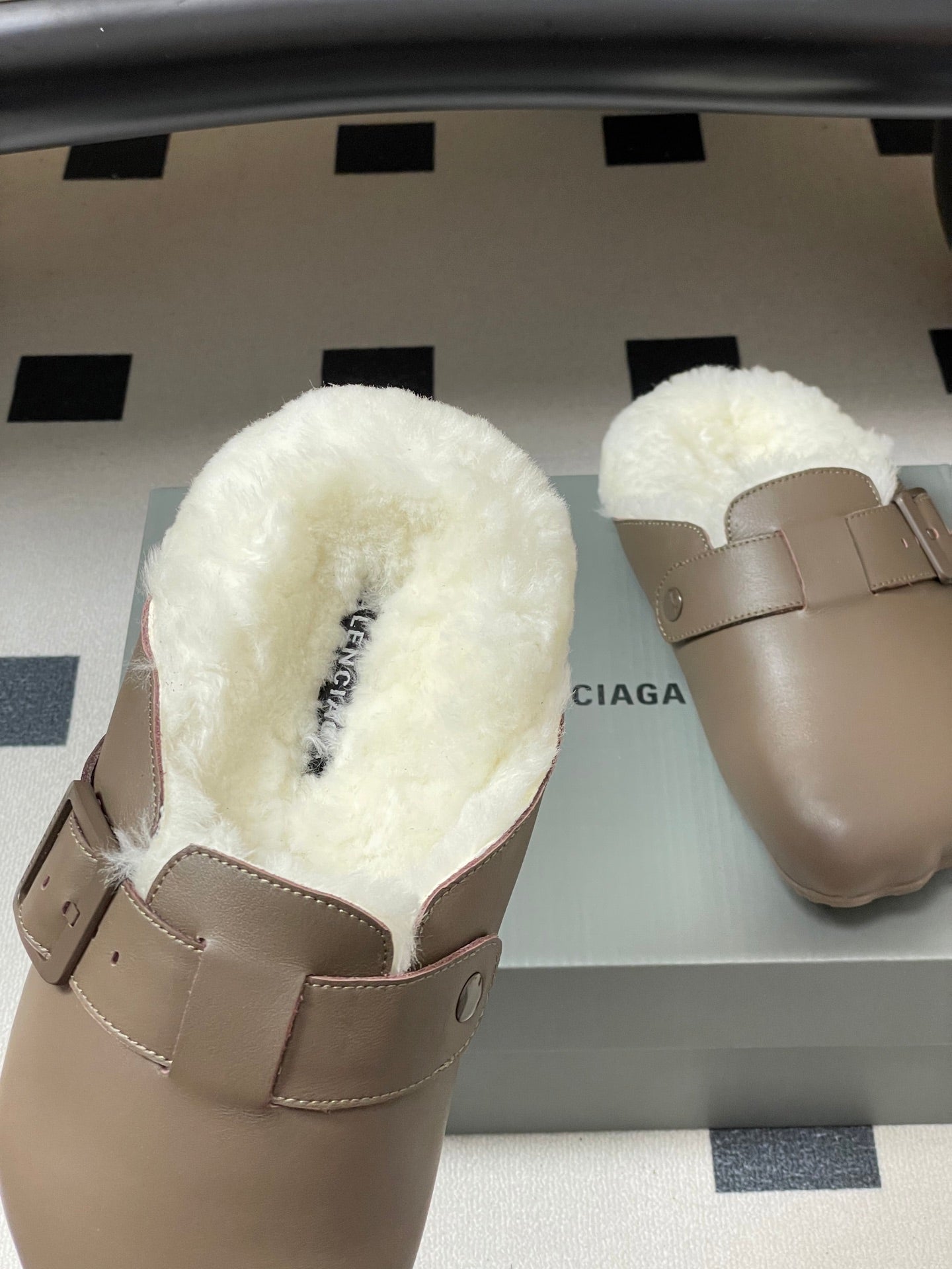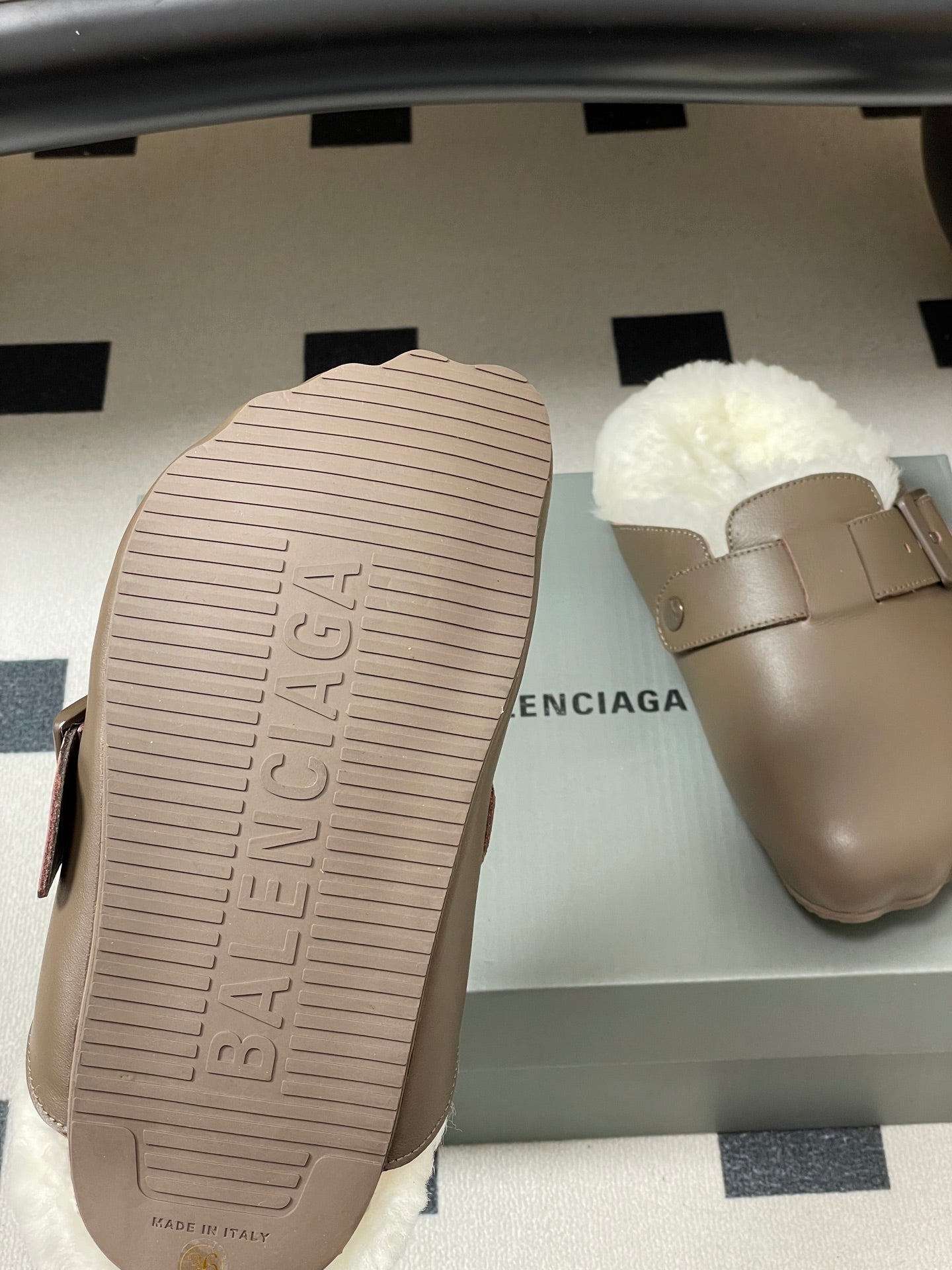 BALENCIAGA 25S FUR-LINED MULES IN TAUPE GRAY FAUX LEATHER