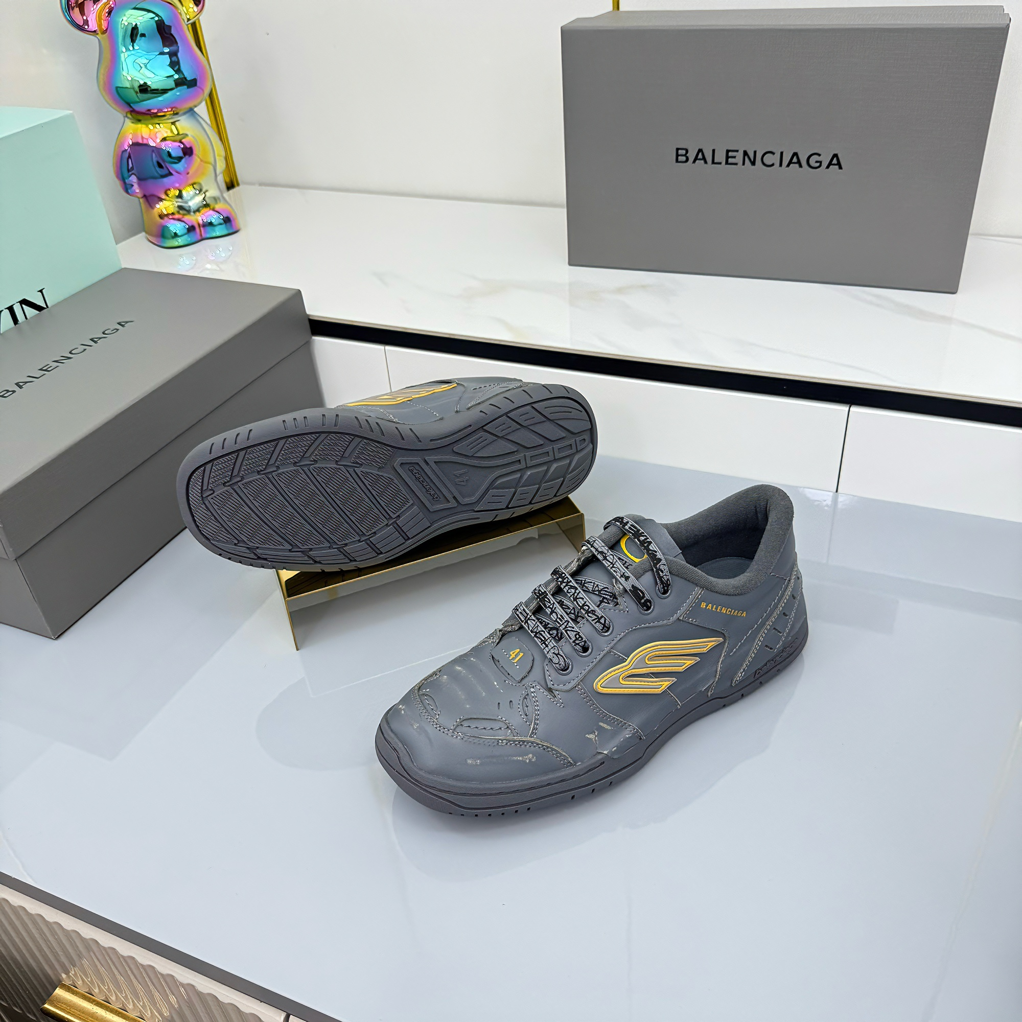 BALENCIAGA 25S SNEAKERS IN DARK GREY MIX YELLOW LEATHER
