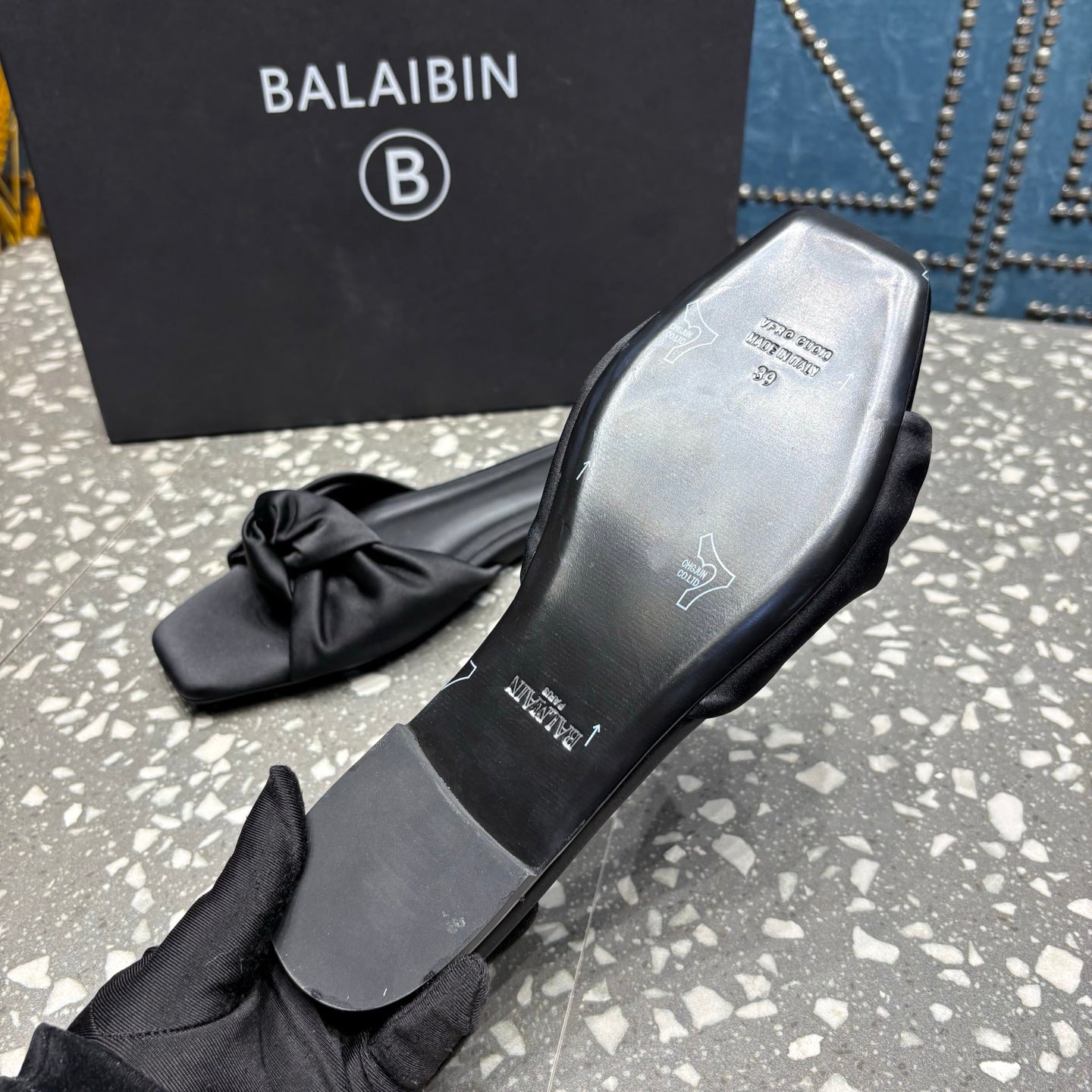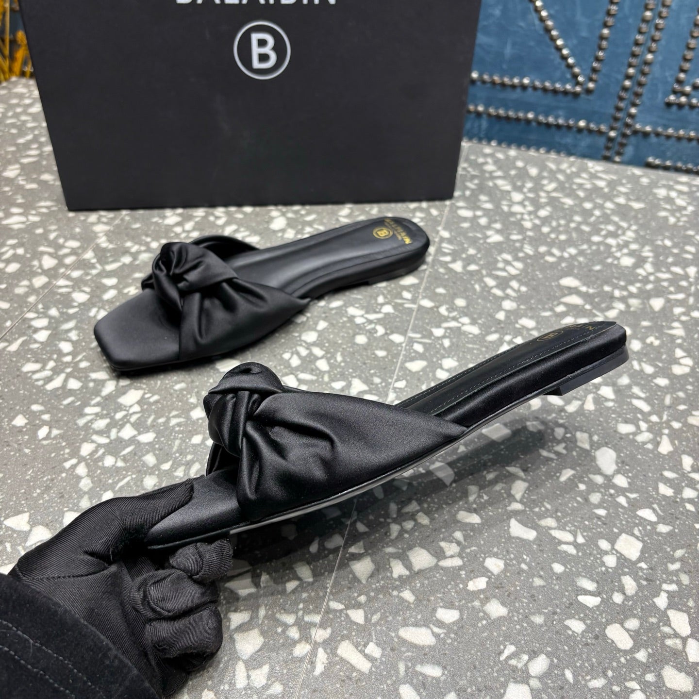 BALMAIN 26S SLIDES IN BLACK SATIN