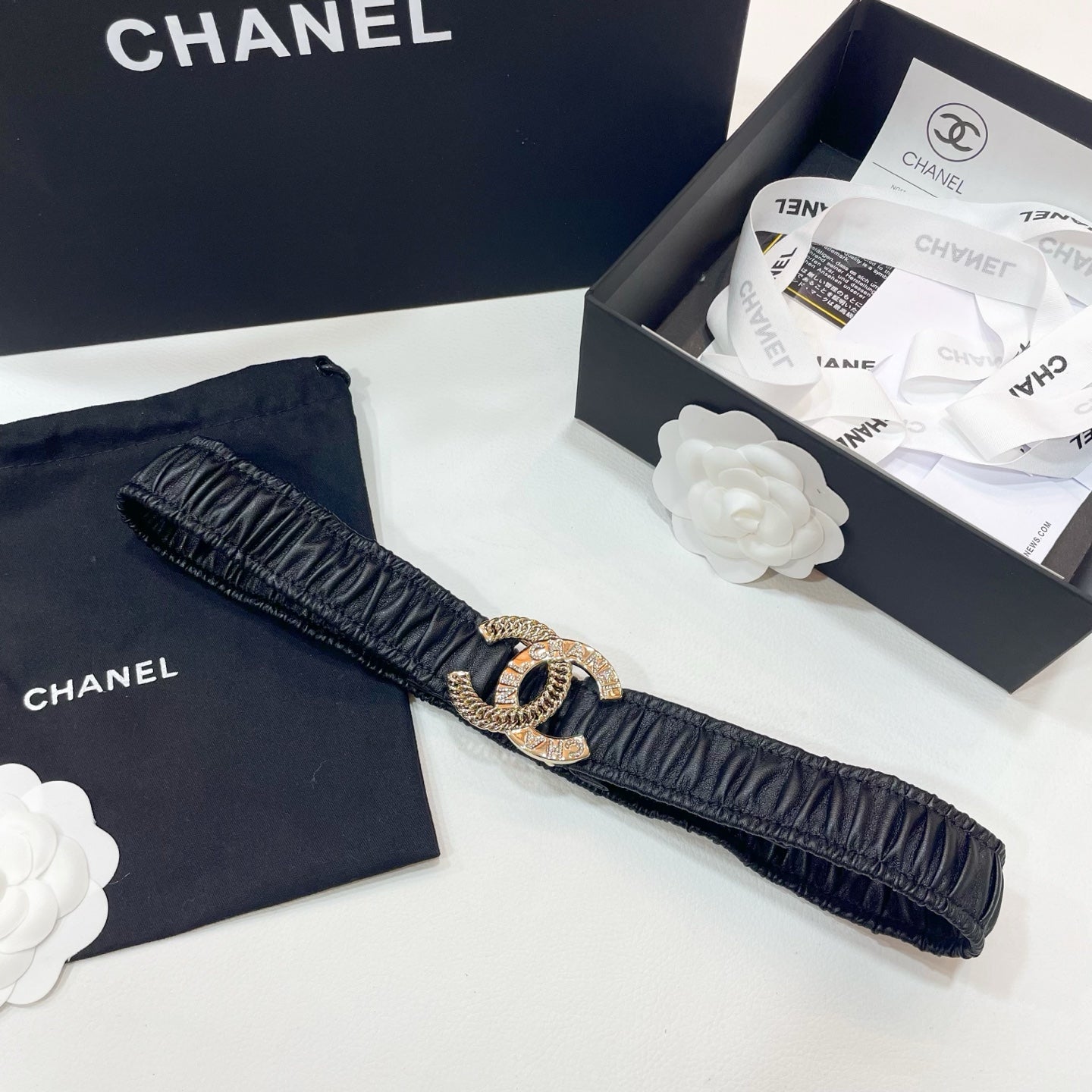 DOUBLE C ELASTIC BELT 30MM IN BLACK CALFSKIN GOLD CRYSTAL EMBELLISHED BUCKLE