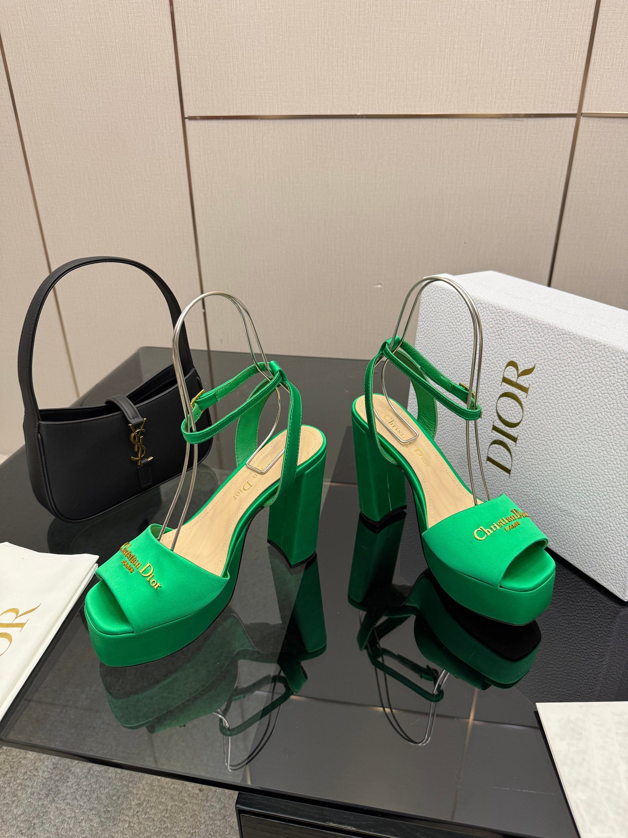 DIOR 26S HIGH HEEL SANDALS 120 MM IN GREEN SATIN