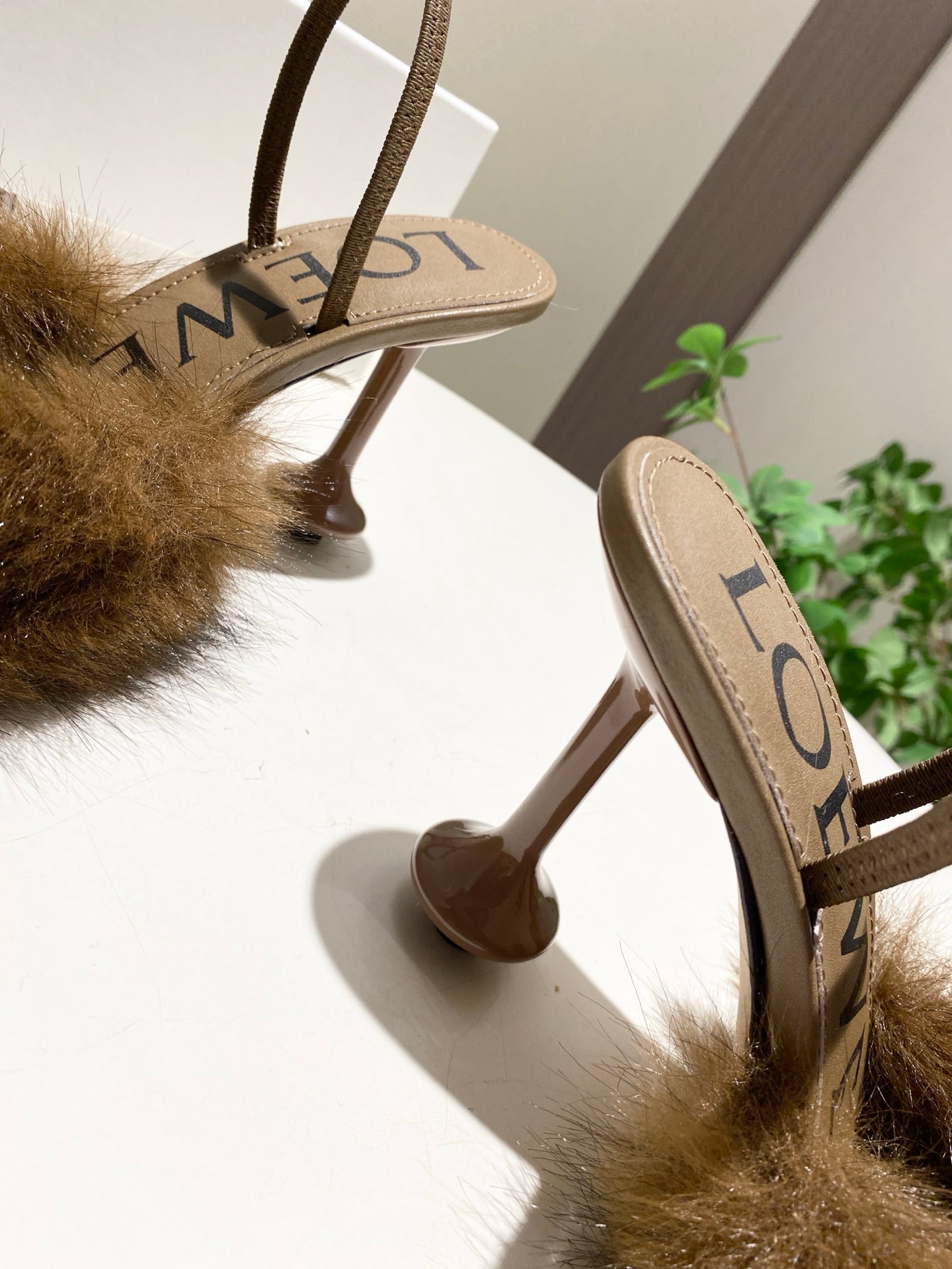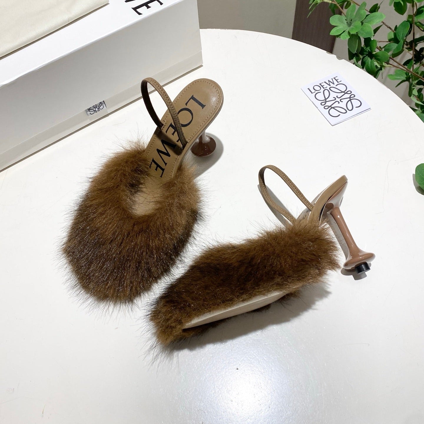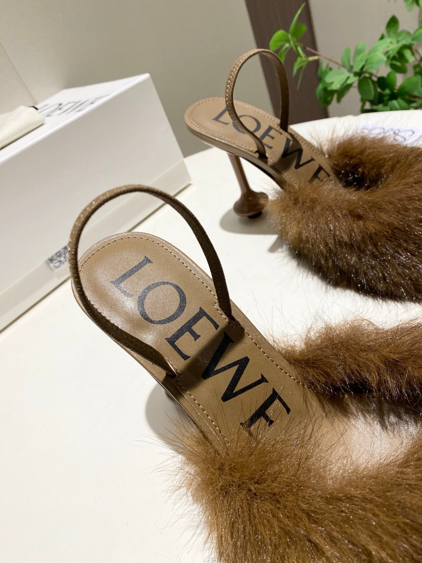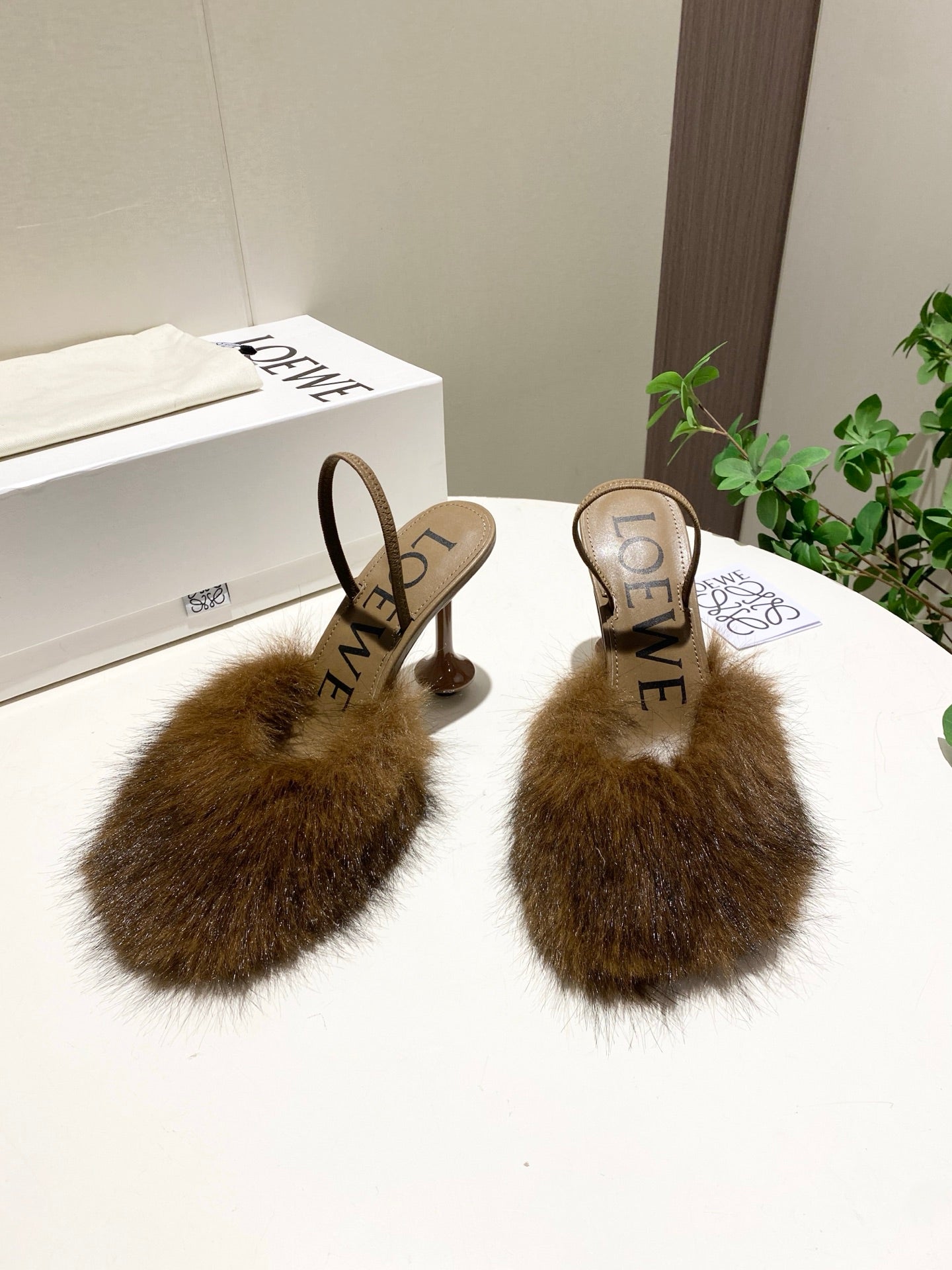 LOEWE 26S OPEN-BACK HIGH HEELS 100MM IN DARK BROWN CALFSKIN WITH FUR