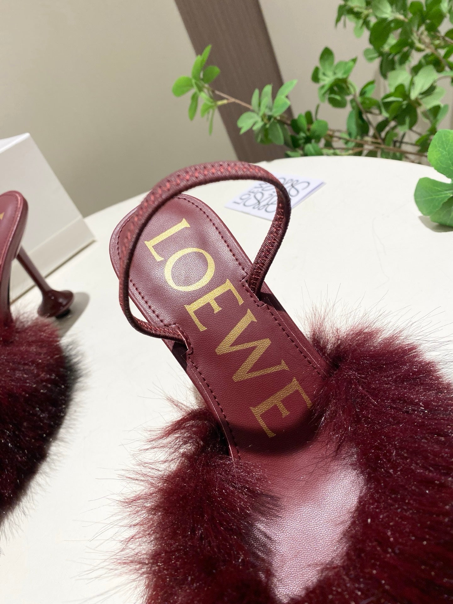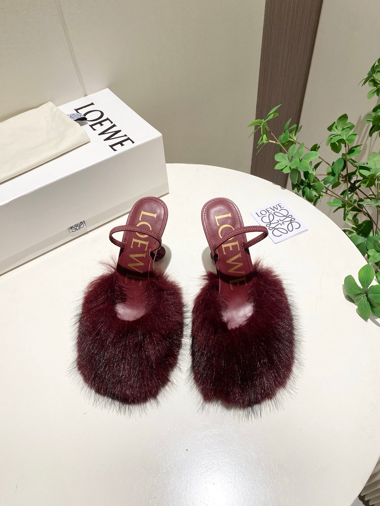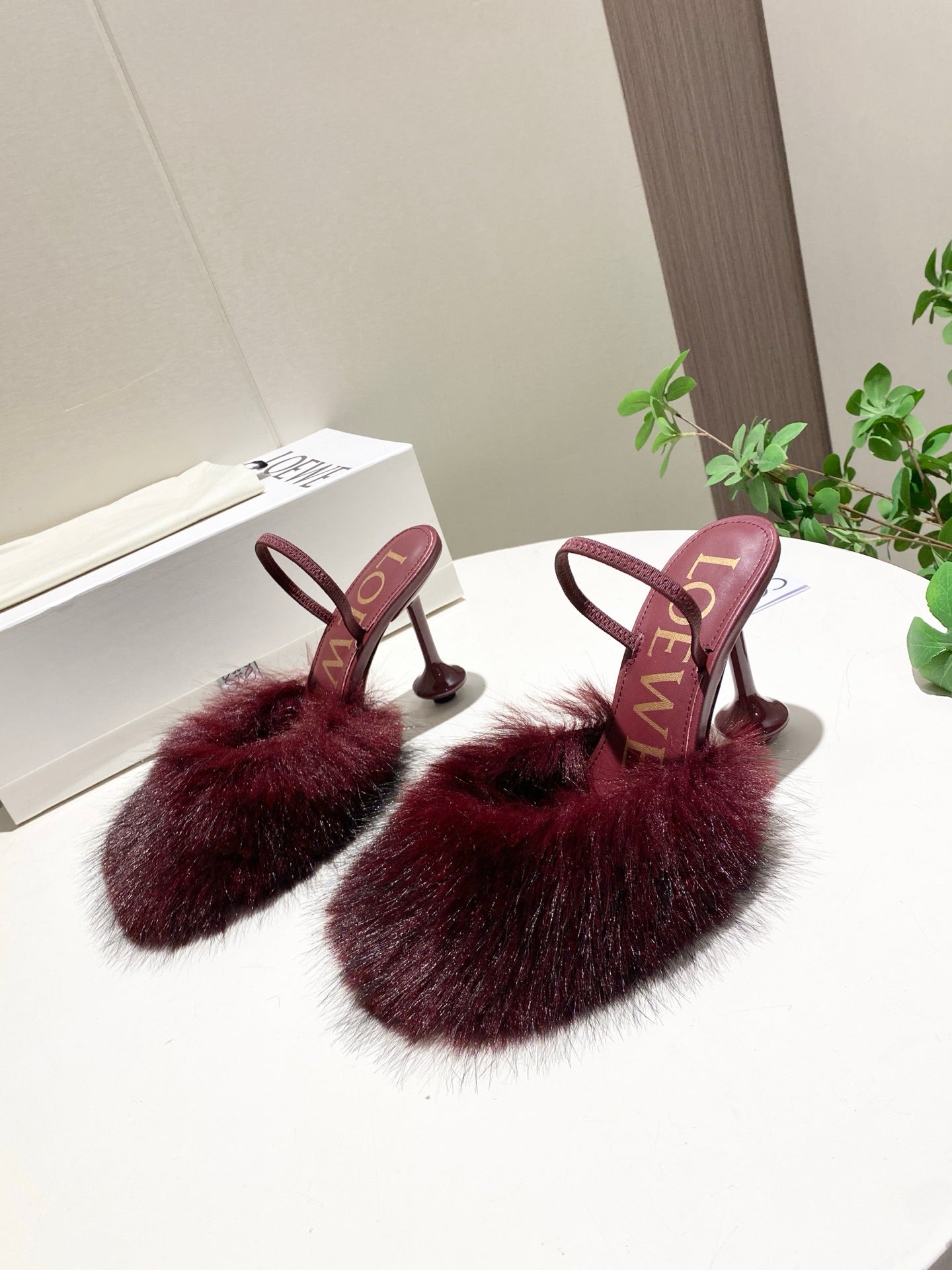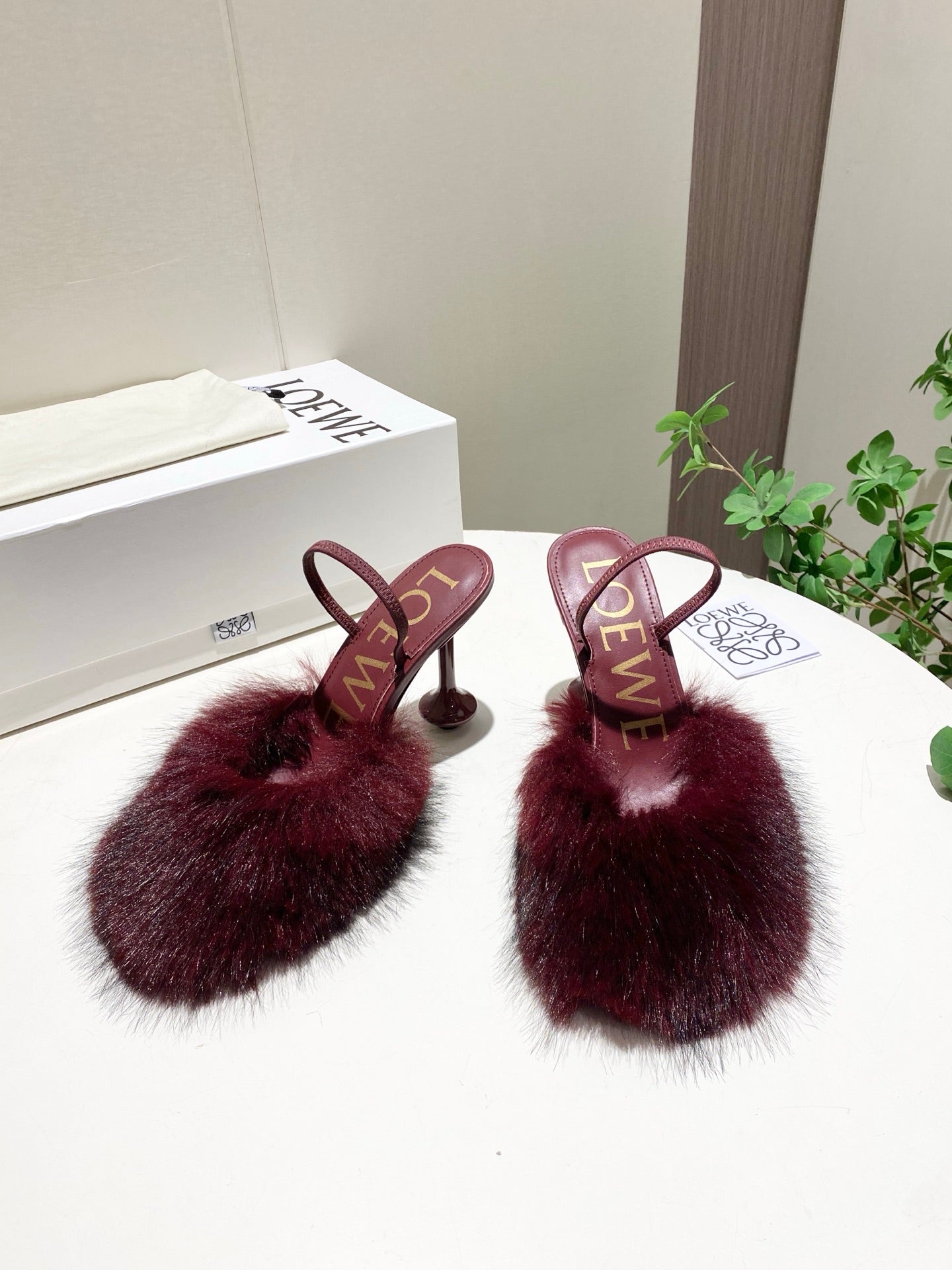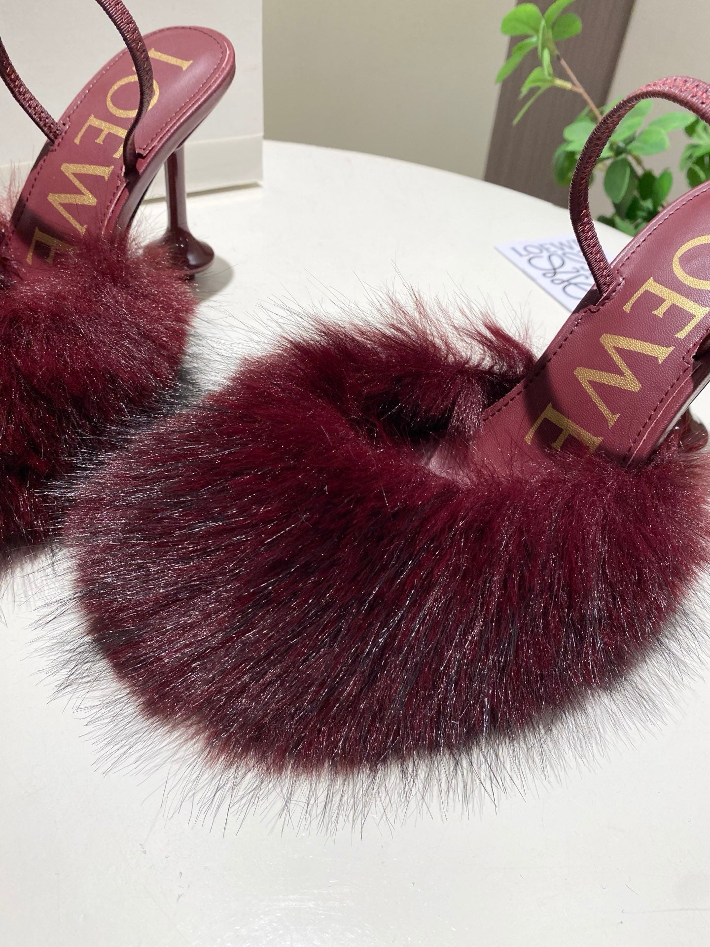 LOEWE 26S OPEN-BACK HIGH HEELS 100MM IN WINE RED CALFSKIN WITH FUR