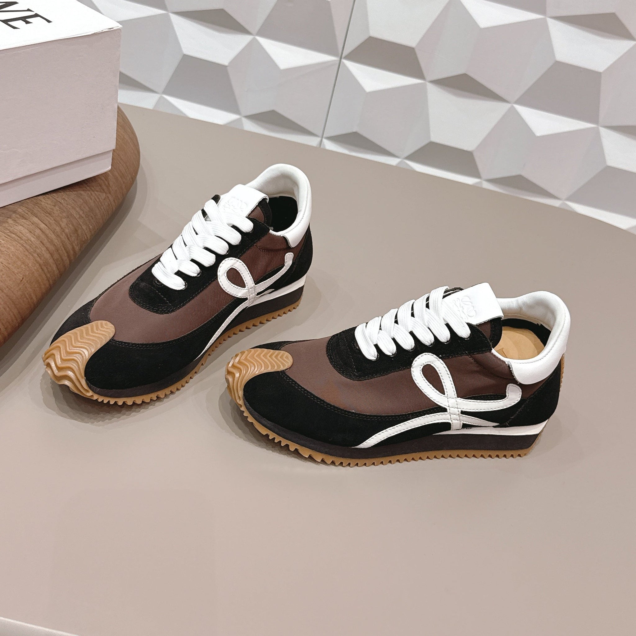 LOEWE 26S FLOW RUNNER SNEAKER IN BLACK AND DARK BROWN SUEDE AND WHITE CALFSKIN
