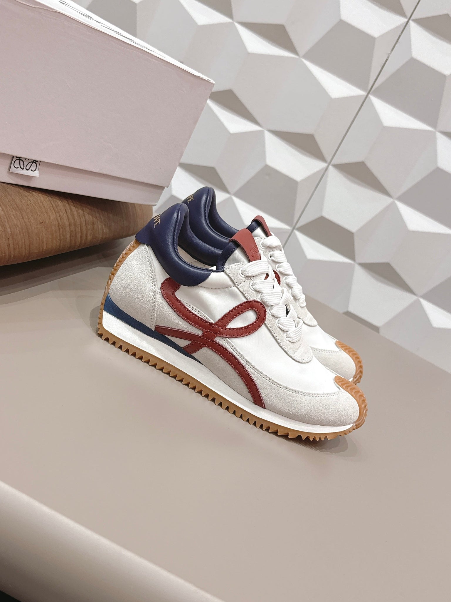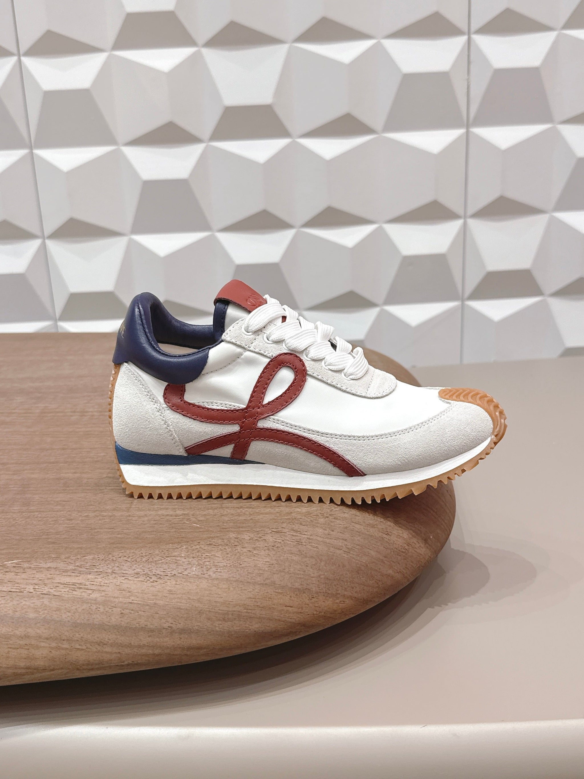 LOEWE 26S FLOW RUNNER SNEAKER IN LIGHT GRAY SUEDE AND NAVY BLUE AND RED CALFSKIN