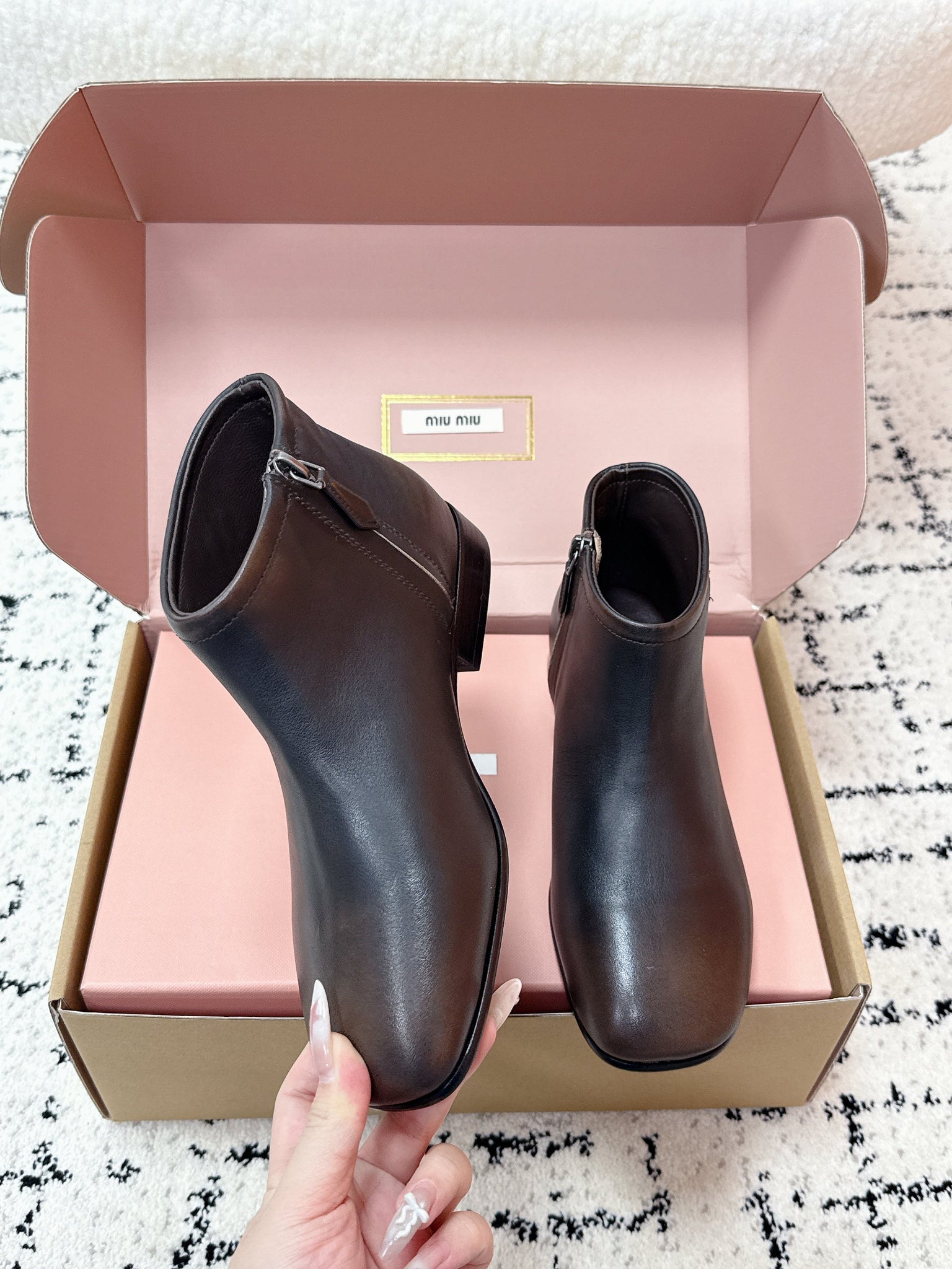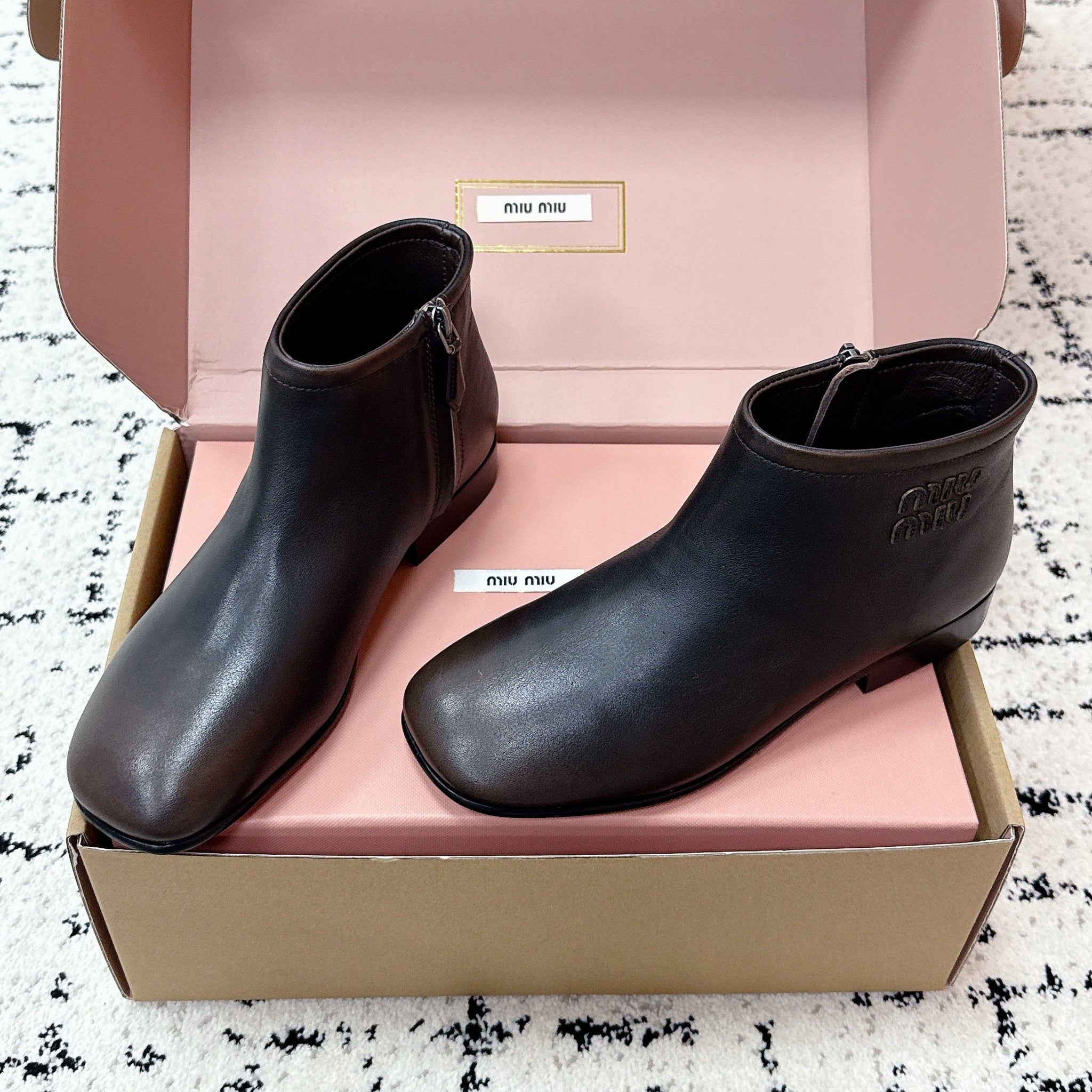 MIUMIU 26S BOOTIES IN DARK BROWN FUME CALFSKIN