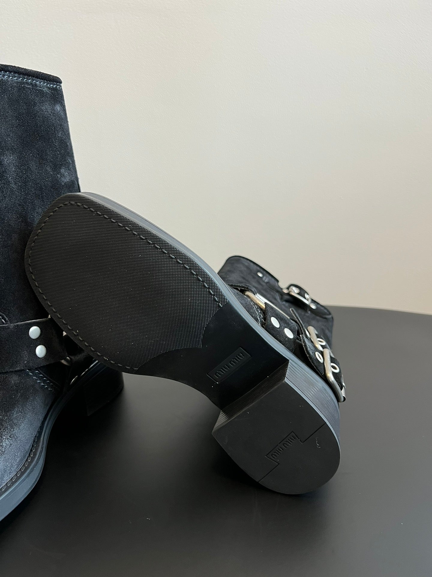 MIUMIU 26S MID-CALF BOOTS IN BLACK SUEDE SILVER HARDWARE