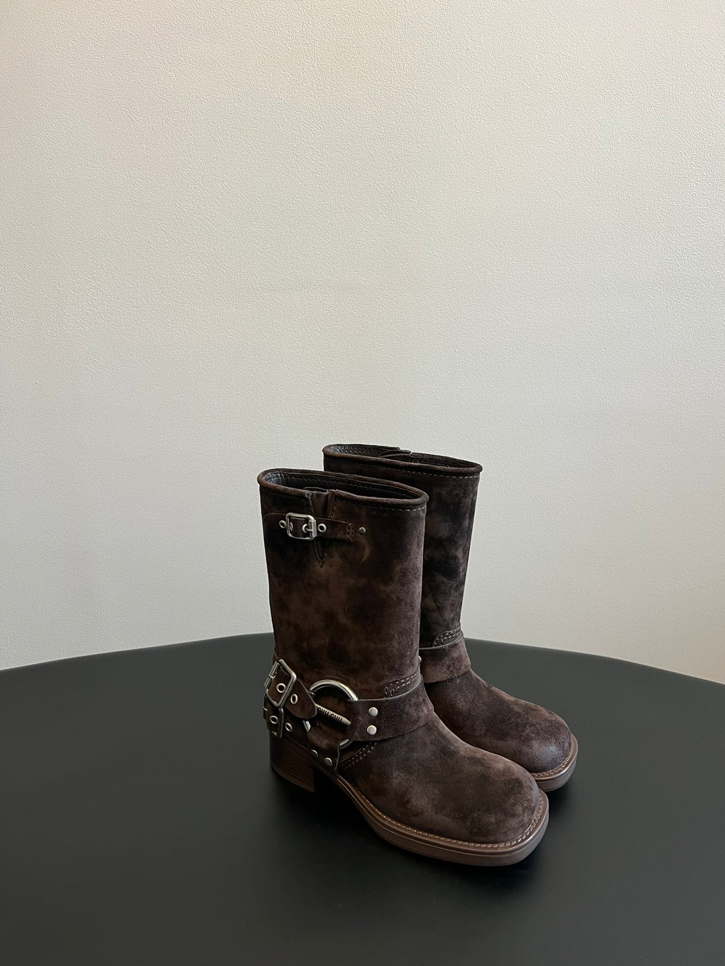 MIUMIU 26S MID-CALF BOOTS IN DARK BROWN SUEDE SILVER HARDWARE