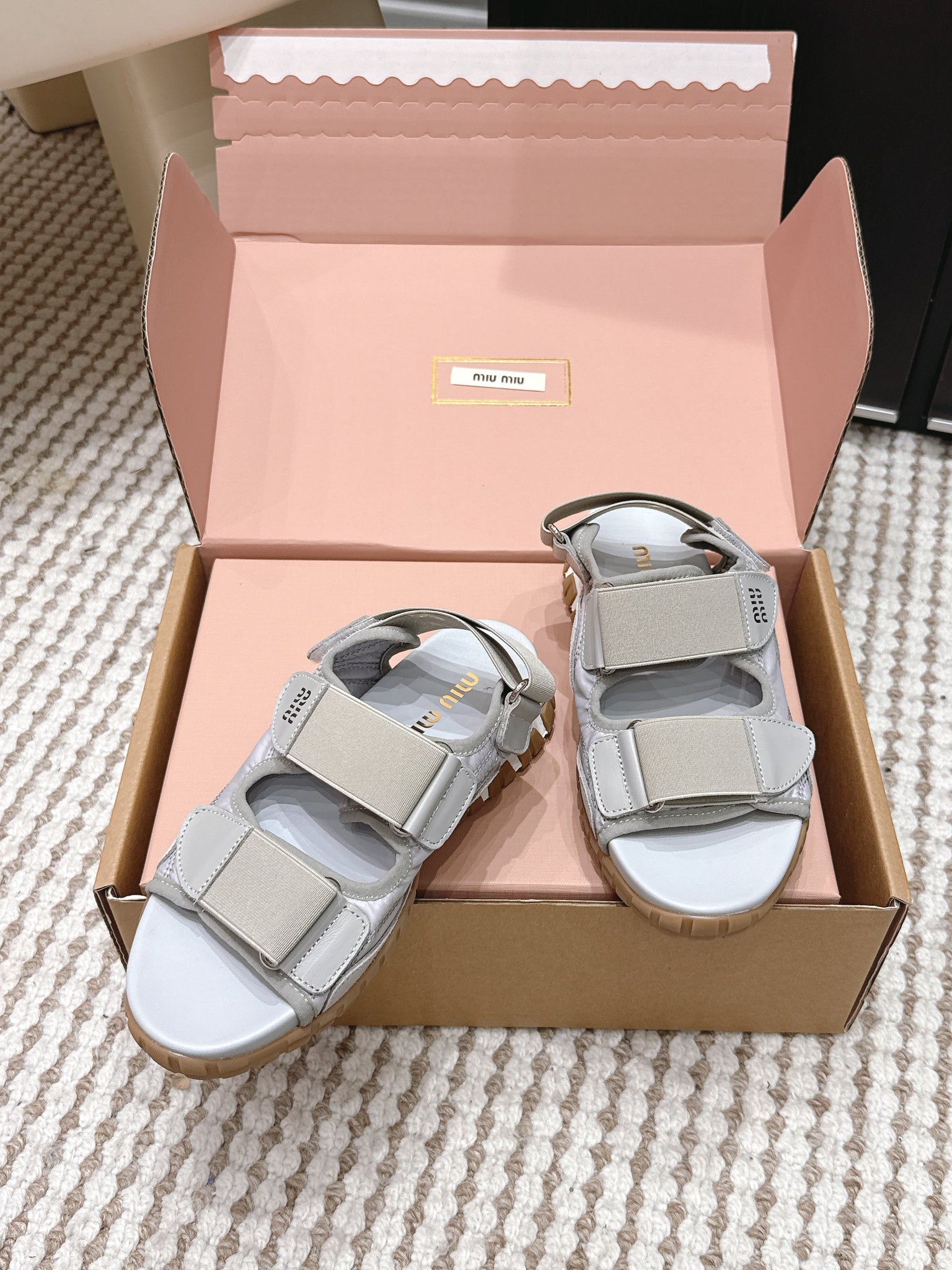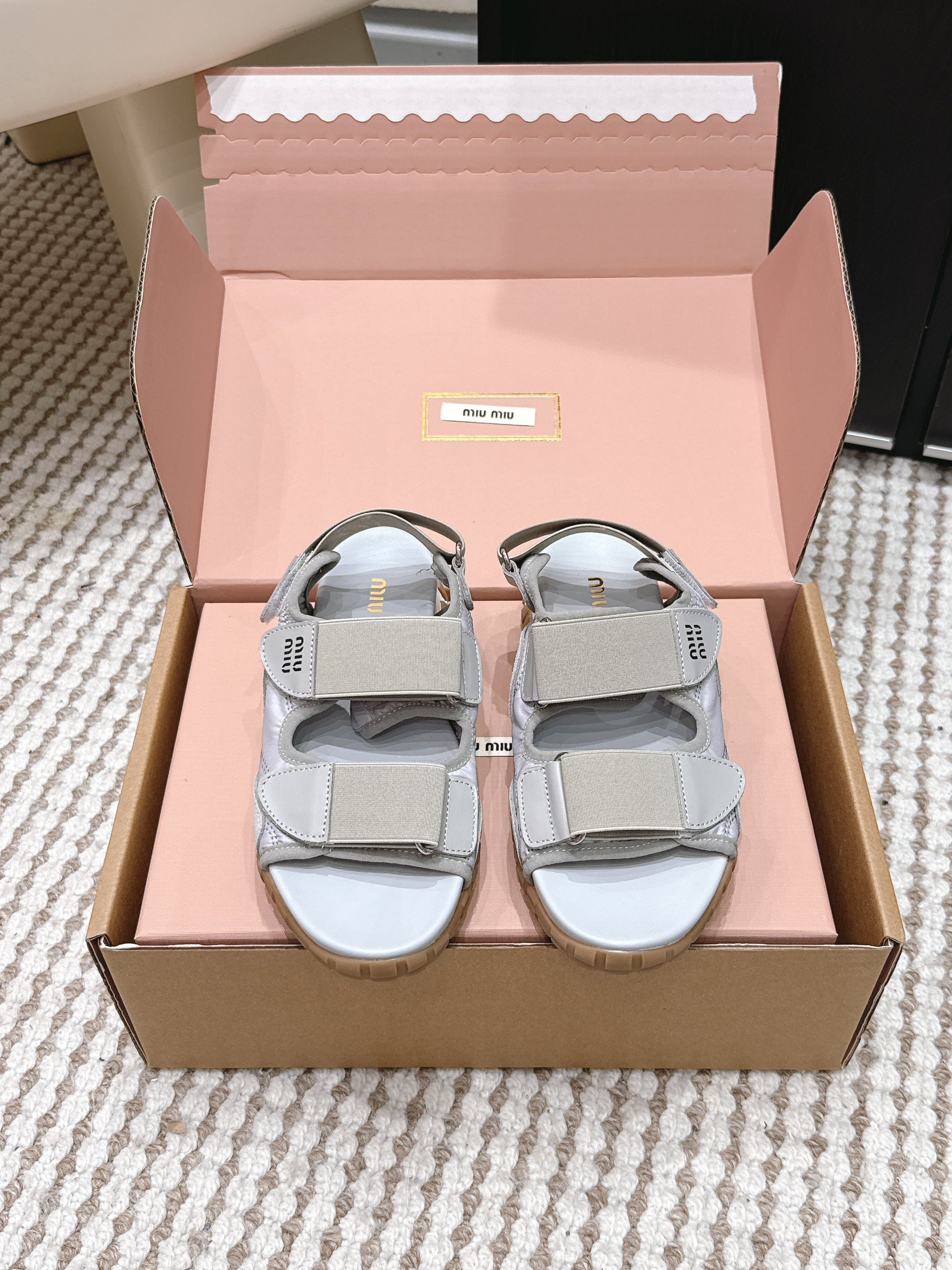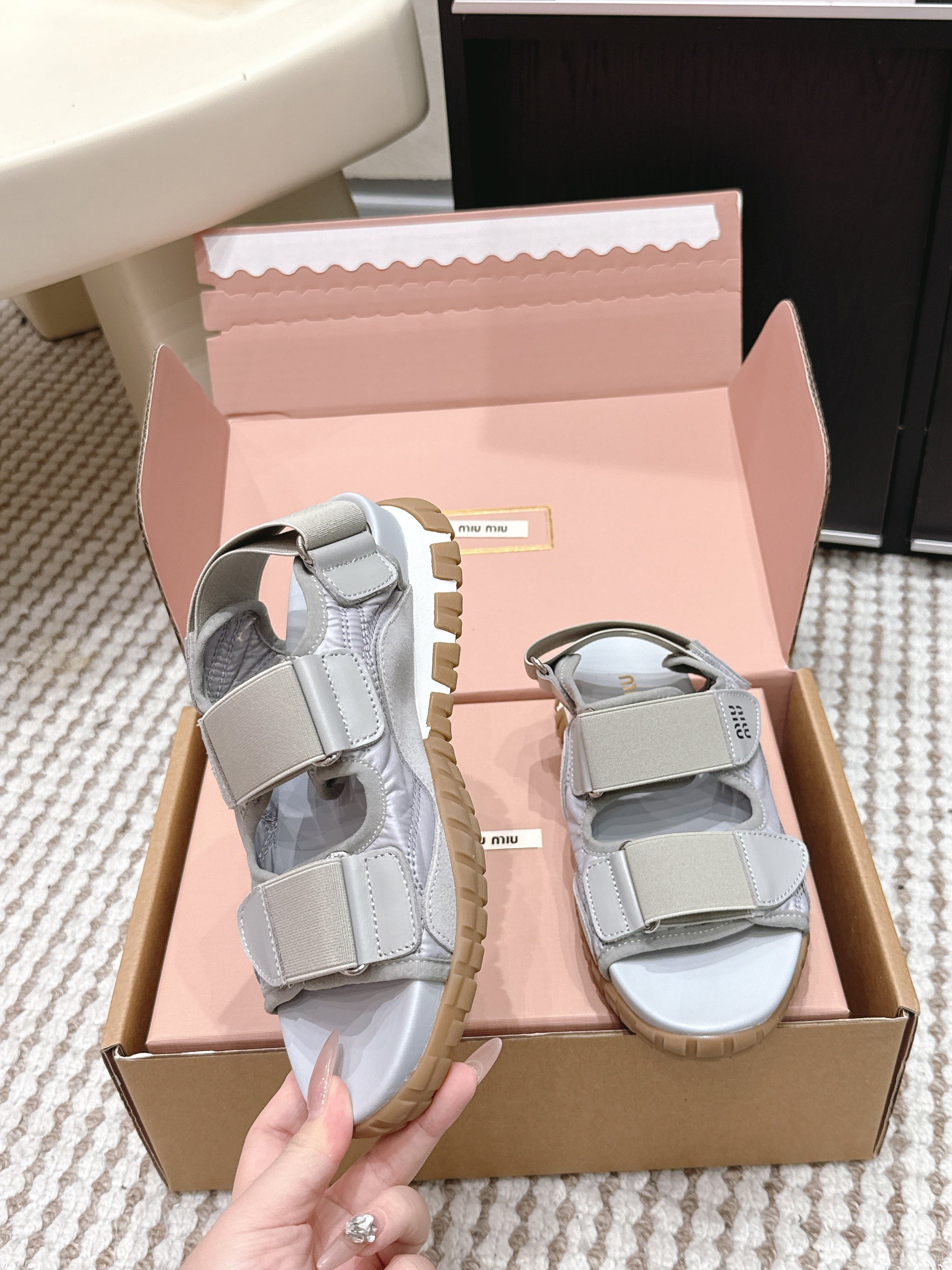 MIUMIU 26S VELCRO SANDALS IN GRAY CALFSKIN AND NYLON SILVER HARDWARE
