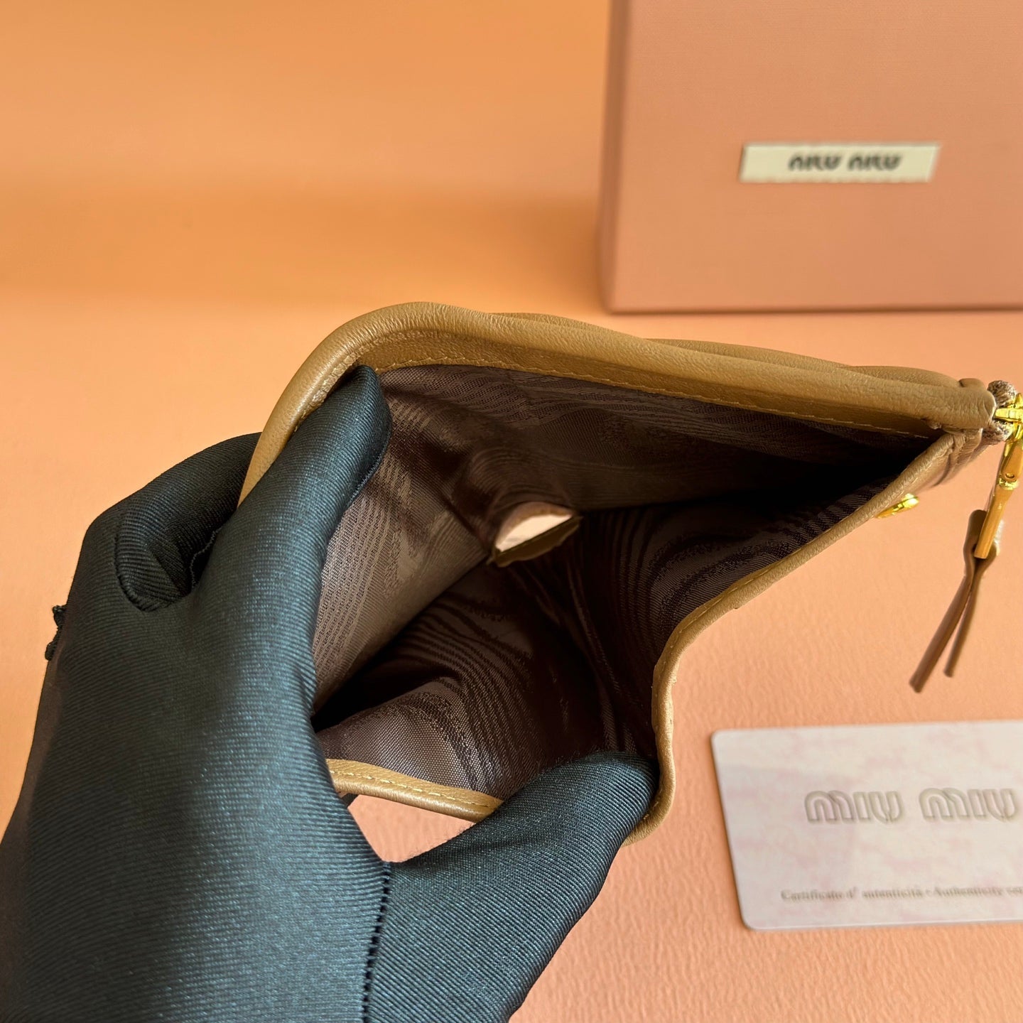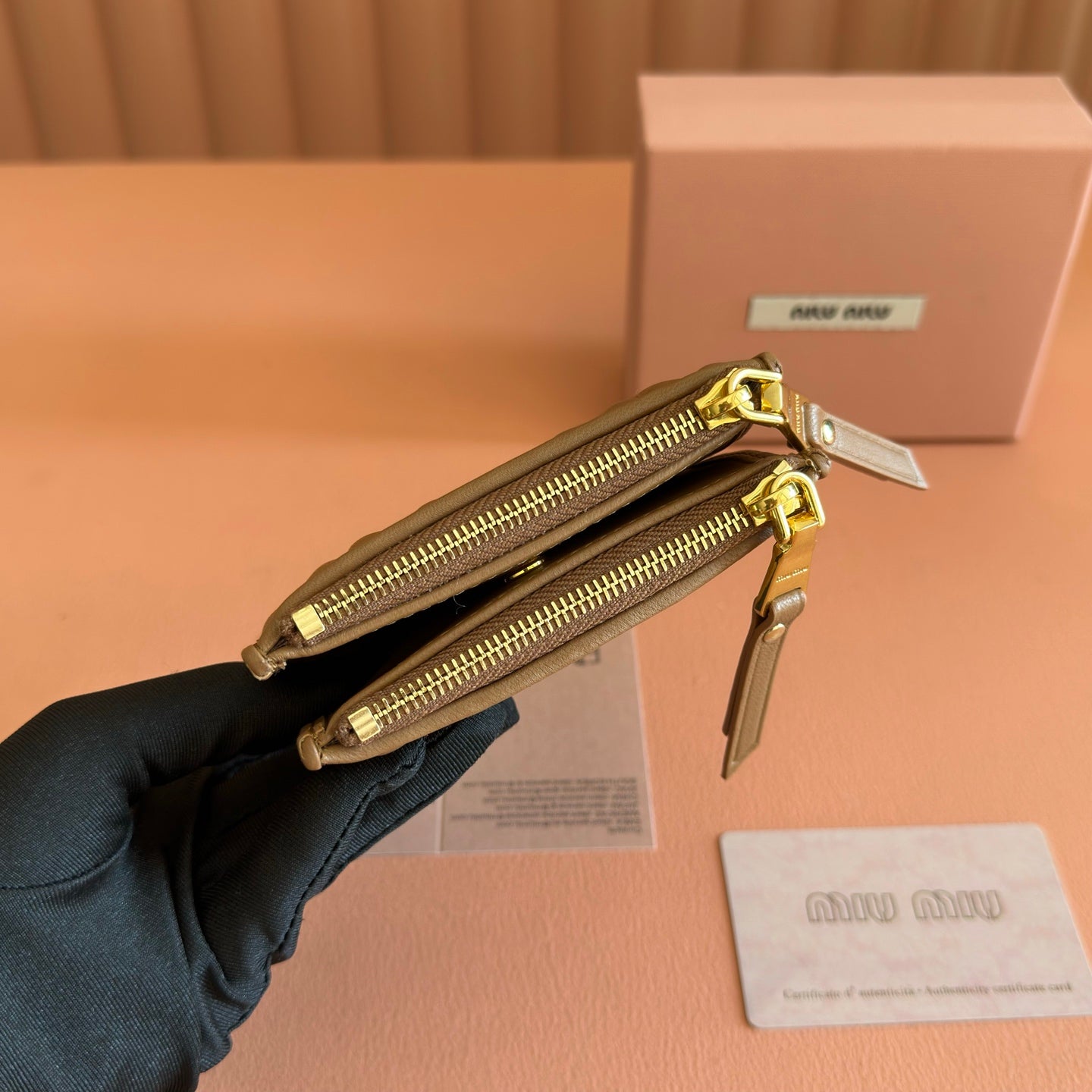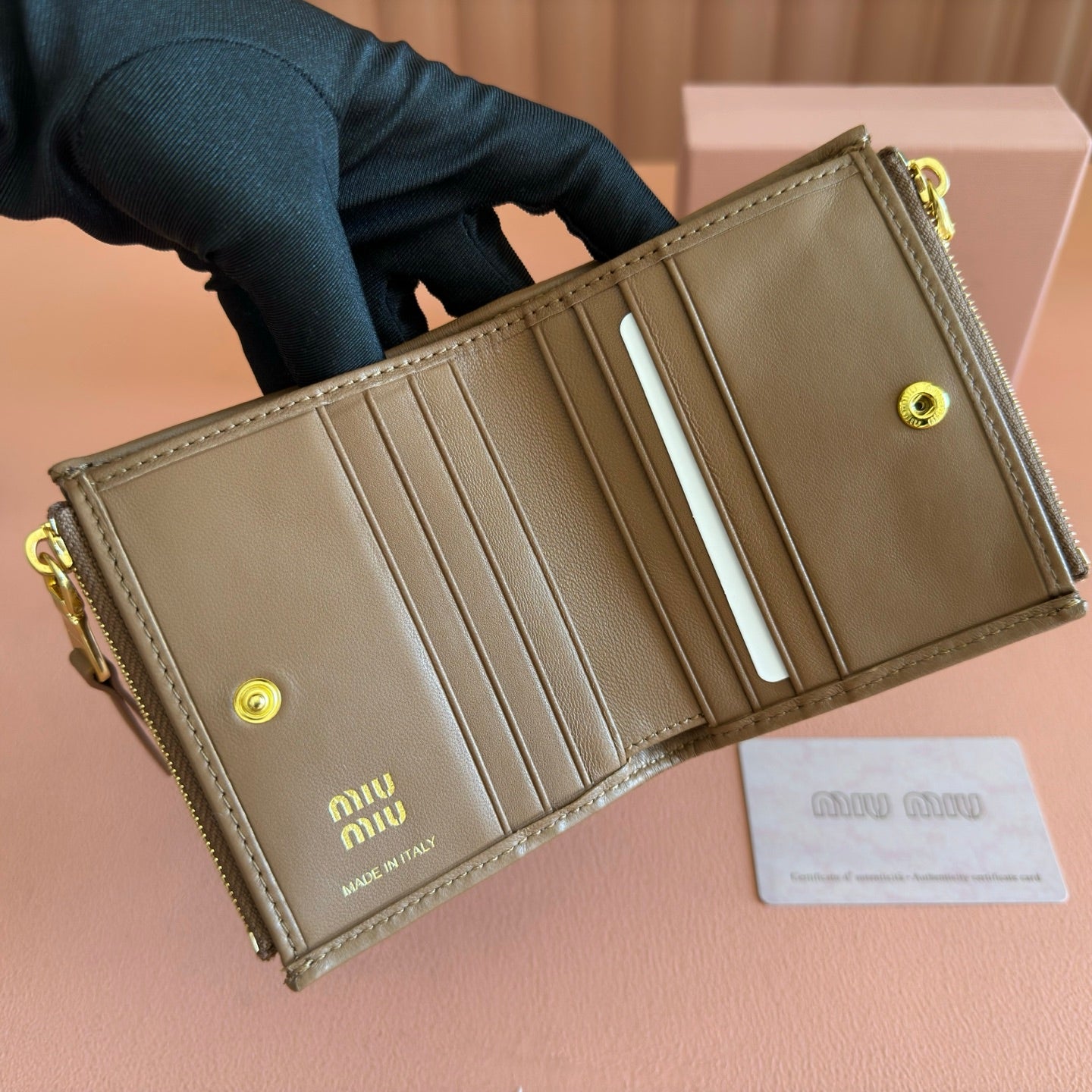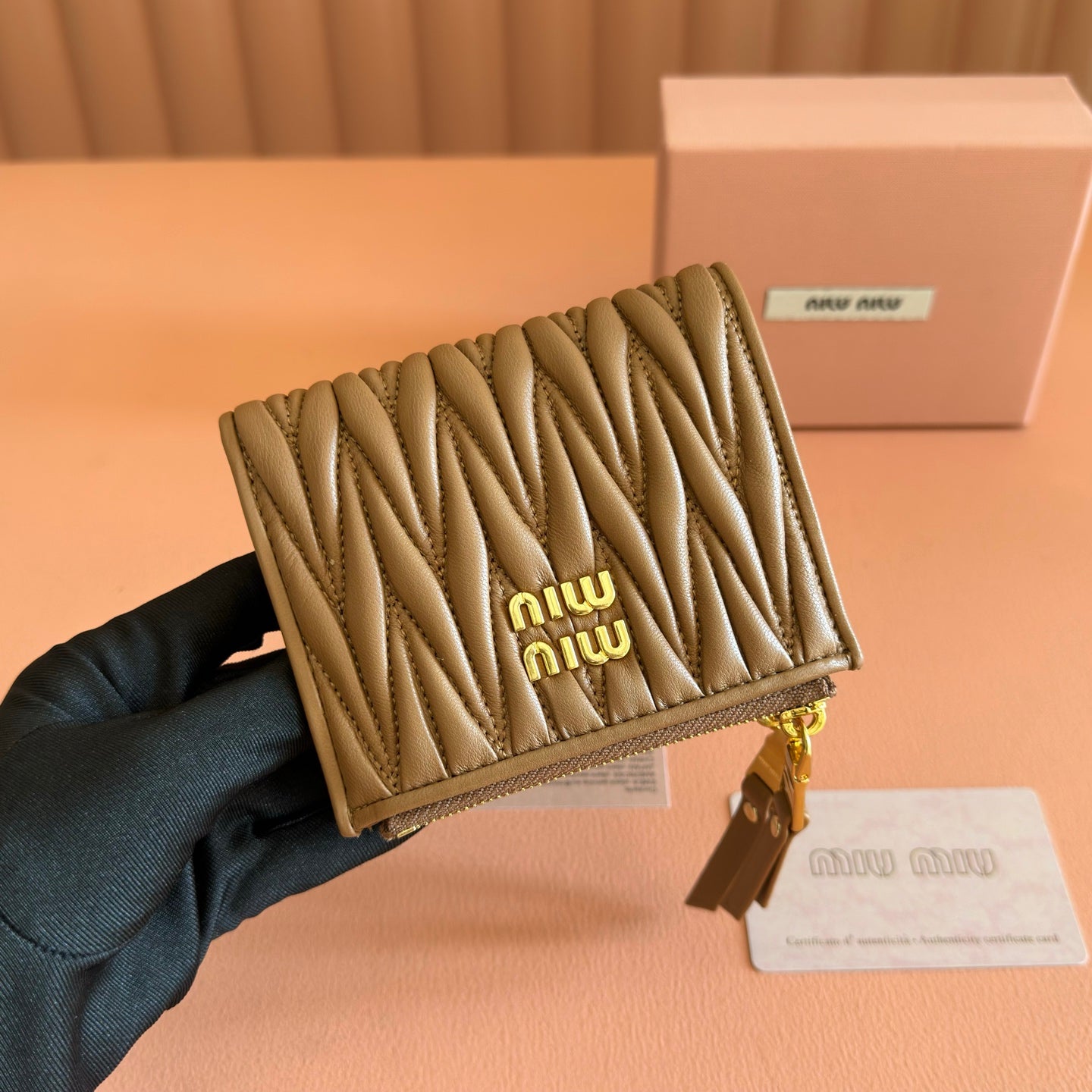 MIUMIU 26S SMALL MATELASSE CARD HOLDER 11 IN BROWN CALFSKIN GOLD HARDWARE
