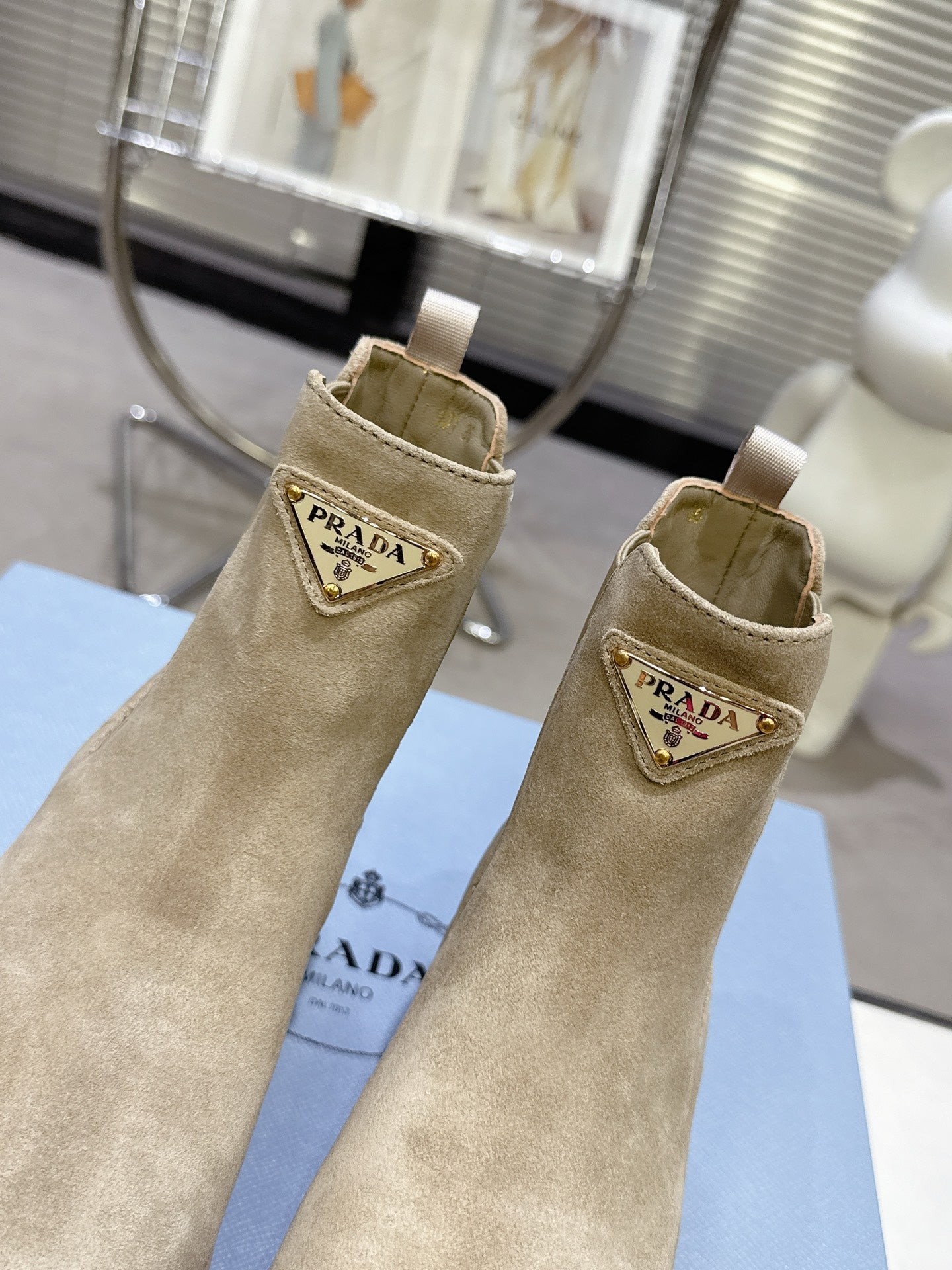 PRADA 25S RETRO PLATFORM MARTIN ANKLE BOOTS IN BEIGE SUEDE