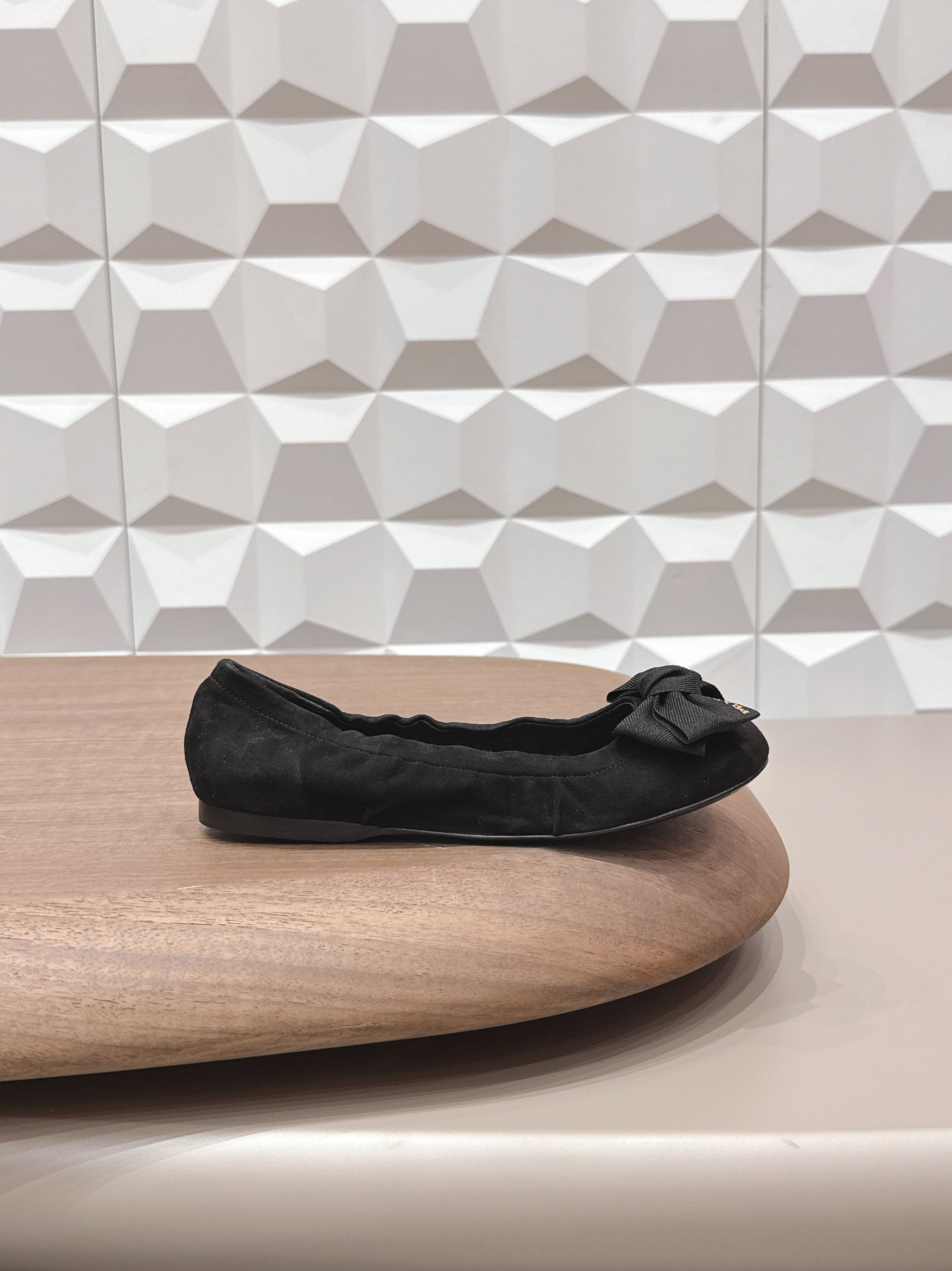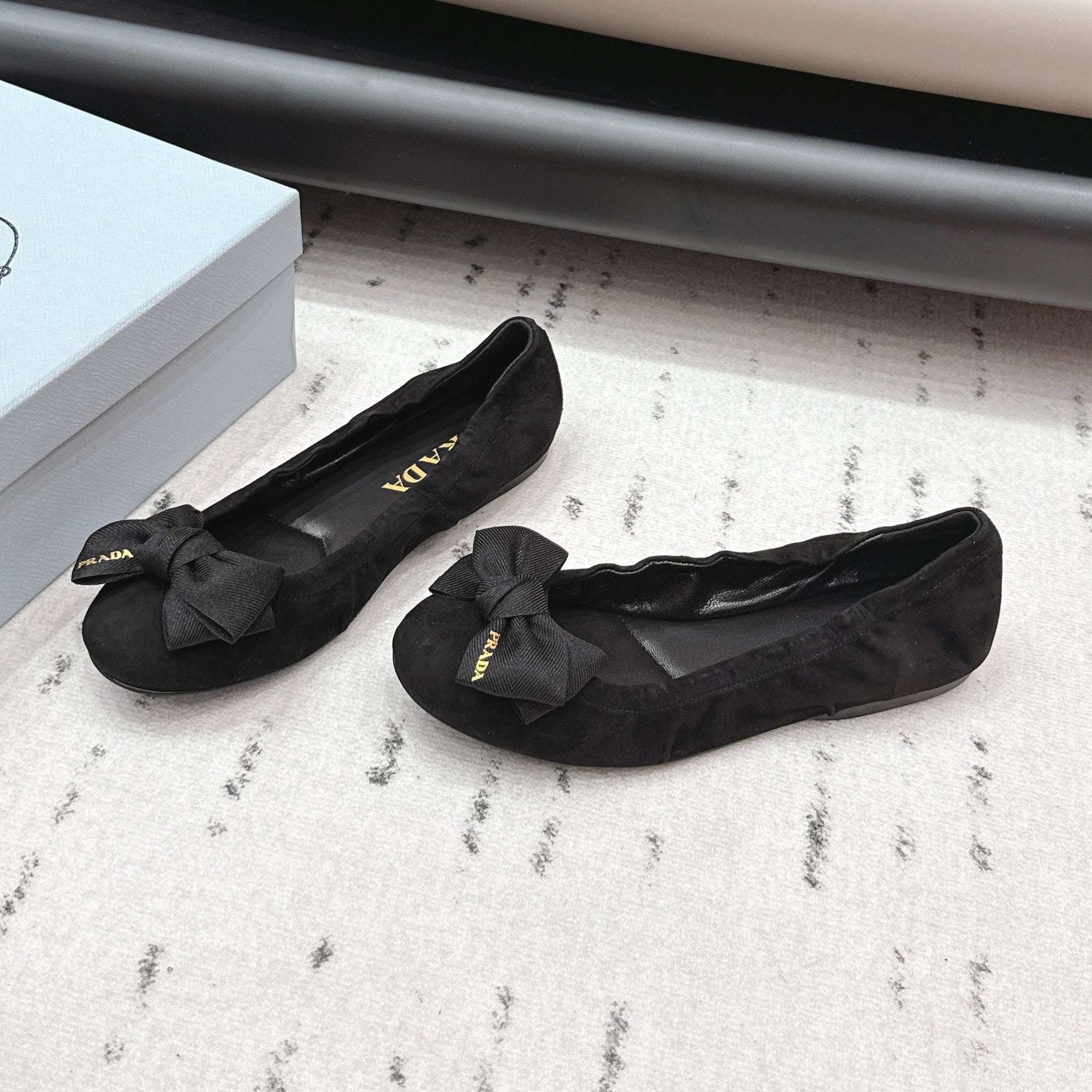 PRADA 26S ROUND TOE FLATS WITH BOW IN BLACK SUEDE