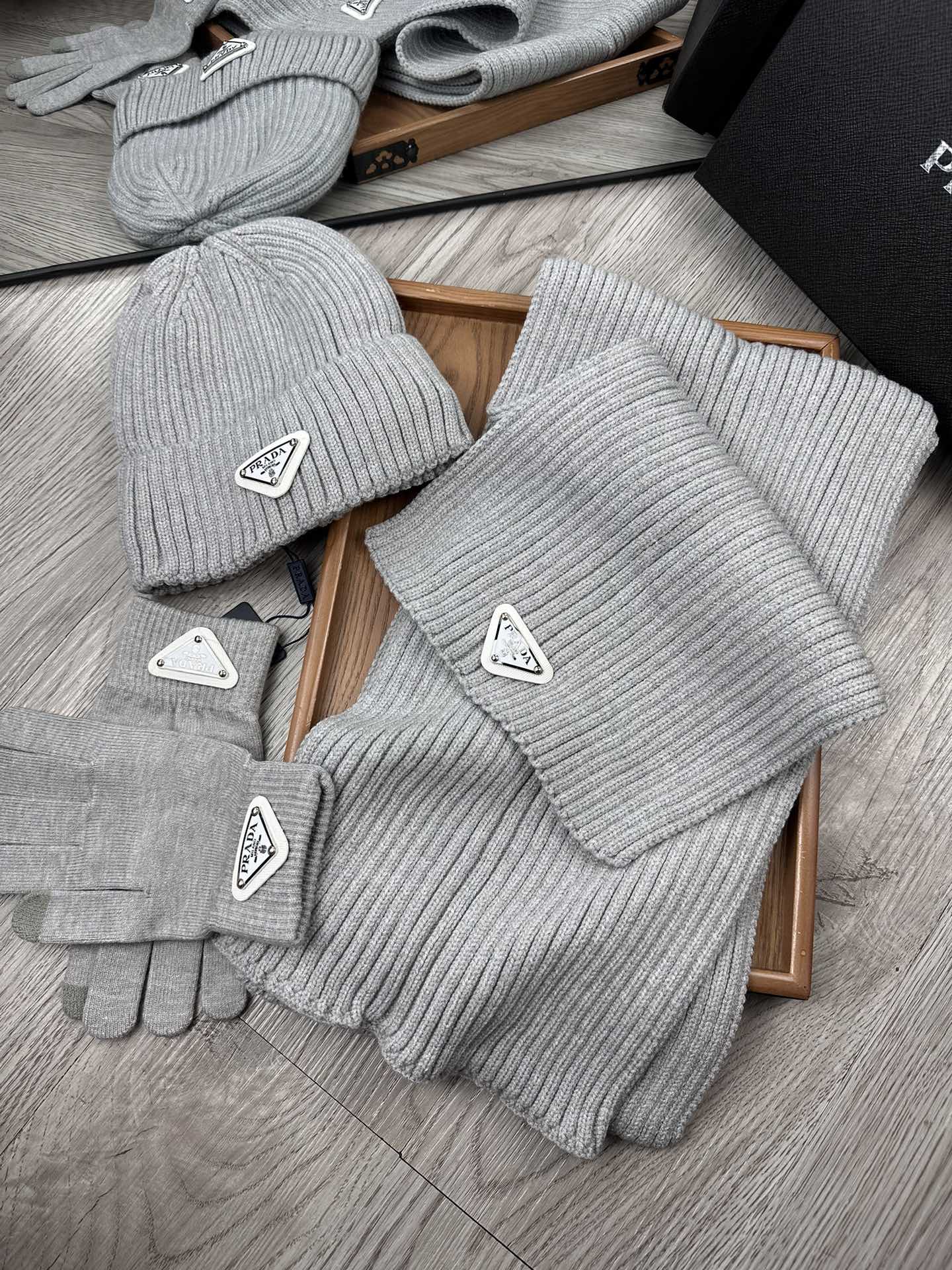 THREE-PIECES SET IN PALE GRAY WOOL AND ACRYLIC 406556