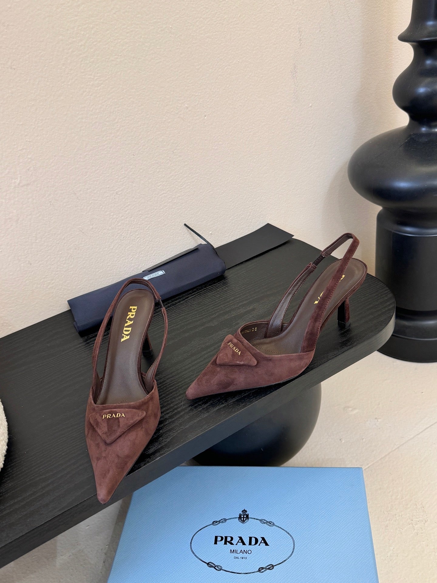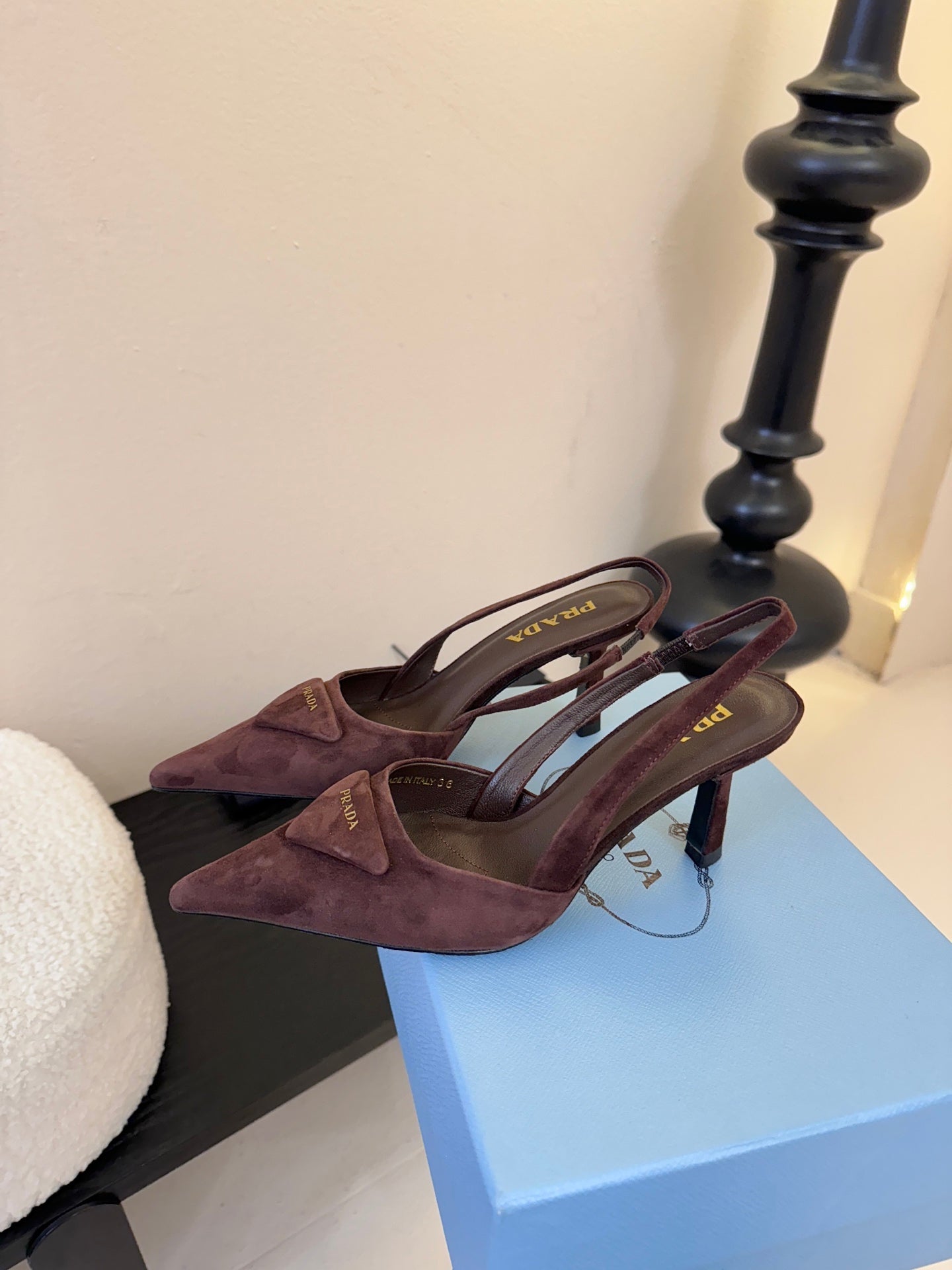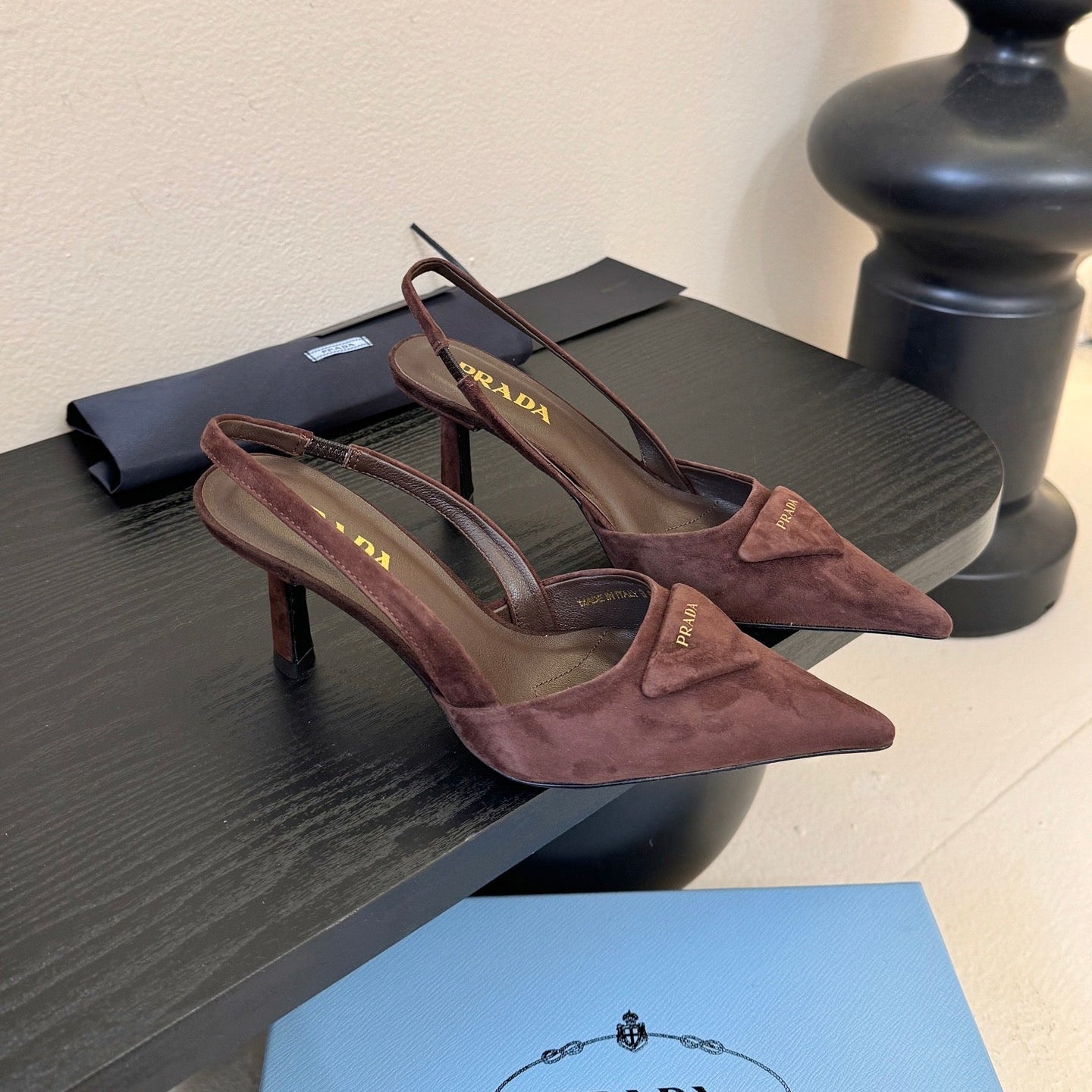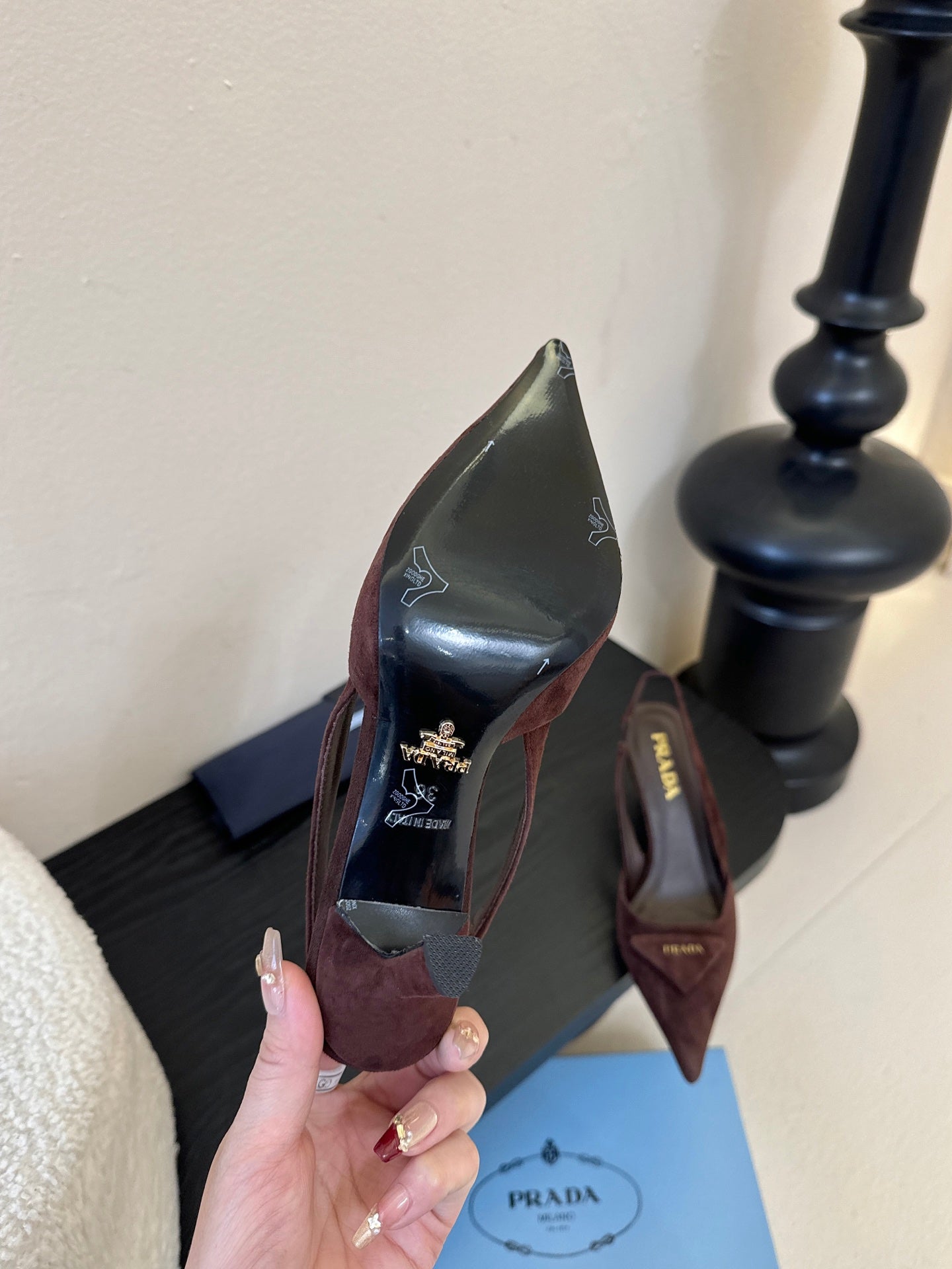 PRADA 26S POINTED TOE SLINGBACK HEELS 60MM IN DARK BROWN SUDE WITH LOGO