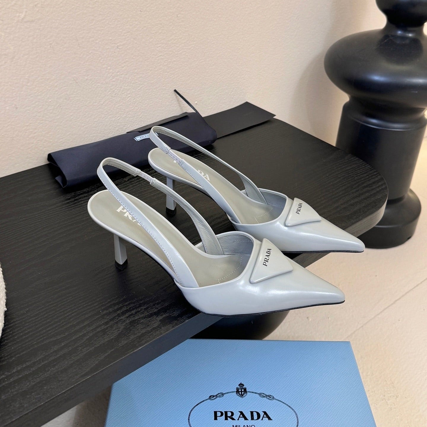 PRADA 26S POINTED TOE SLINGBACK HEELS 60MM IN LIGHT GRAY CALFSKIN WITH LOGO