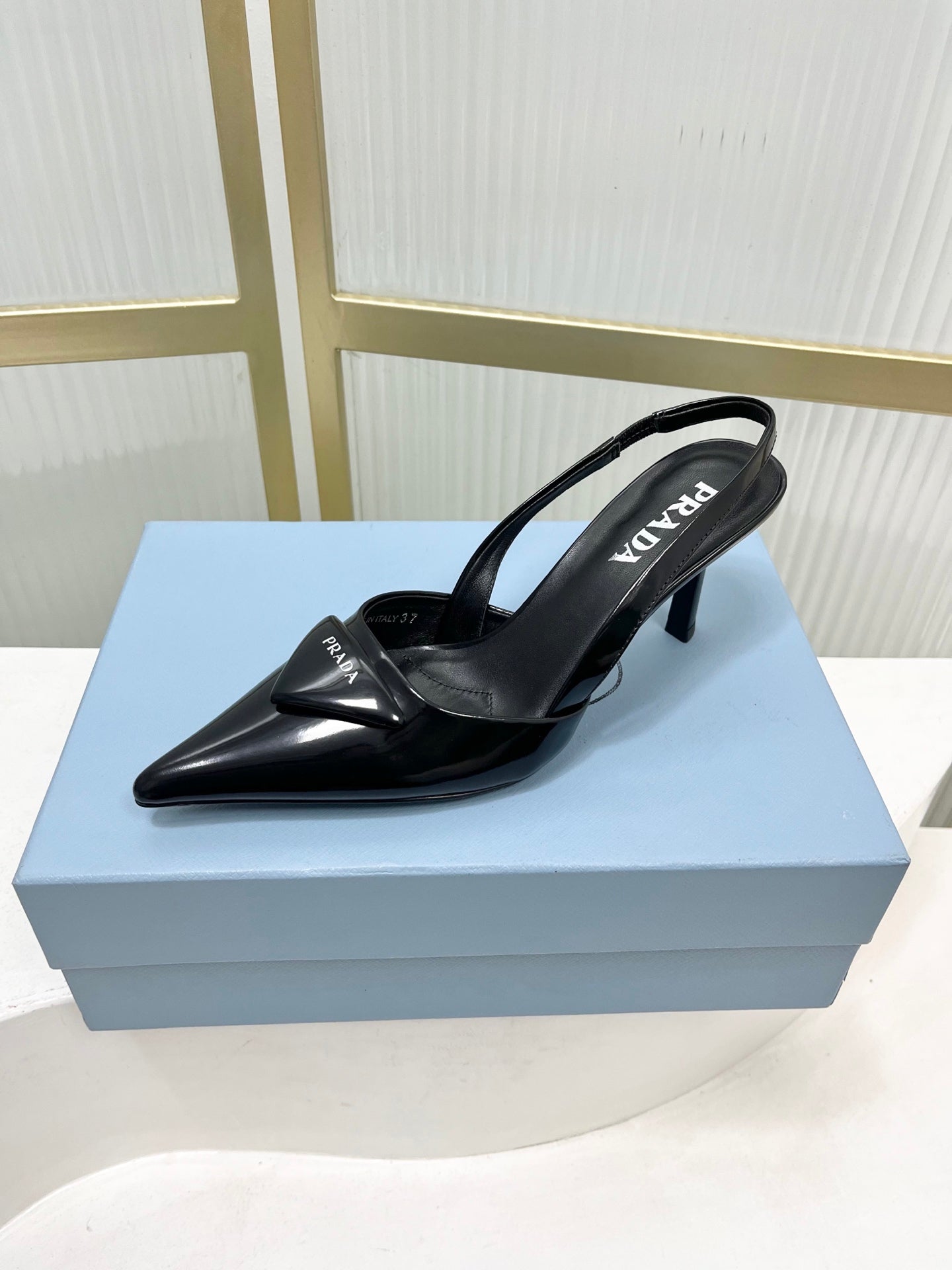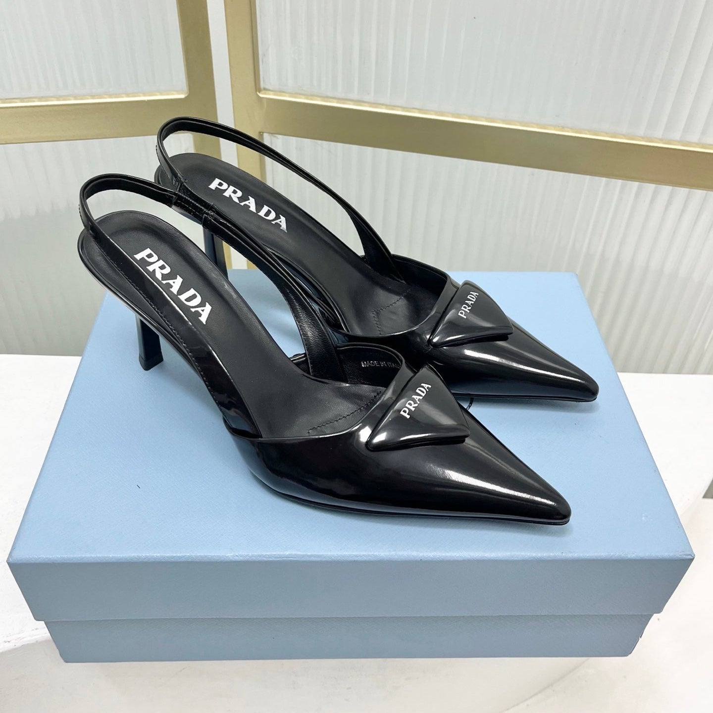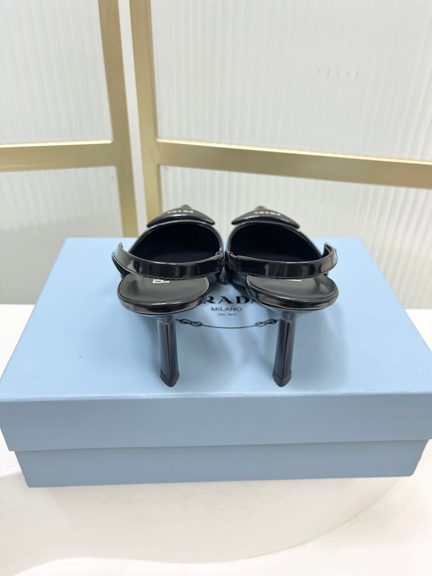 PRADA 26S SLINGBACK HIGH HEEL SANDALS 75MM IN BLACK CALFSKIN WITH LOGO