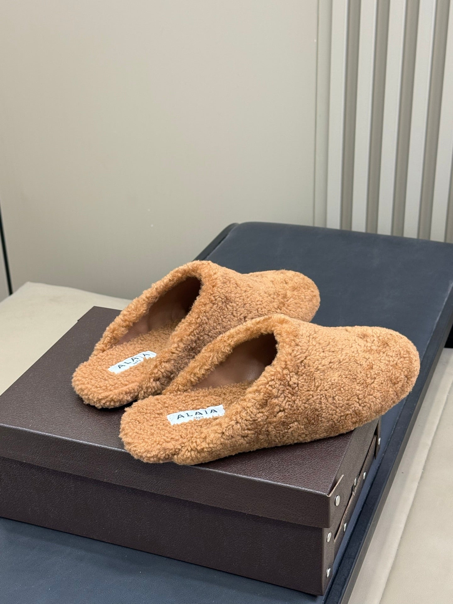 ALAIA 25S SHEARLING COZY SLIPPERS IN CARAMEL