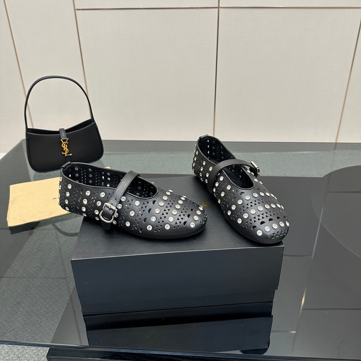 ALAIA BALLET SHOES 25S IN BLACK LAMBSKIN WITH CRYSTAL DETAILING