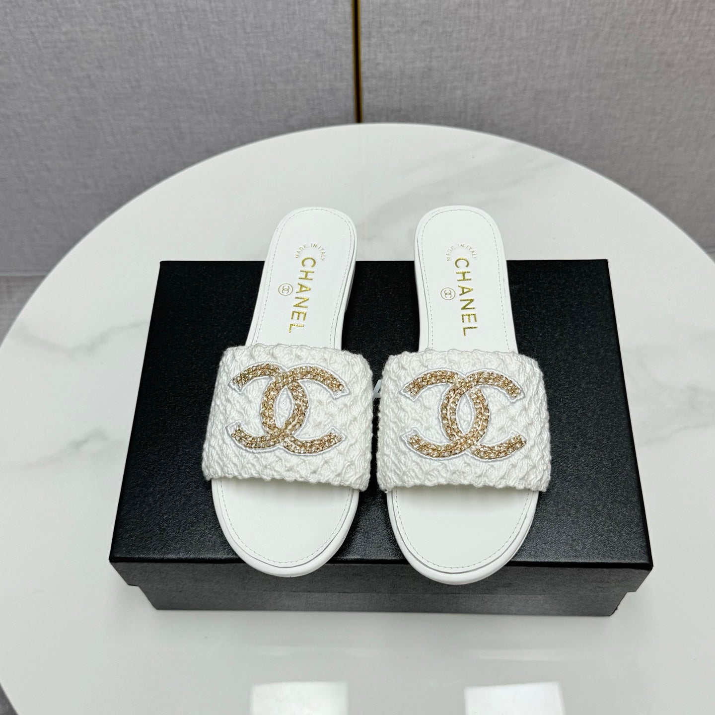 CC SLIDE SANDALS 25S IN WHITE FABRIC AND CALFSKIN WITH LOGO