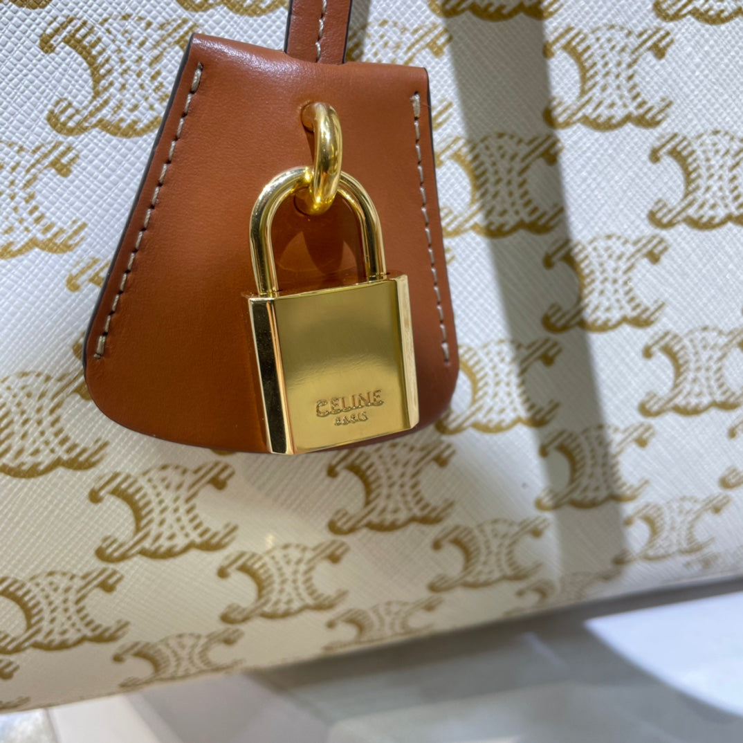 CELINE 25S HORIZONTAL CABAS 34MM IN WHITE TRIOMPHE CANVAS AND BROWN CALFSKIN