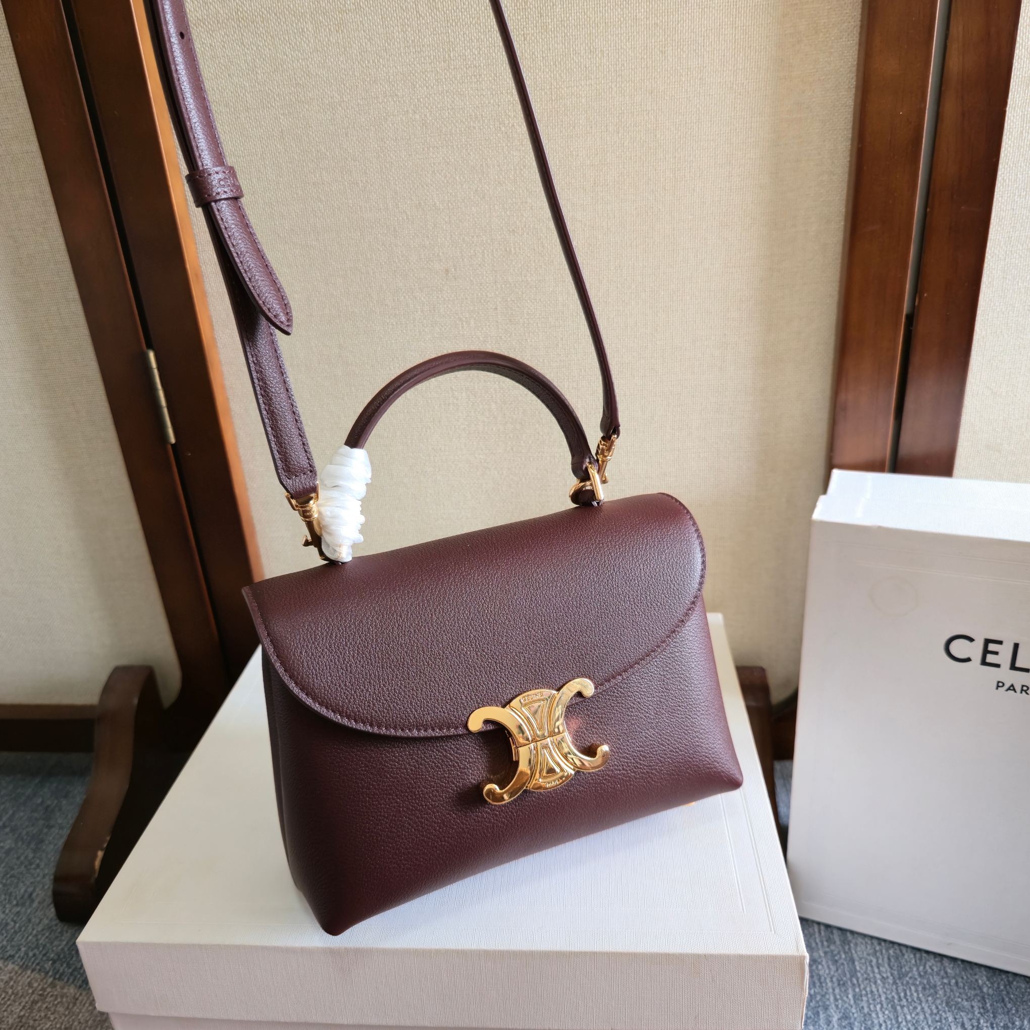 CELINE 25S NINO BAG 20MM IN SYRAH RED GRAINED CALFSKIN GOLD HARDWARE