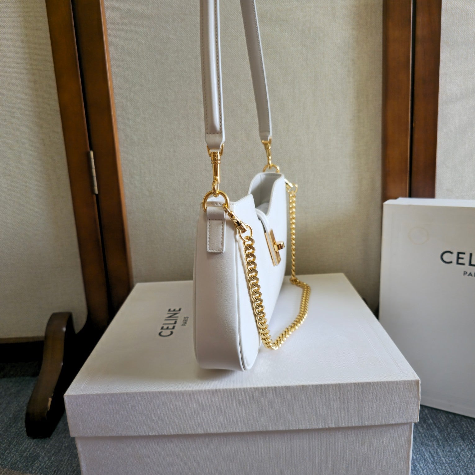 CELINE 25S SHOULDER CAMILLE 16 SOFT 27MM IN WHITE CALFSKIN GOLD HARDWARE