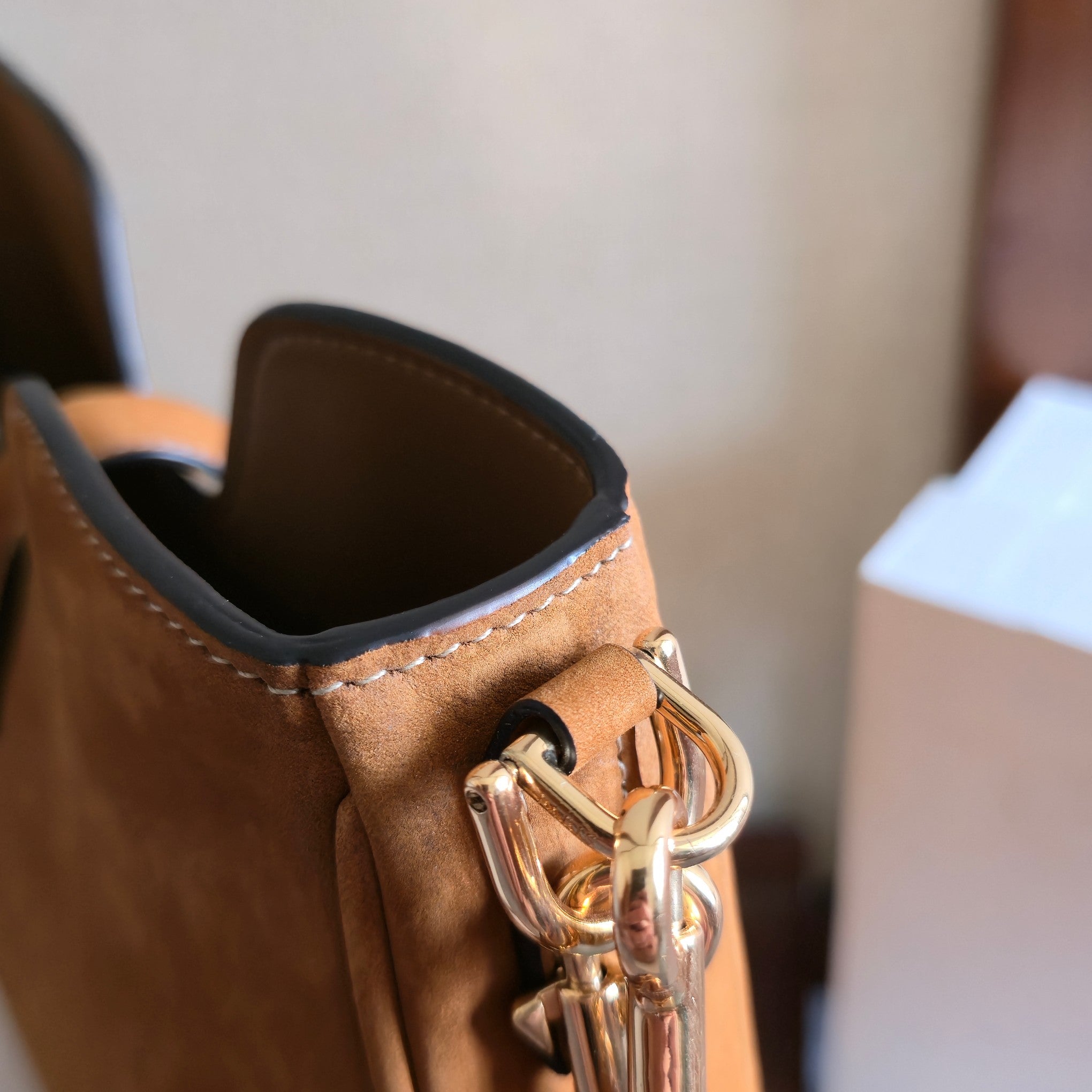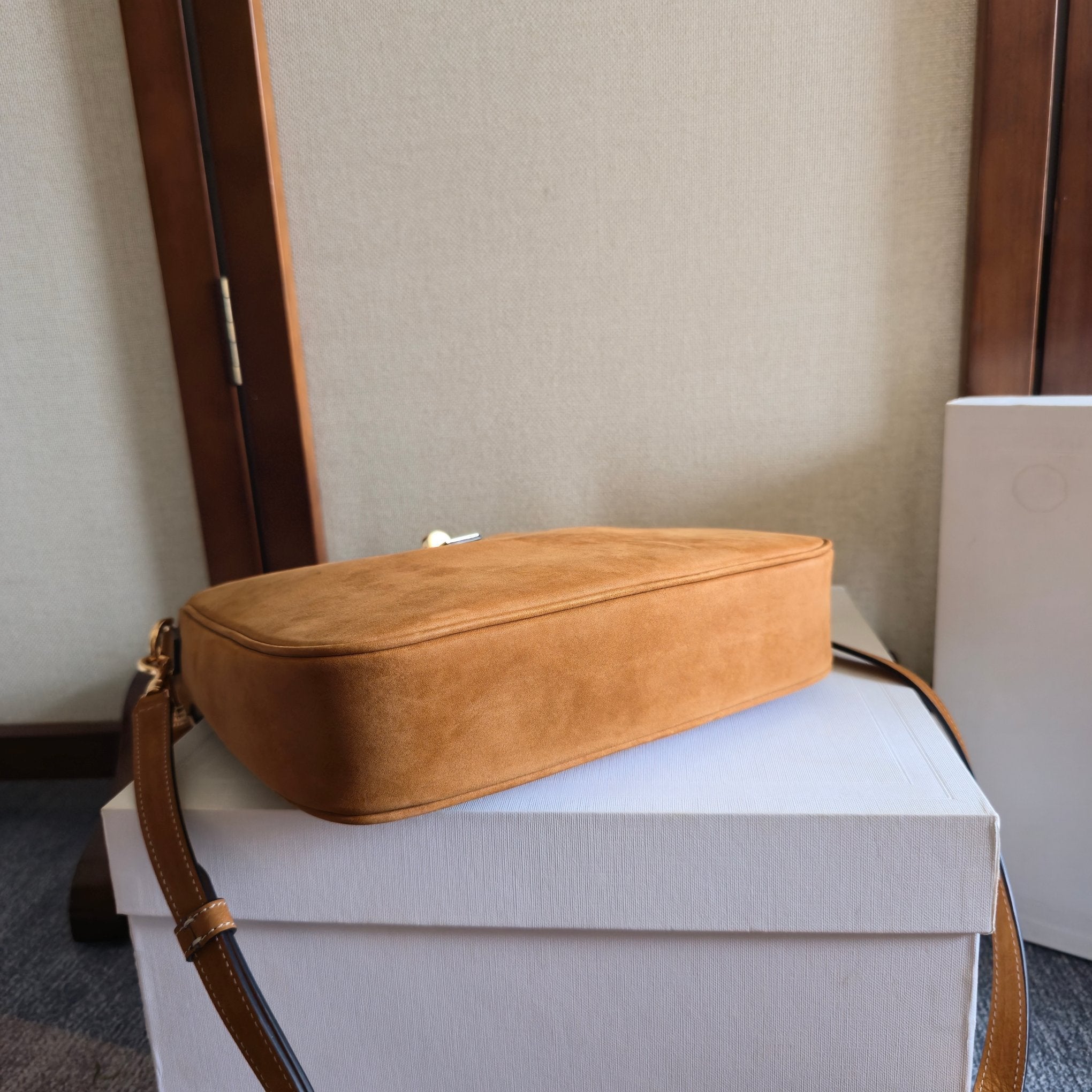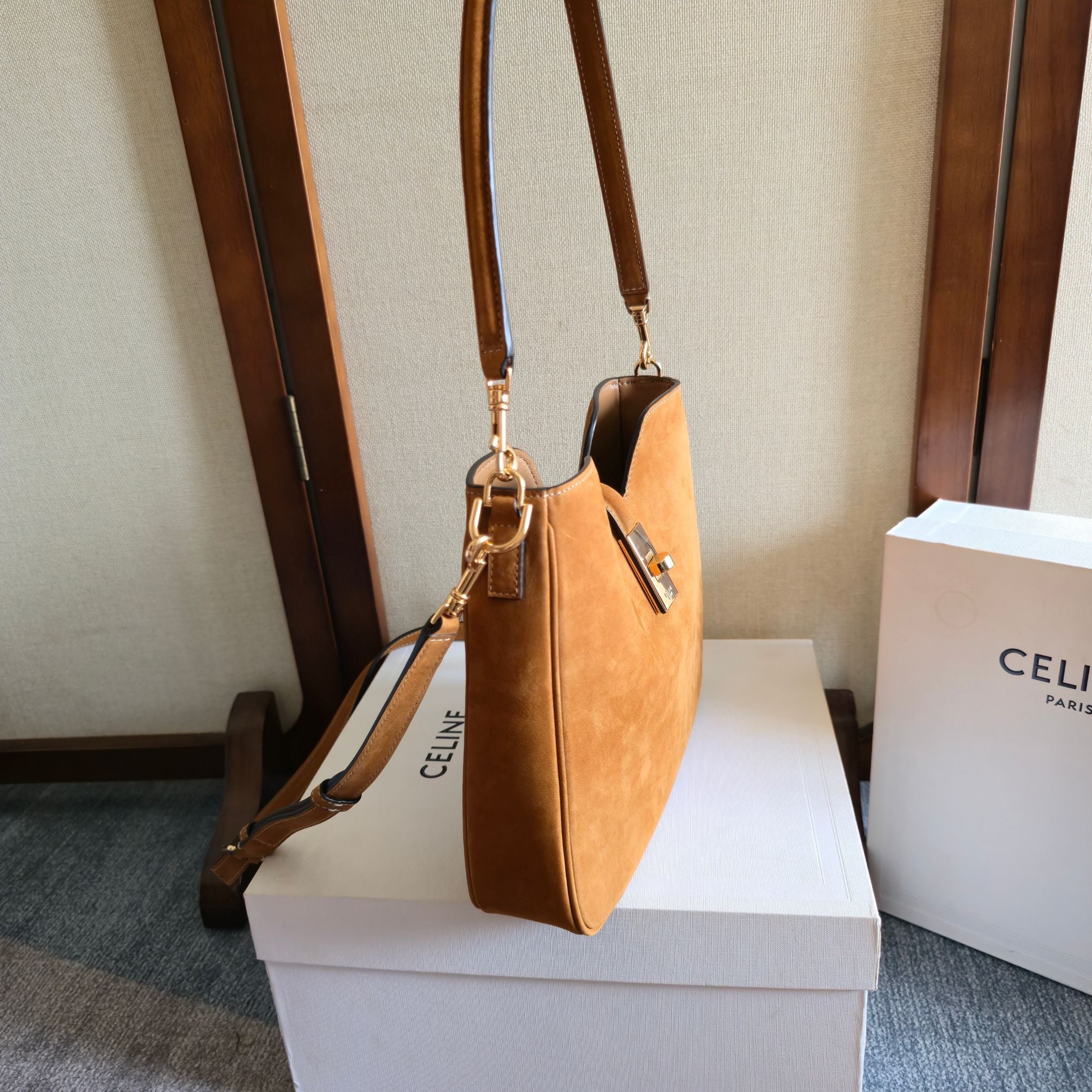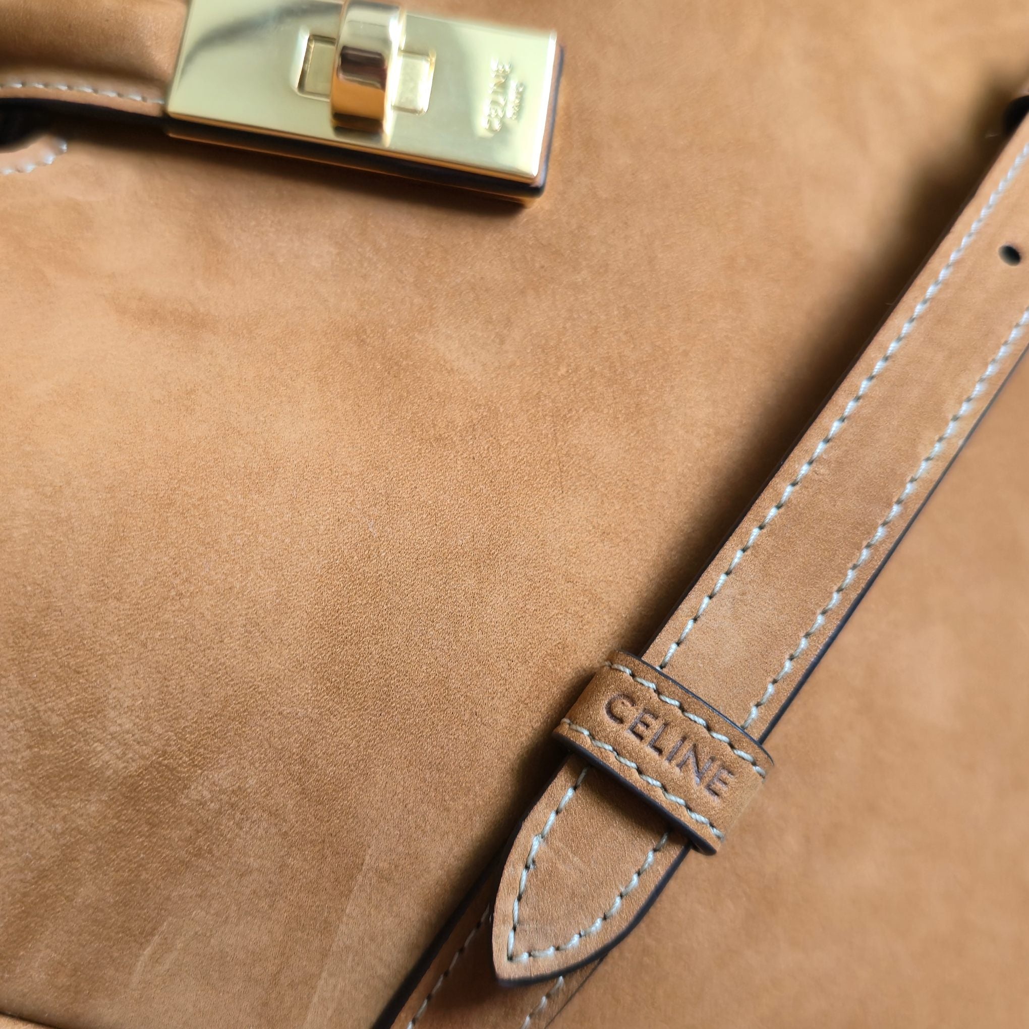 CELINE 25S SMALL CAMILLE 16 SOFT BAG 24MM IN CARAMEL BROWN SUEDE