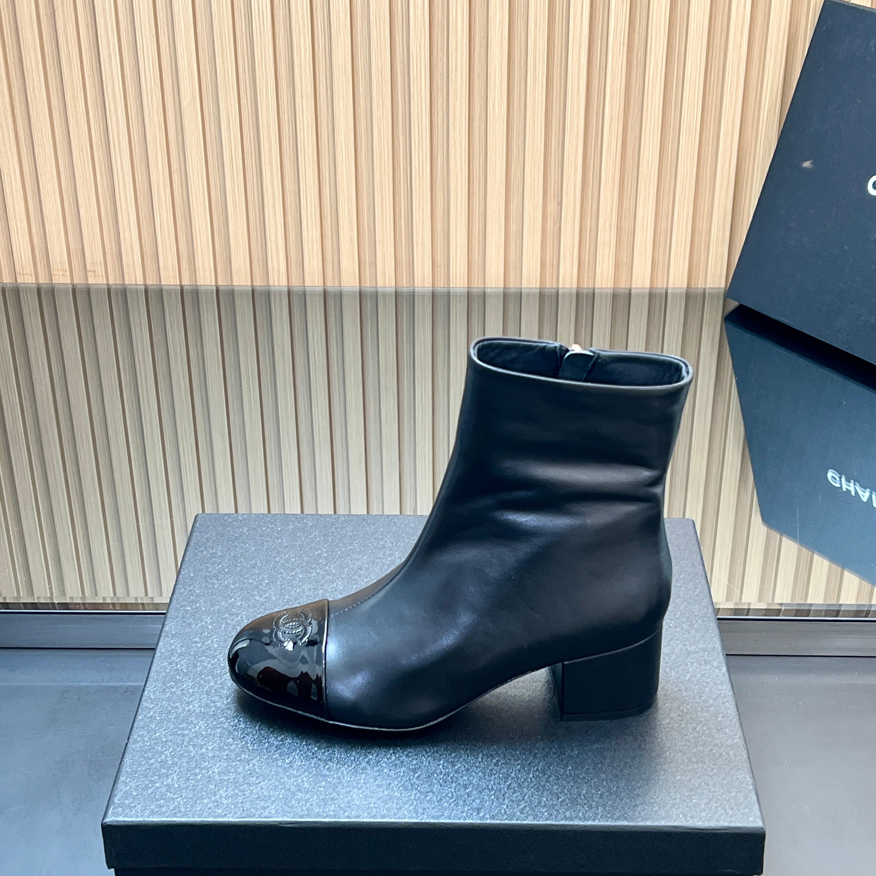 CHANEL 25S BOOTS WITH PATENT TOE CAP 50MM IN BLACK CALFSKIN