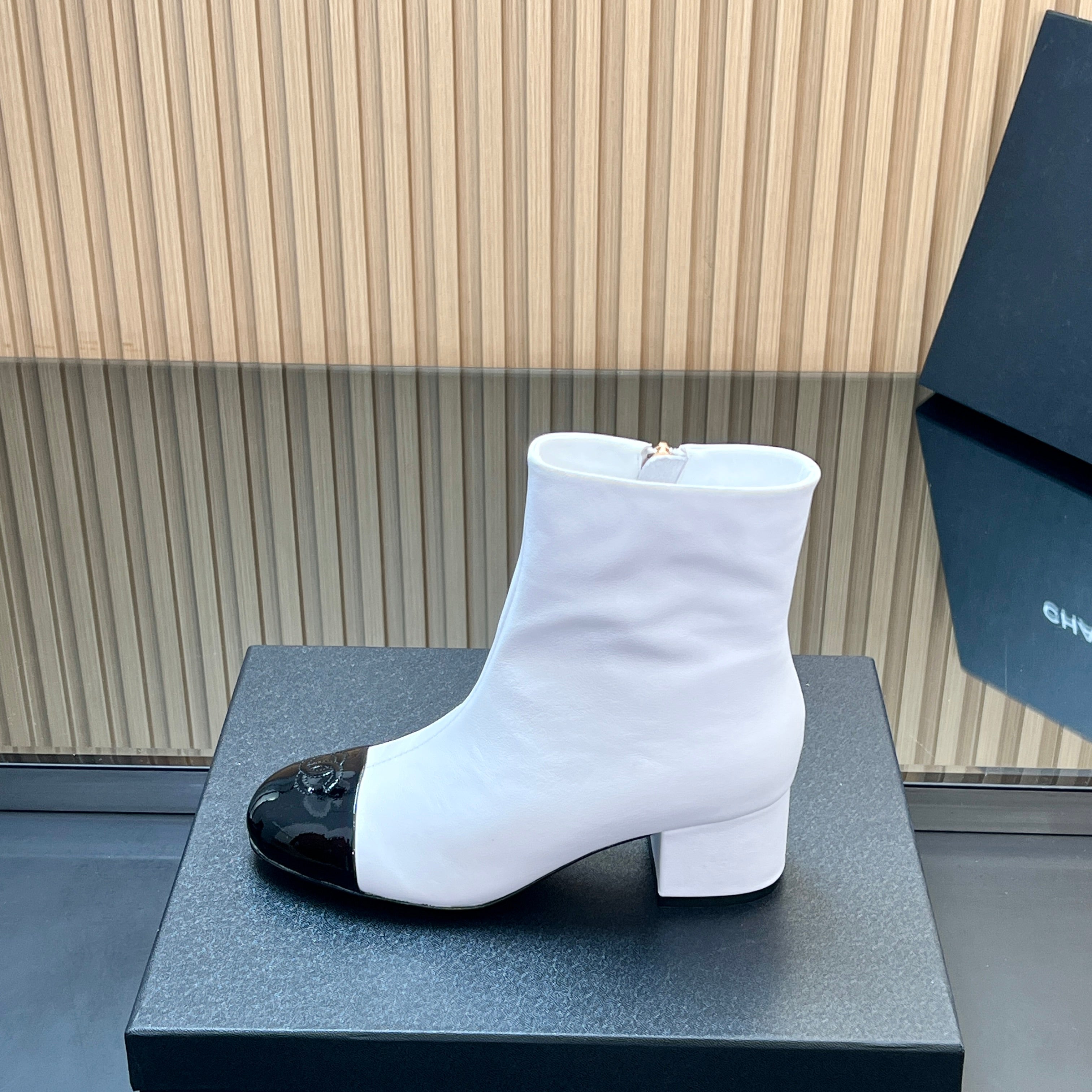 CHANEL 25S BOOTS WITH PATENT TOE CAP 50MM IN WHITE AND BLACK CALFSKIN
