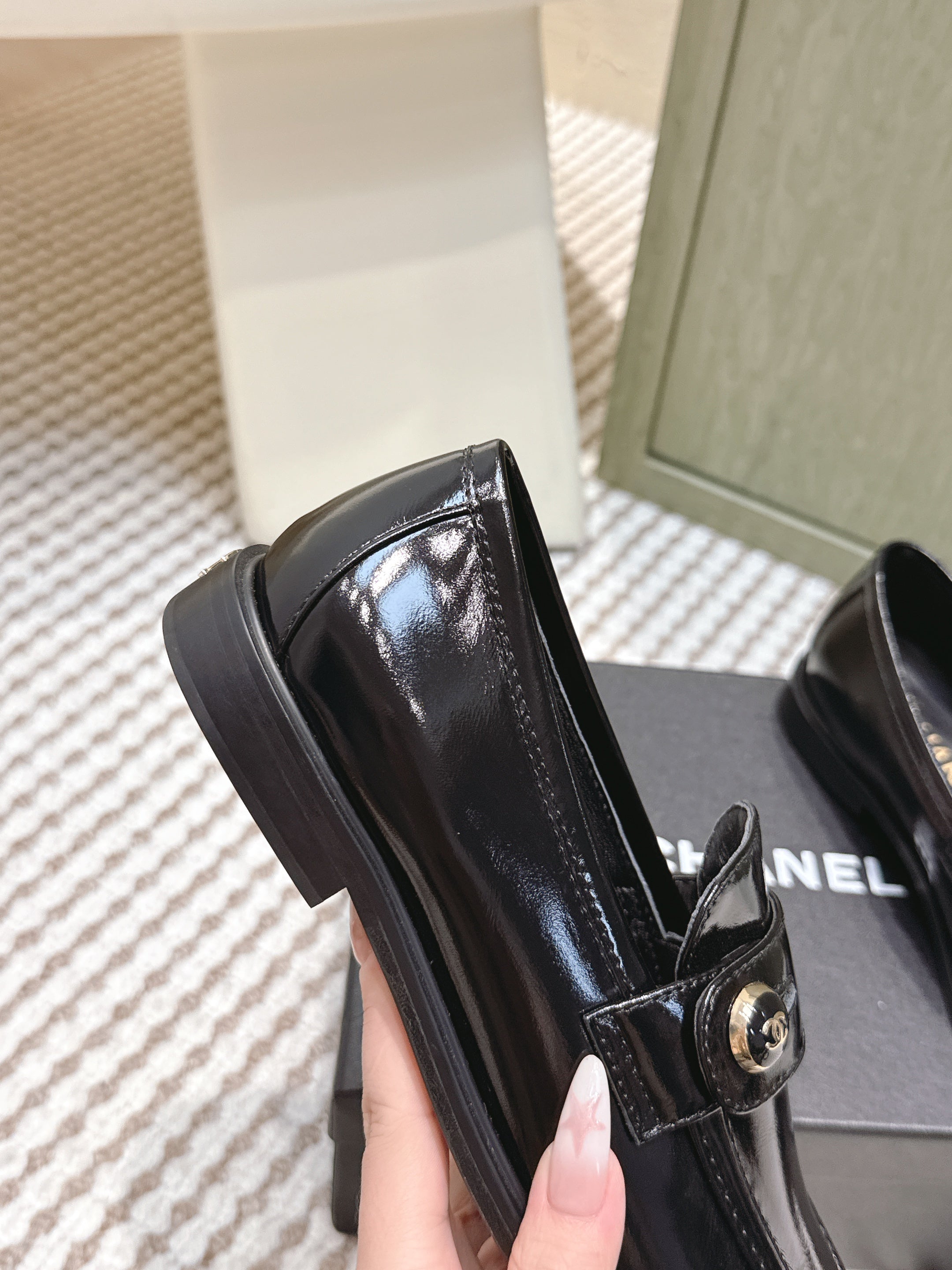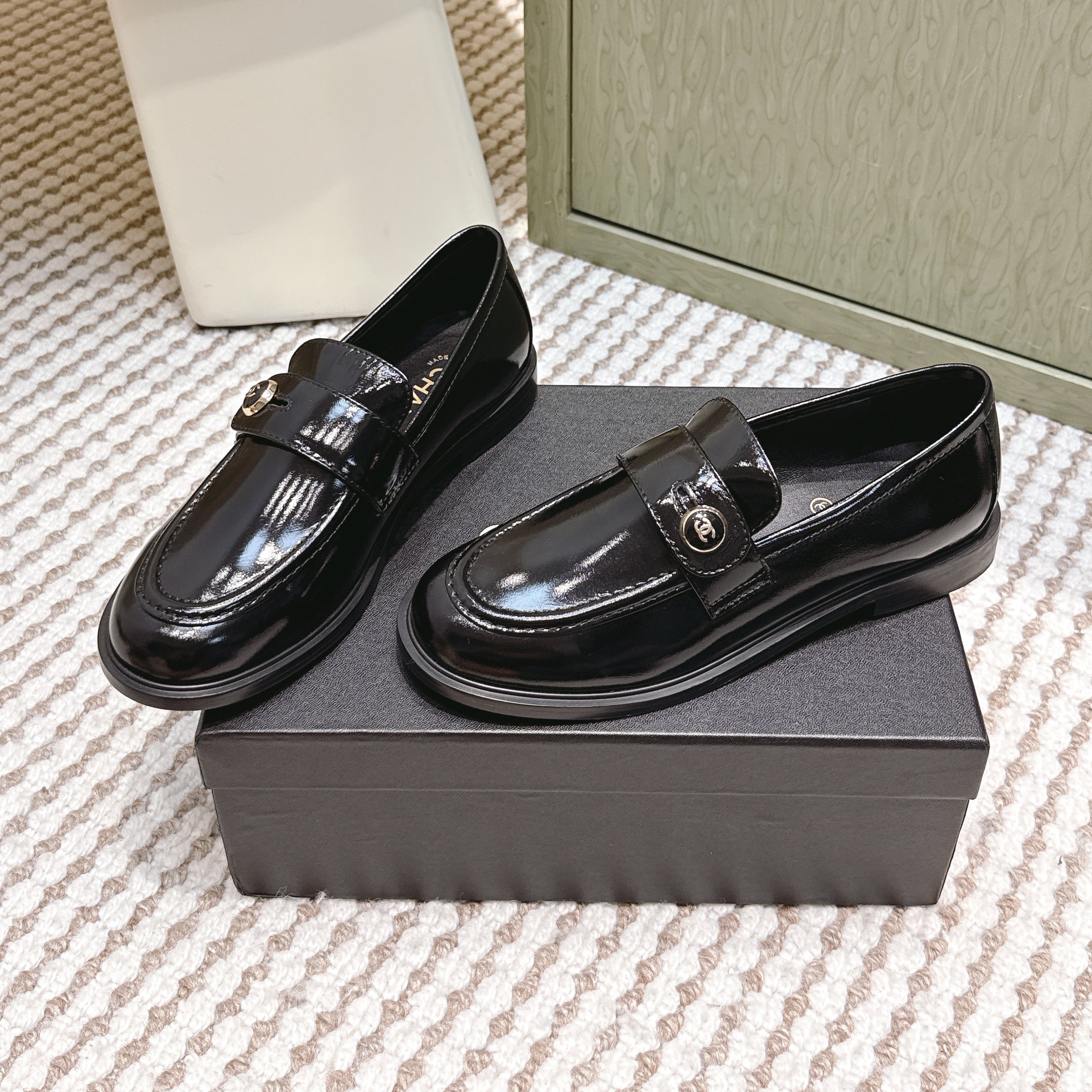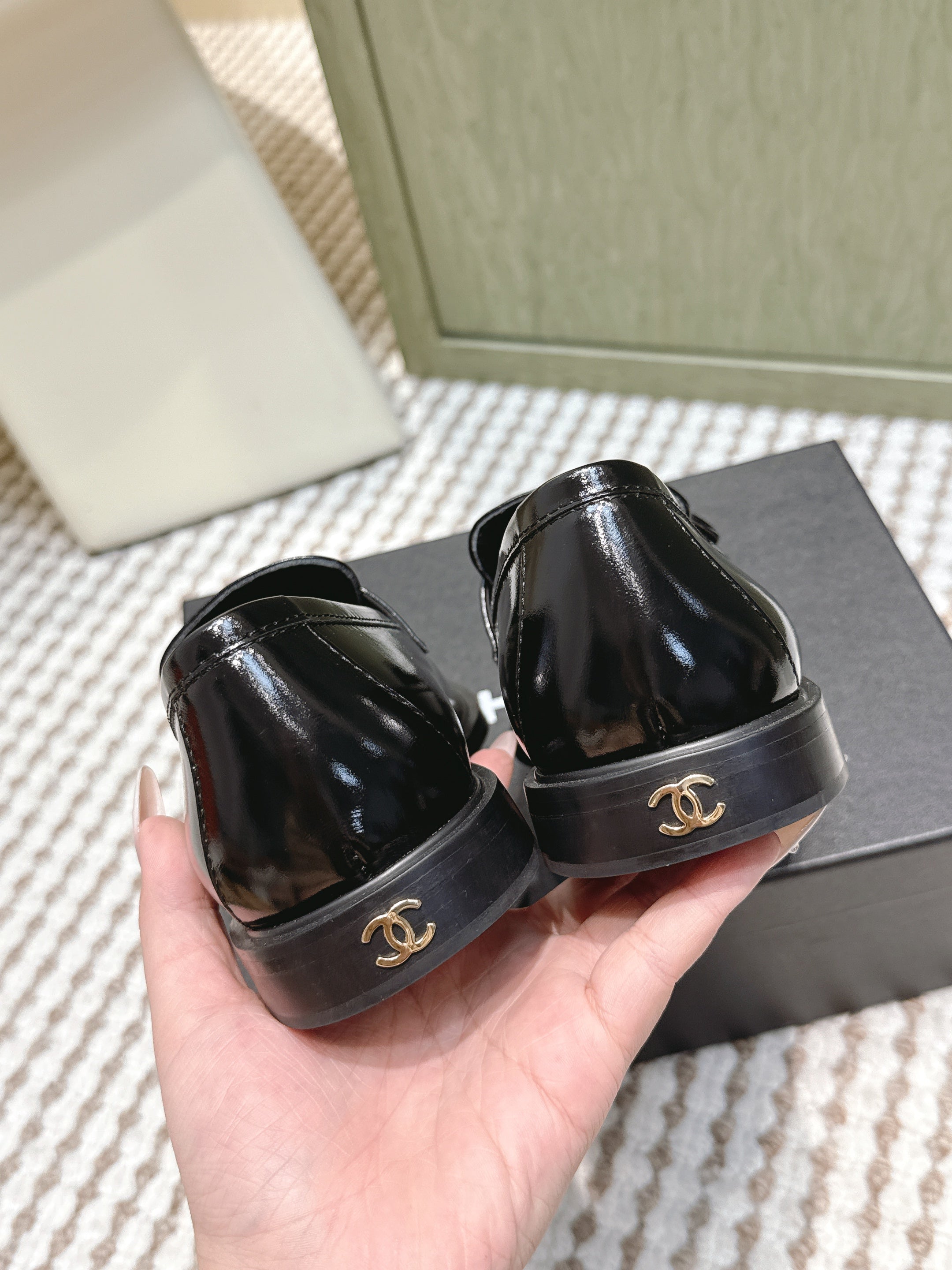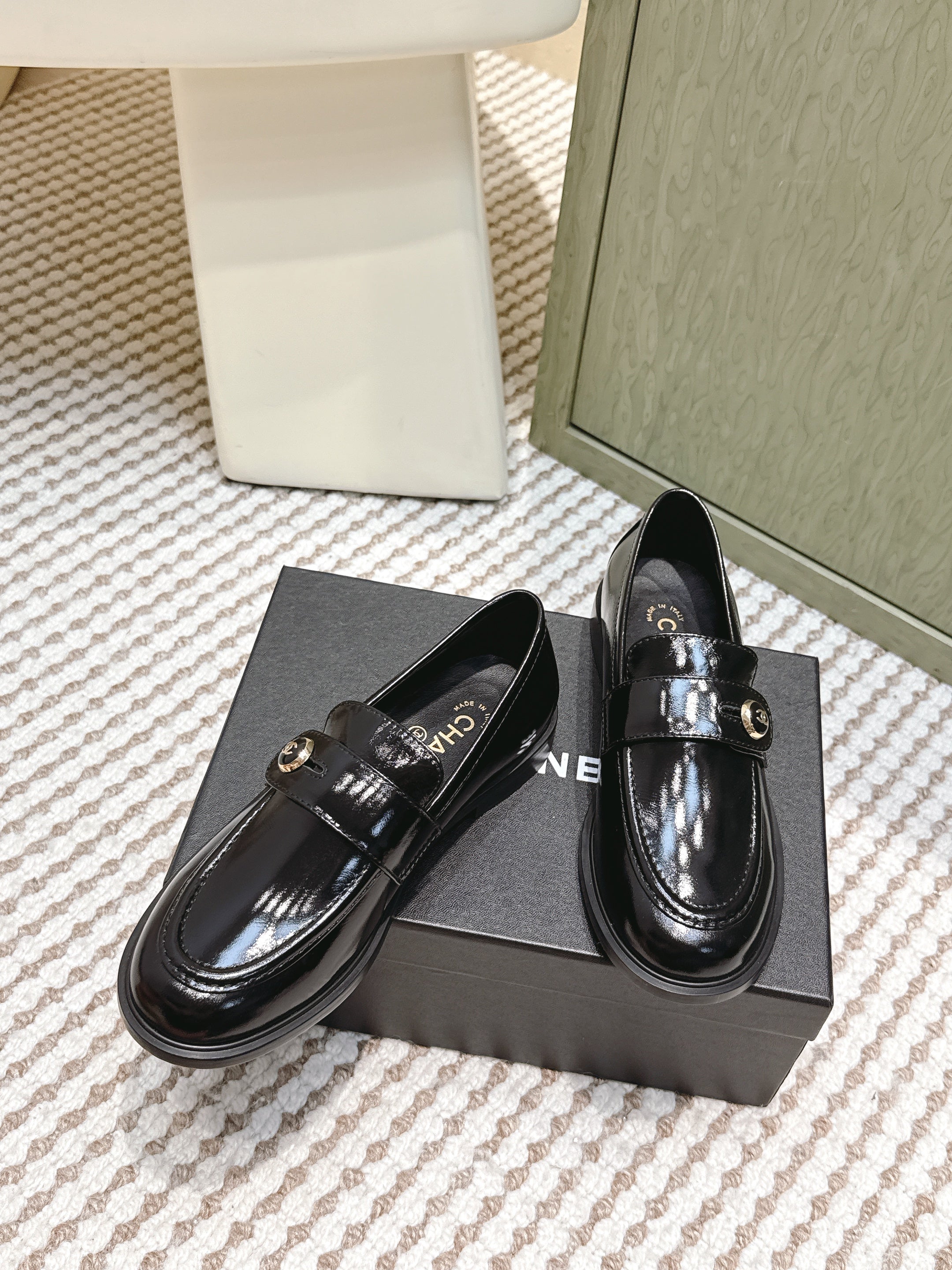 CHANEL 25S GODDESS FLAT LOAFERS IN BLACK PATENT CALFSKIN GOLD HARDWARE