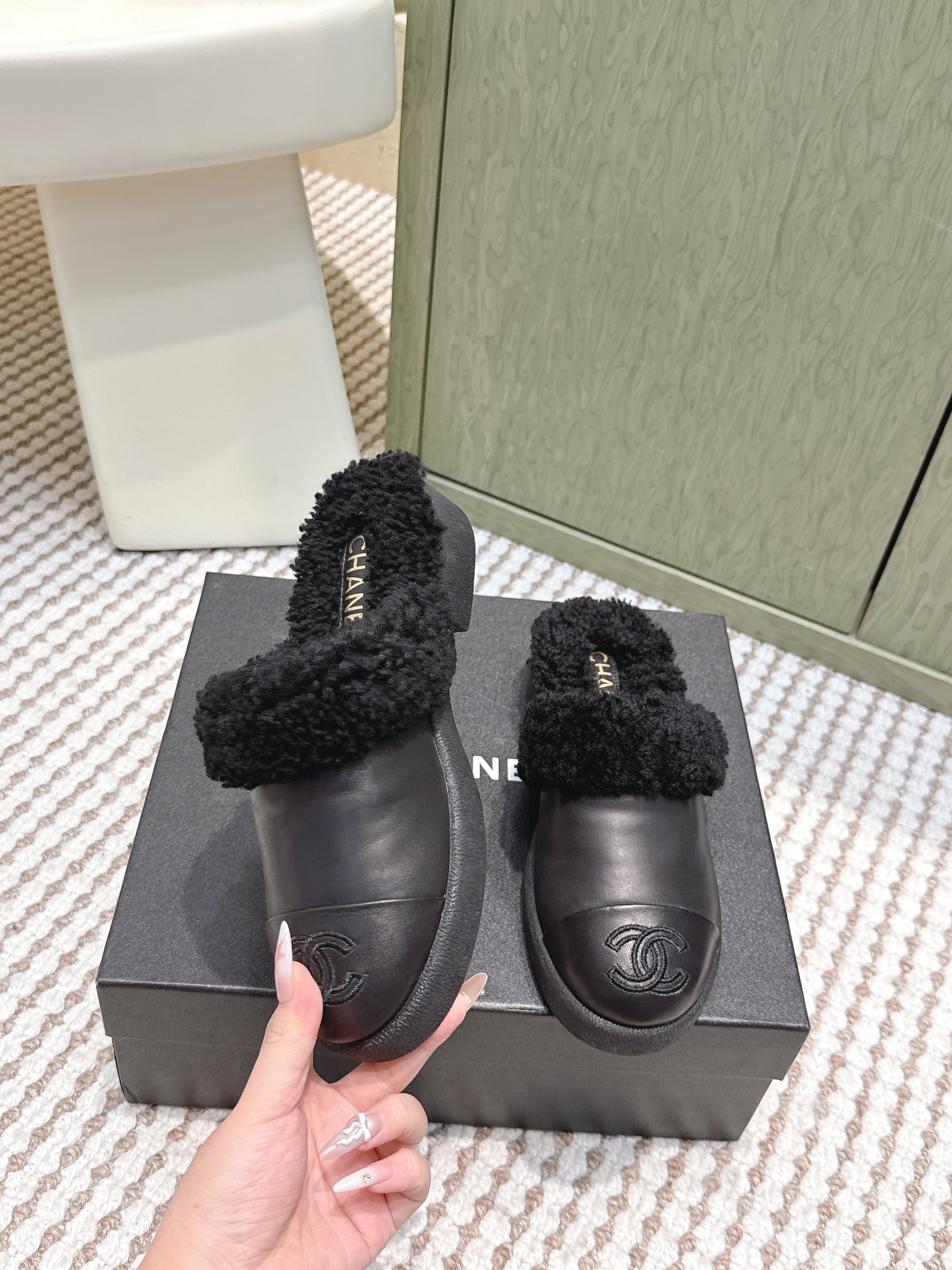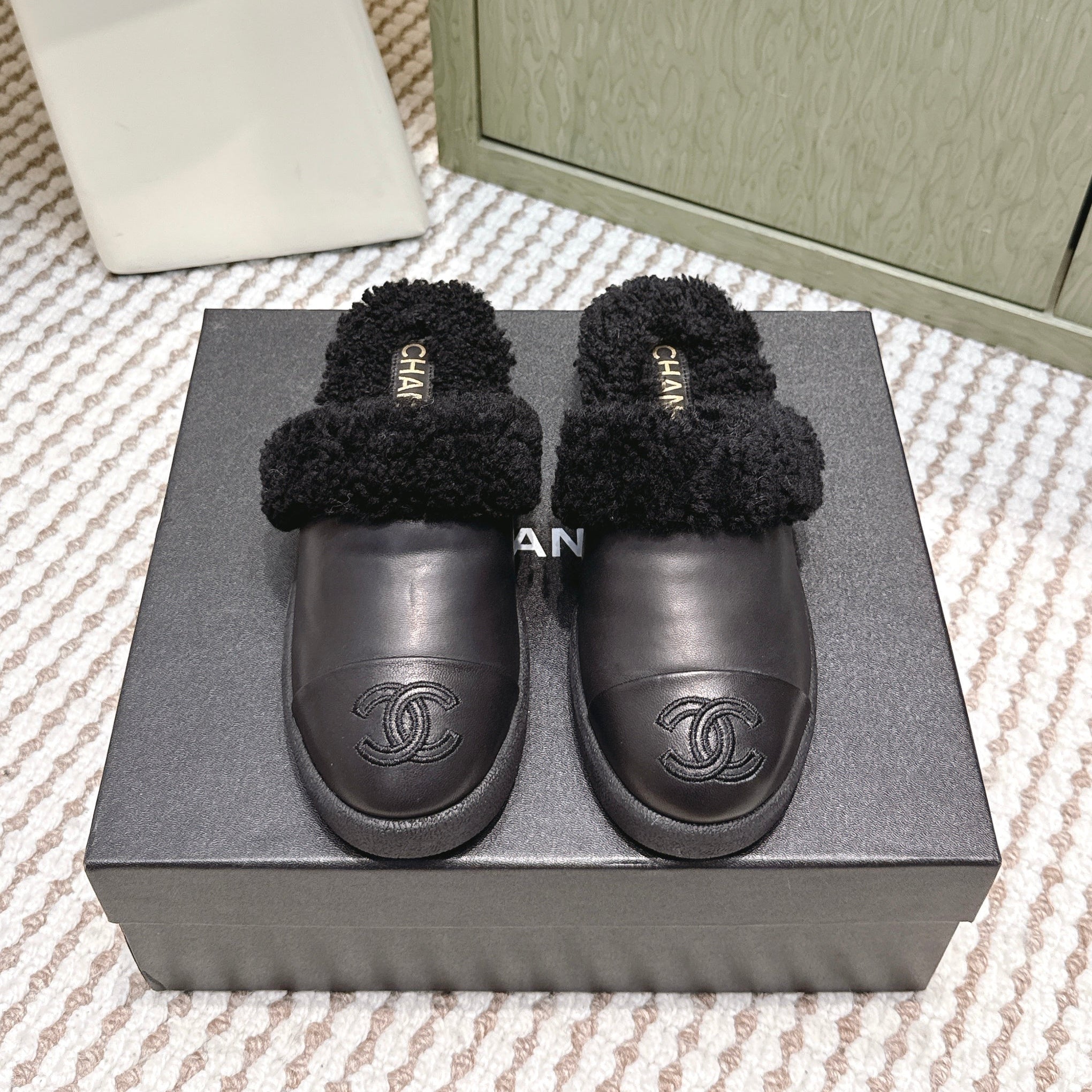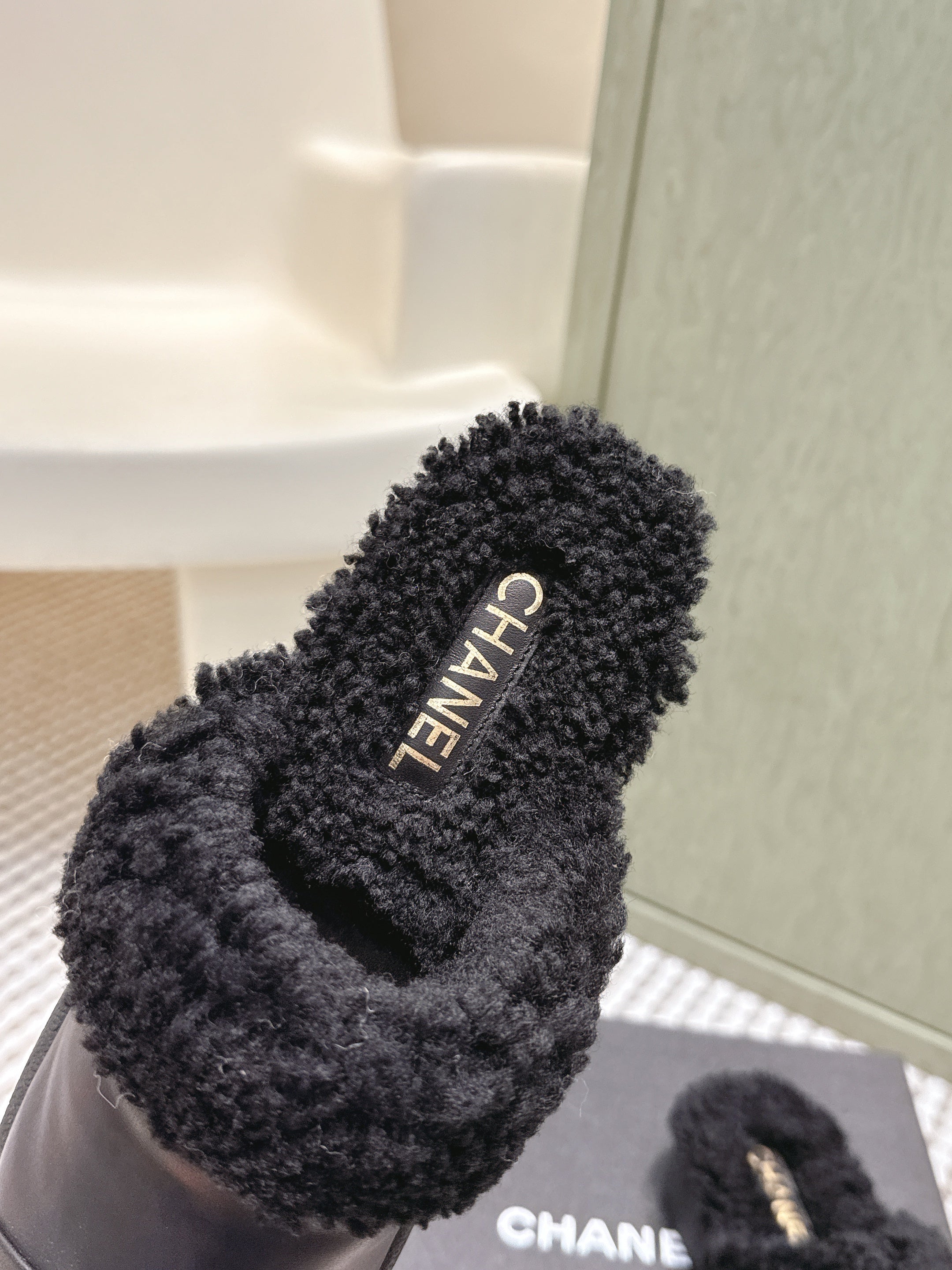 CHANEL 25S INDOOR SLIPPERS IN BLACK CALFSKIN FUR-LINED