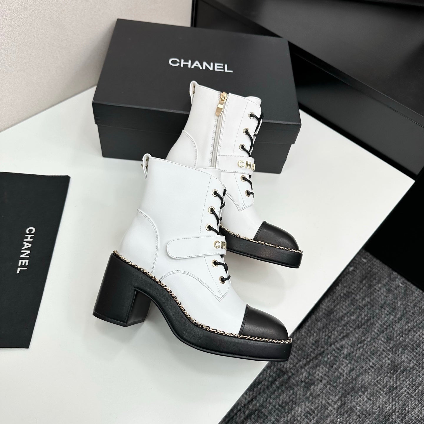 CHANEL 25S LACE-UP HEELED ANKLE BOOTS IN WHITE CALFSKIN
