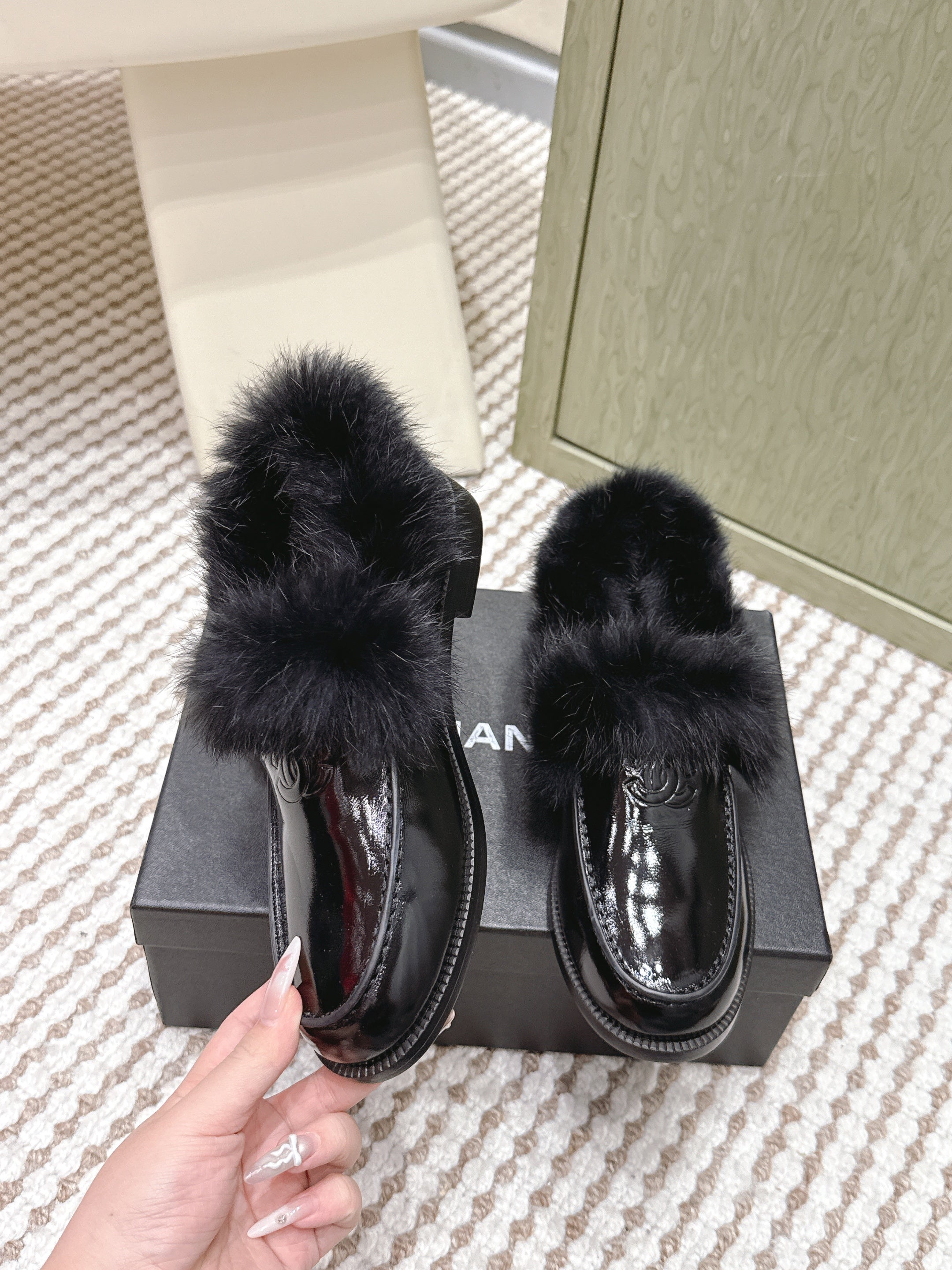 CHANEL 25S LOAFERS MOCCASIN IN BLACK GLOSSY CALFSKIN WITH MINK FUR LINING