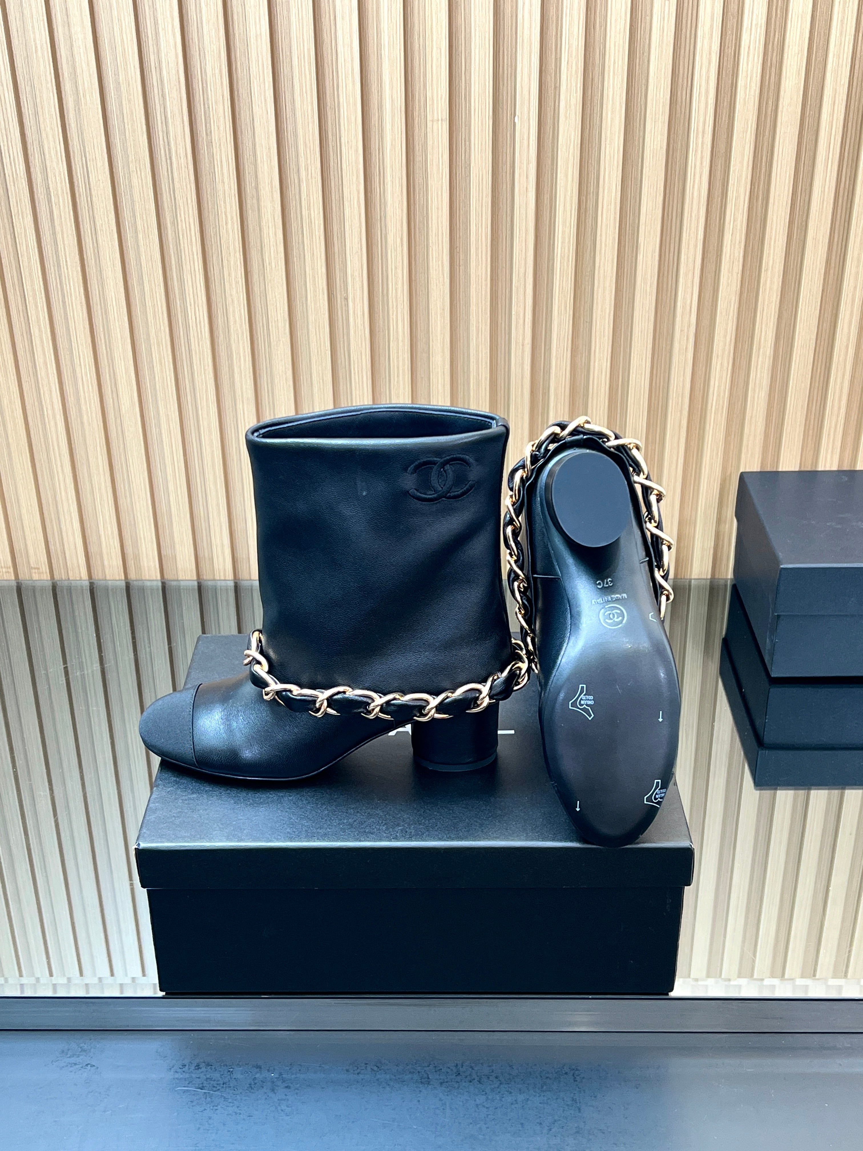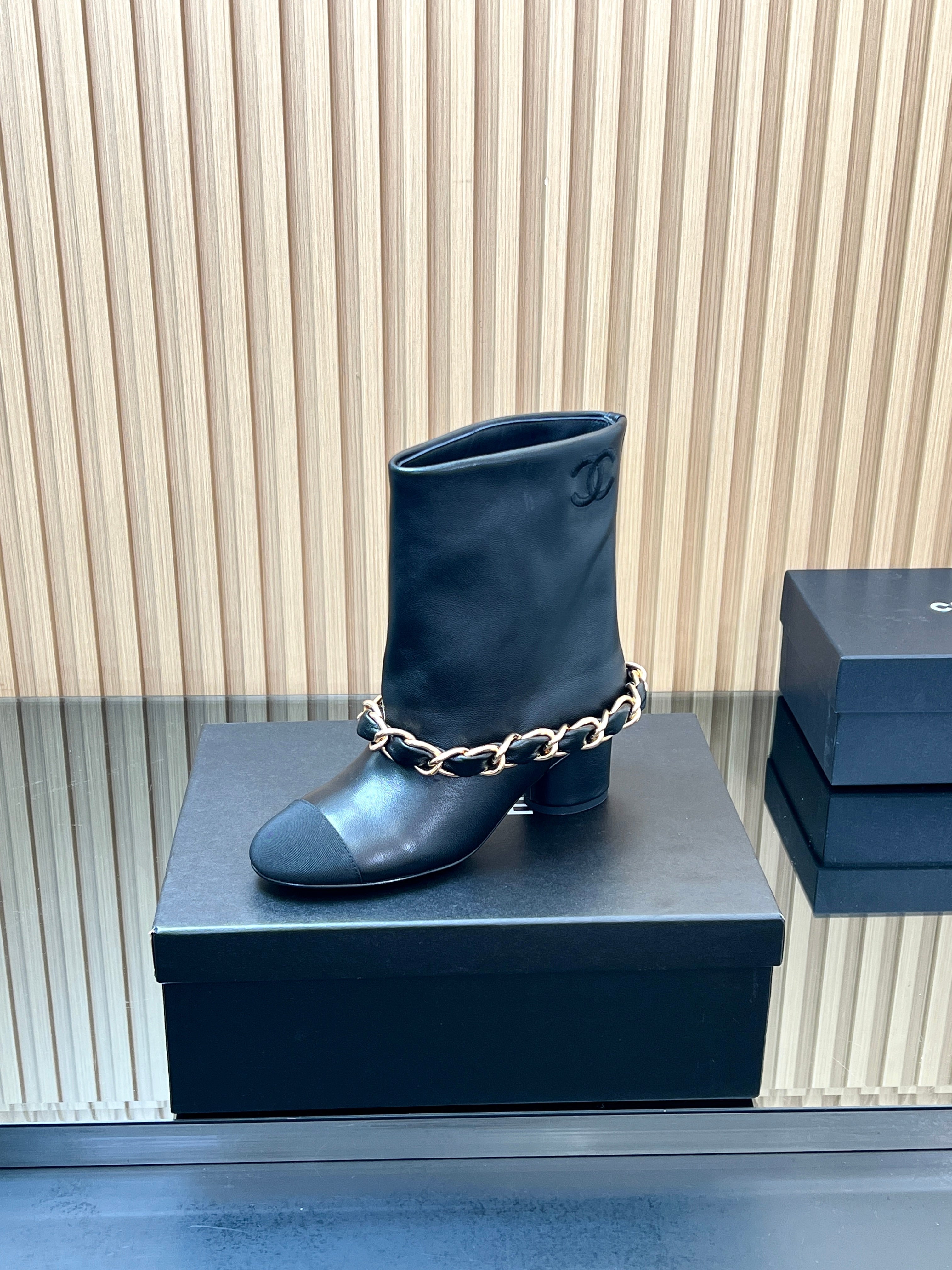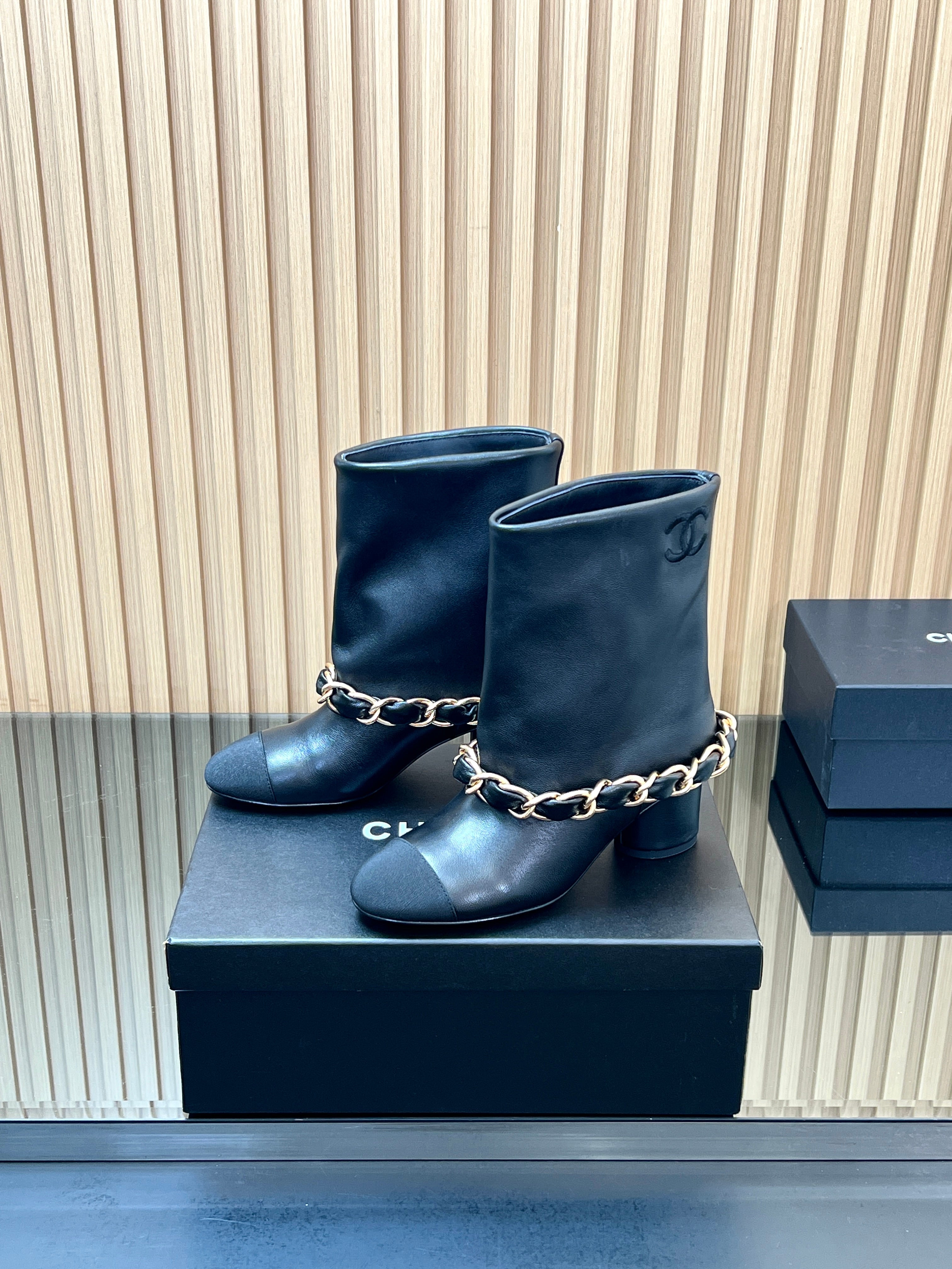 CHANEL 25S LOW BOOTS 65MM IN BLACK CALFSKIN GOLD HARDWRE