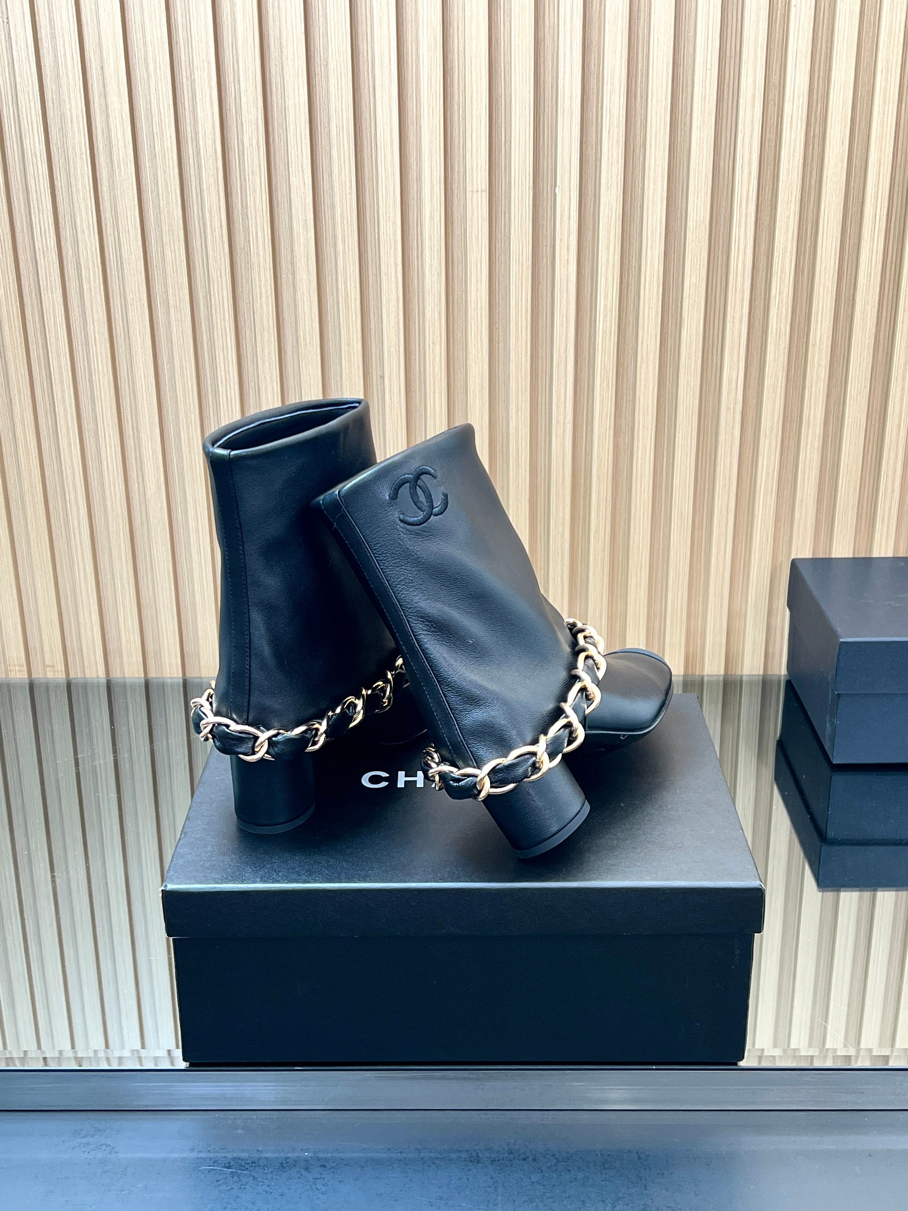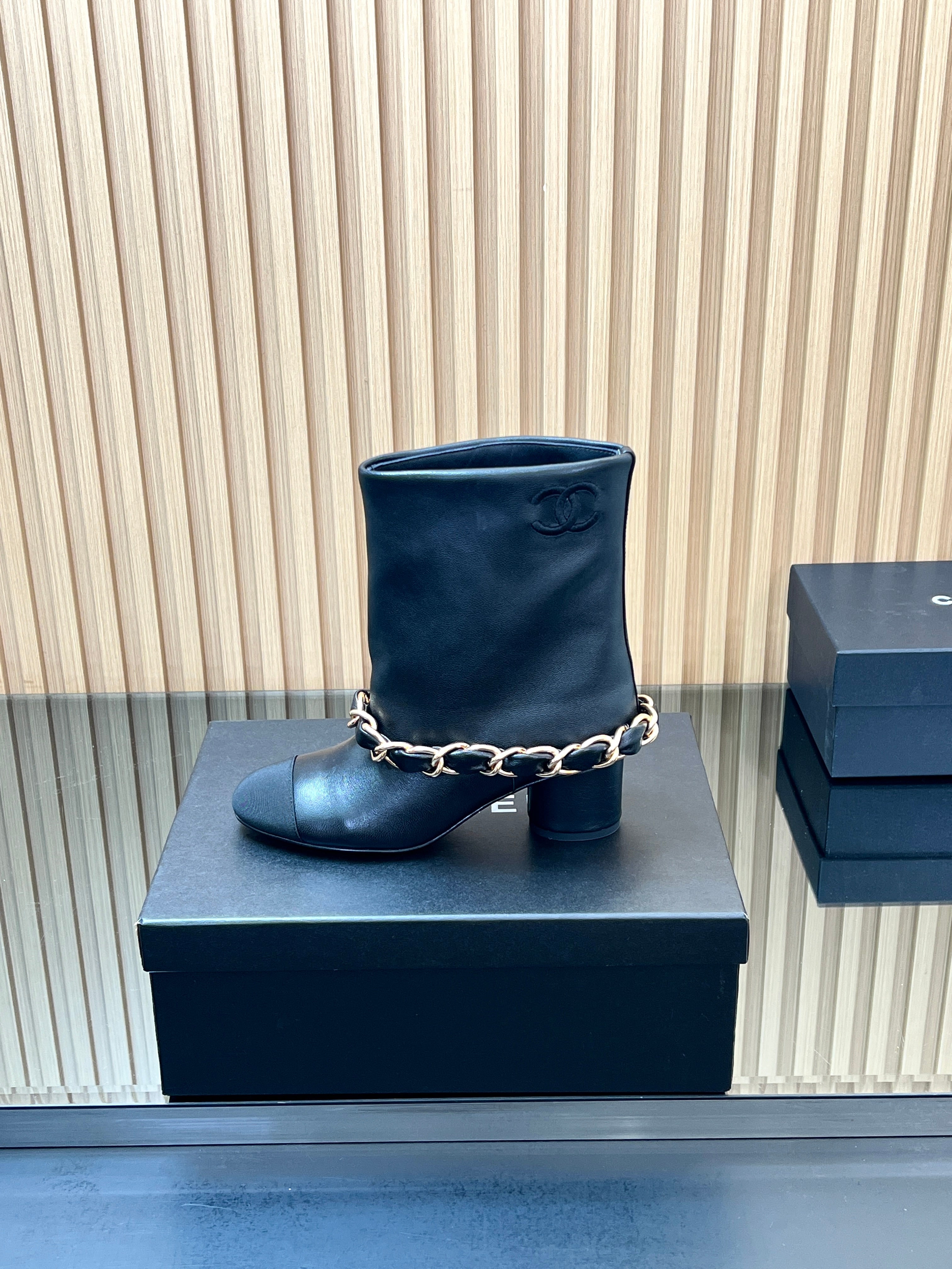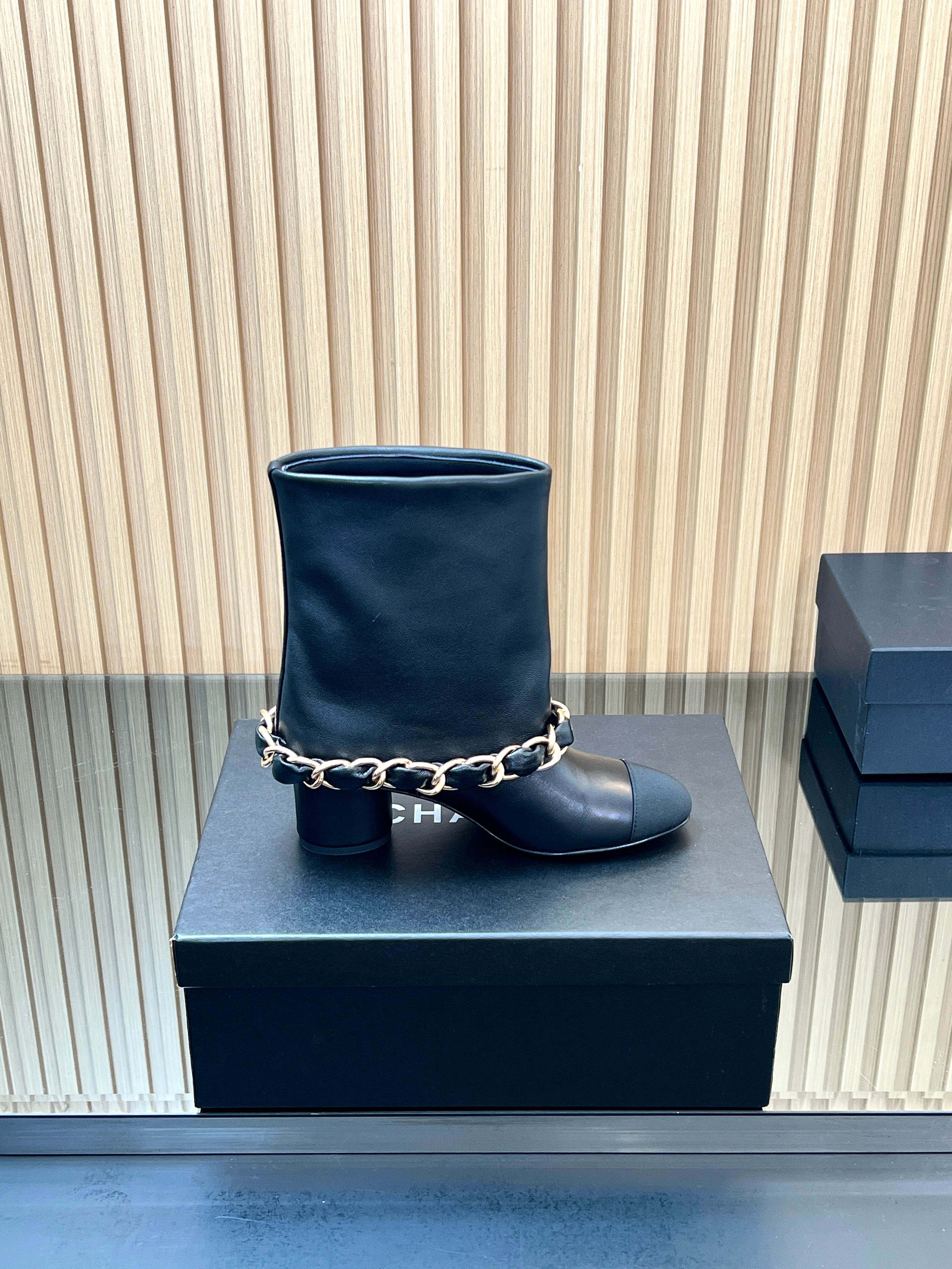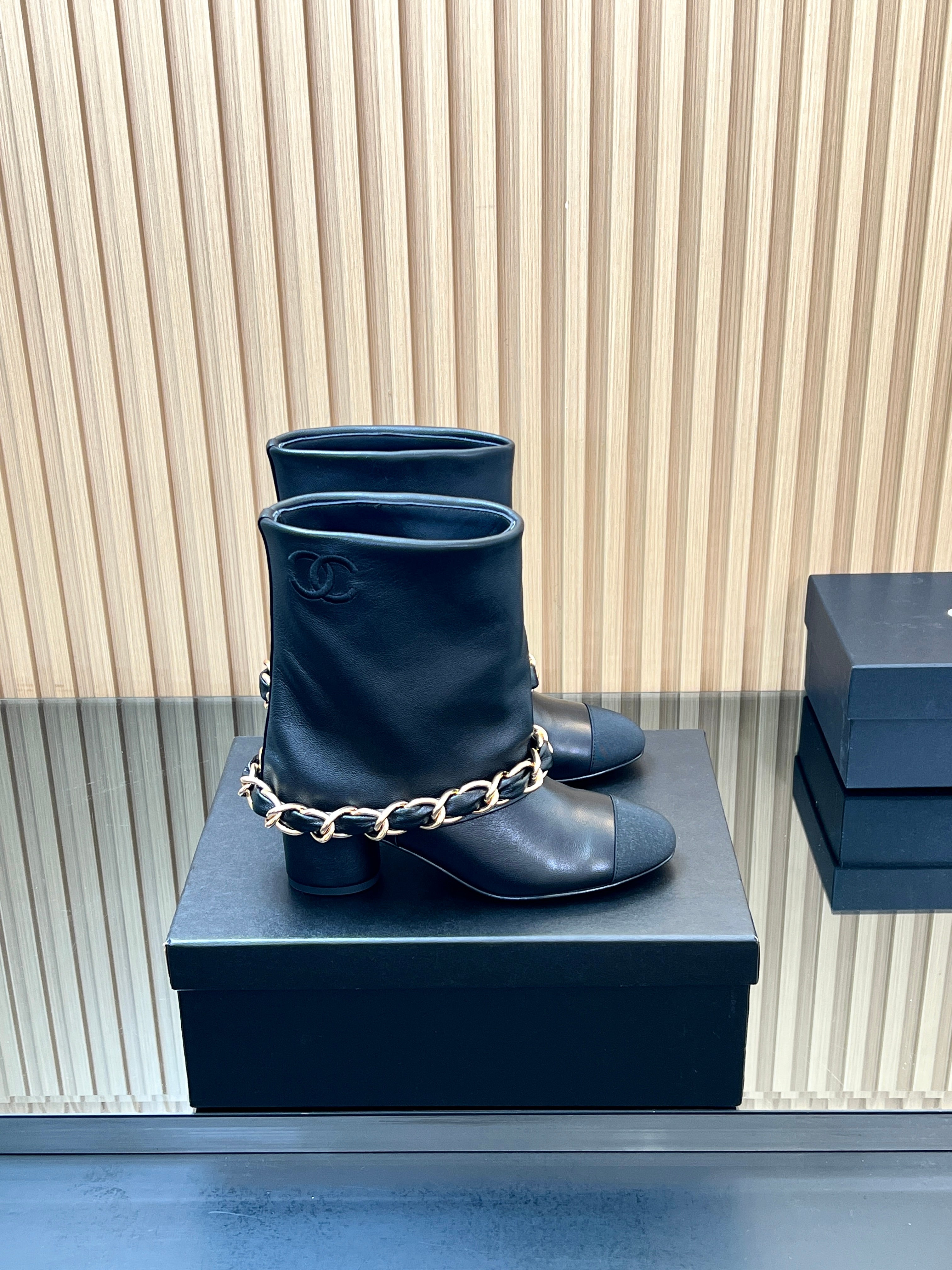 CHANEL 25S LOW BOOTS 65MM IN BLACK CALFSKIN GOLD HARDWRE