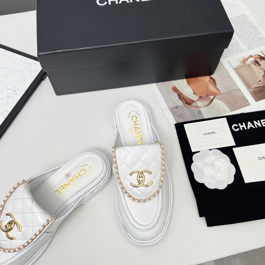 CHANEL 25S MULES WITH CHAIN DETAIL IN WHITE CALFSKIN GOLD HARDWRE