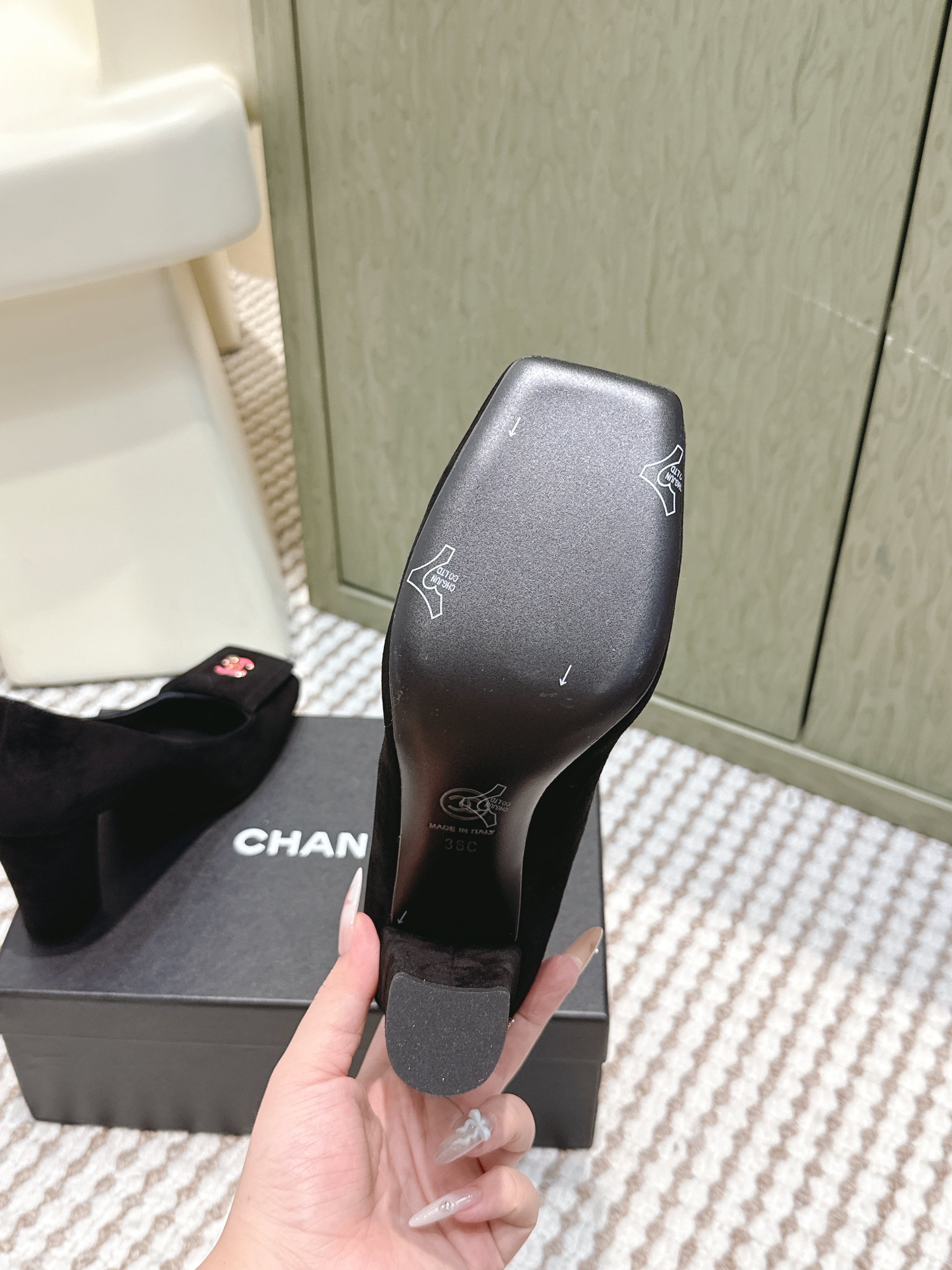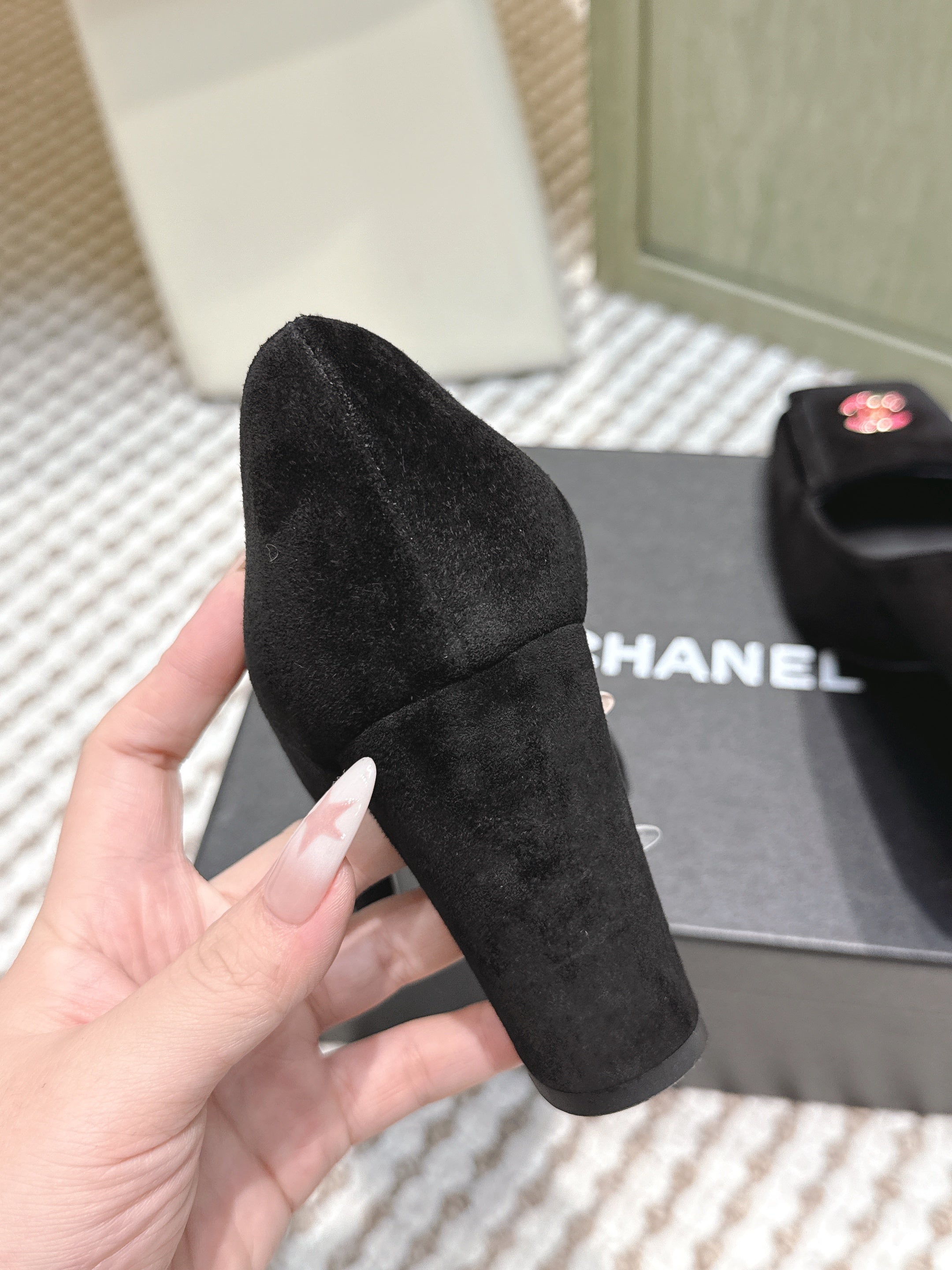 CHANEL 25S SLINGBACK SHOES 90MM IN BLACK SUEDE SQUARE TOE PINK HARDWARE
