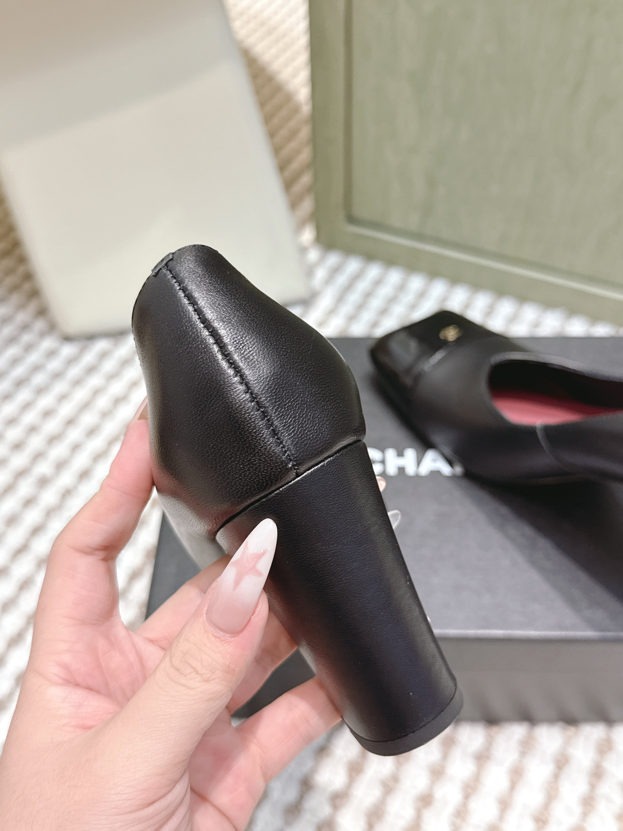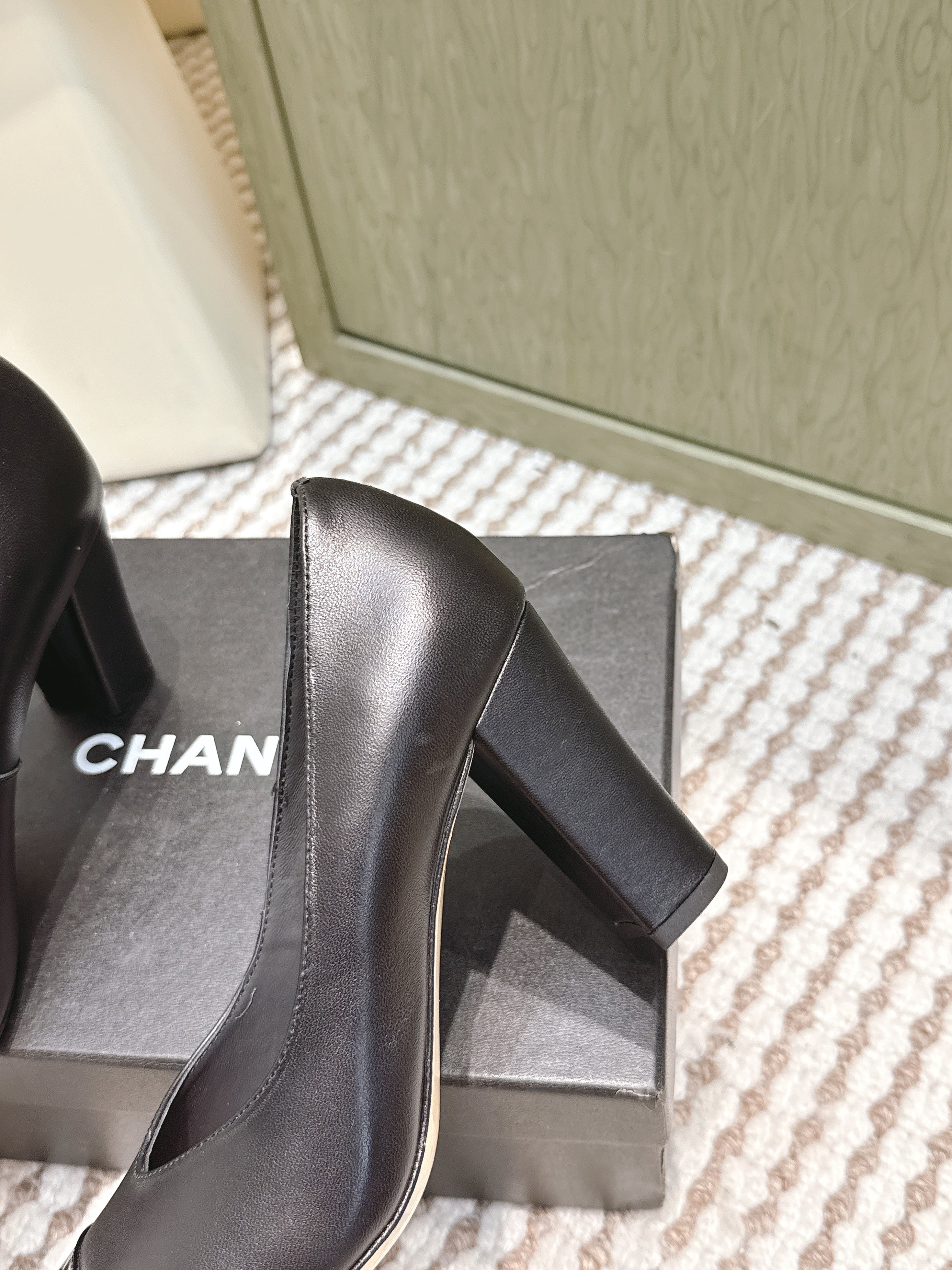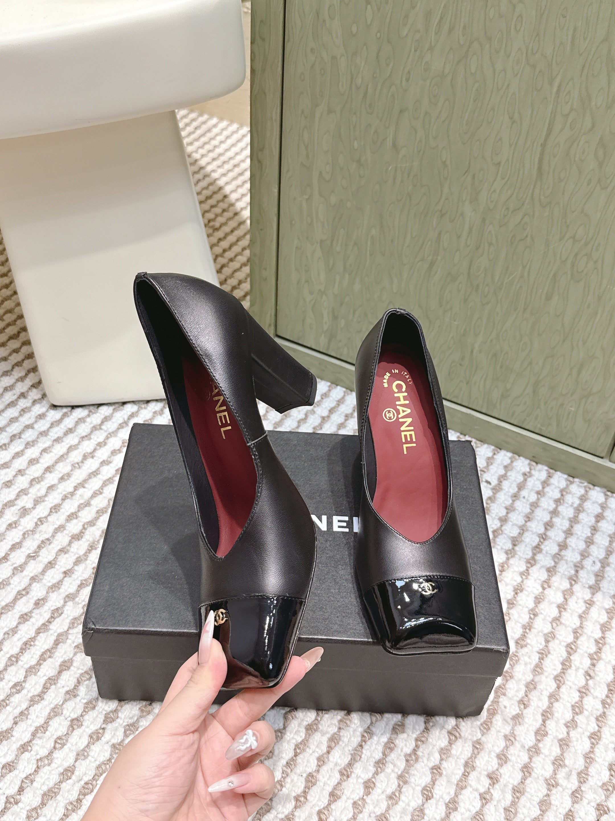 CHANEL 25S SQUARE-TOE HIGH HEELS 90MM IN BLACK CALFSKIN