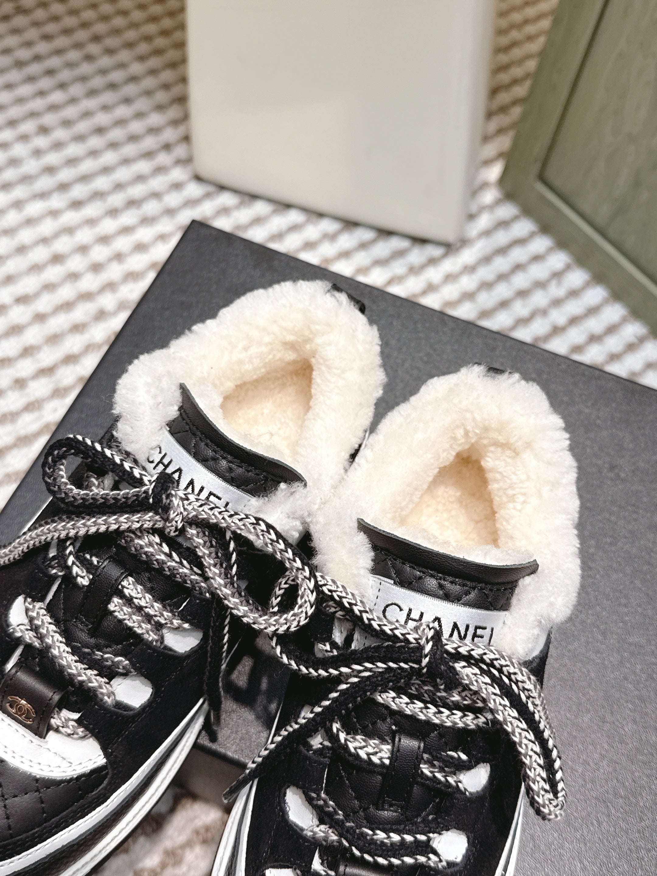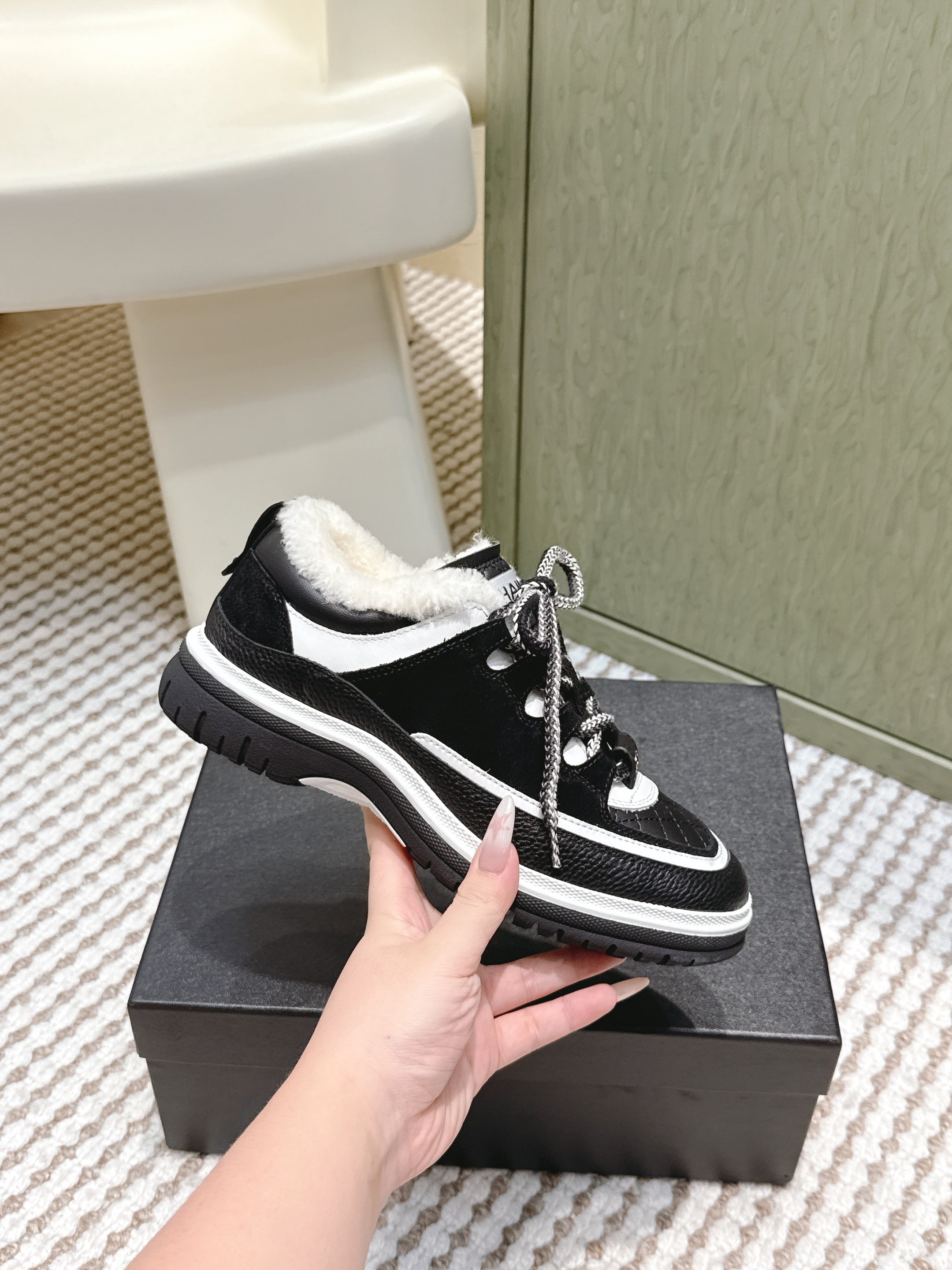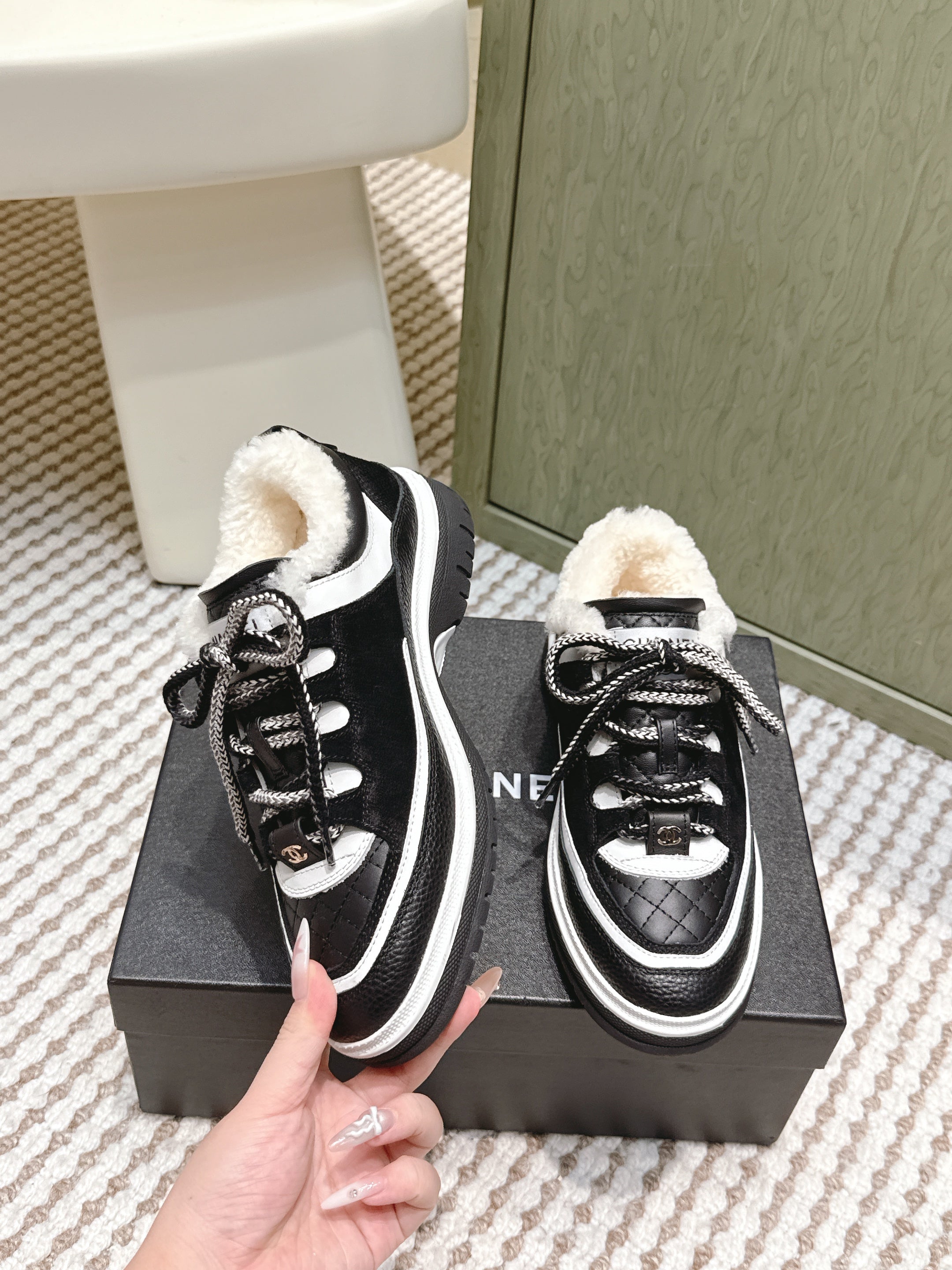 CHANEL 25S THICK-SOLE SNEAKERS IN BLACK AND WHITE CALFSKIN WITH FUR LINING