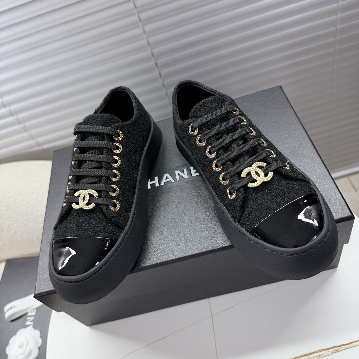 CHANEL 25S TRAINERS BLACK 35MM IN GLITTERED TWEED AND PATENT CALFSKIN