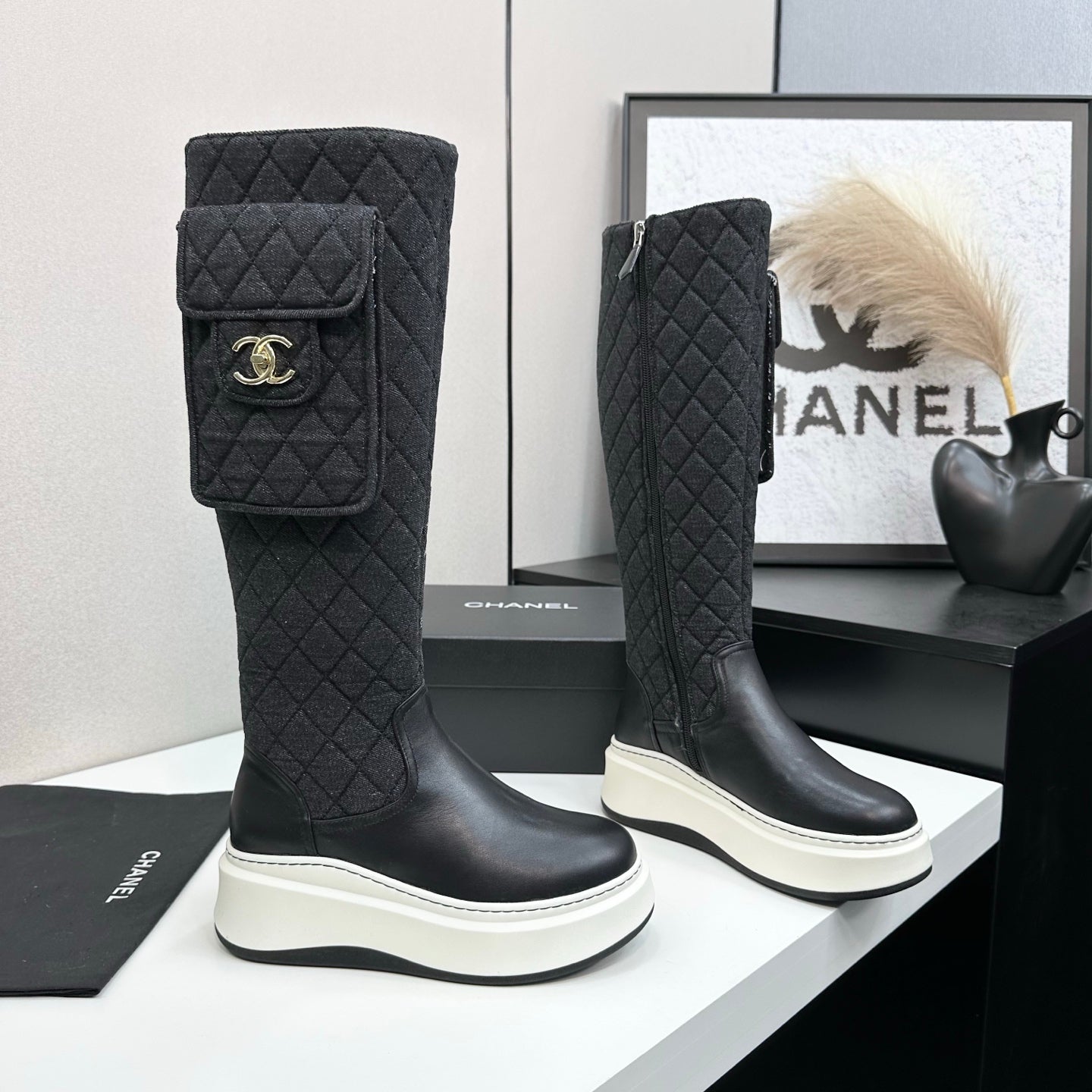 CHANEL 25S WEDGE KNEE-HIGH BOOTS IN BLACK CALFSKIN SILVER HARDWRE