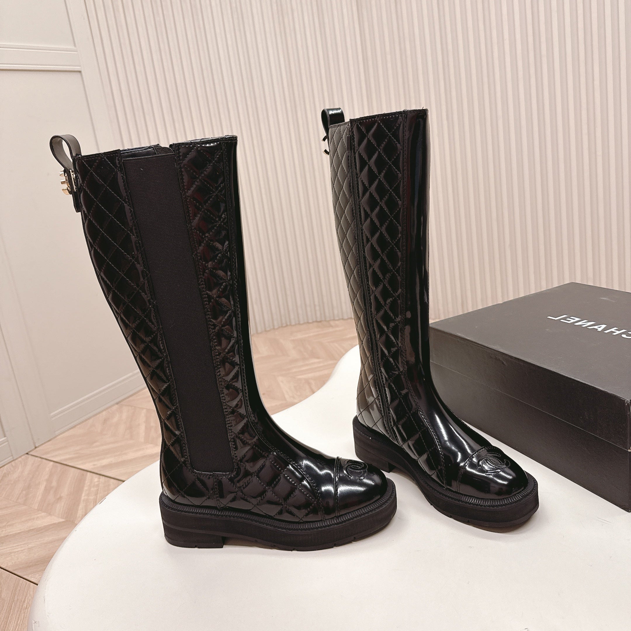 CHANEL KNEE-HIGH BOOTS 25S IN BLACK GLOSSY LAMBSKIN