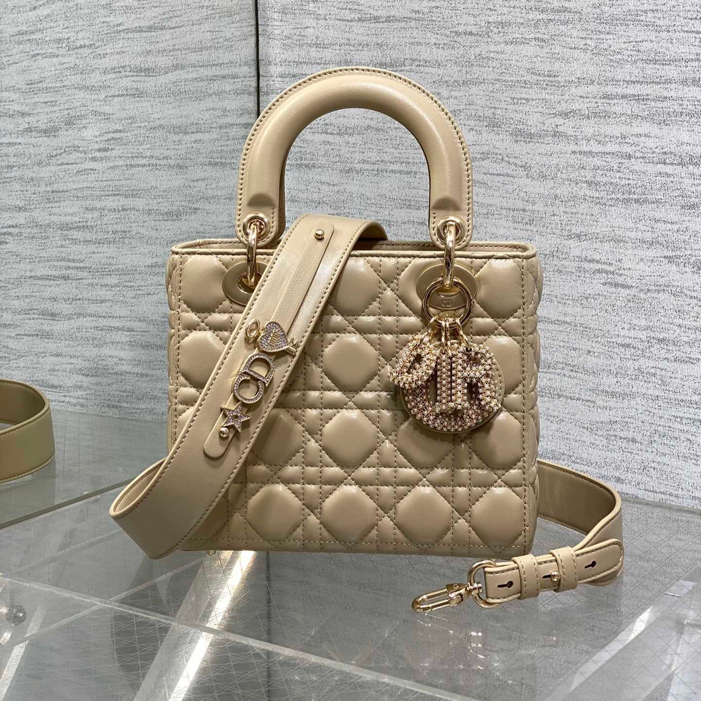 DIOR 25S LADY DIOR BAG 20 IN SAND BEIGE CALFSKIN CHARM PEARL EMBELLISHMENTS