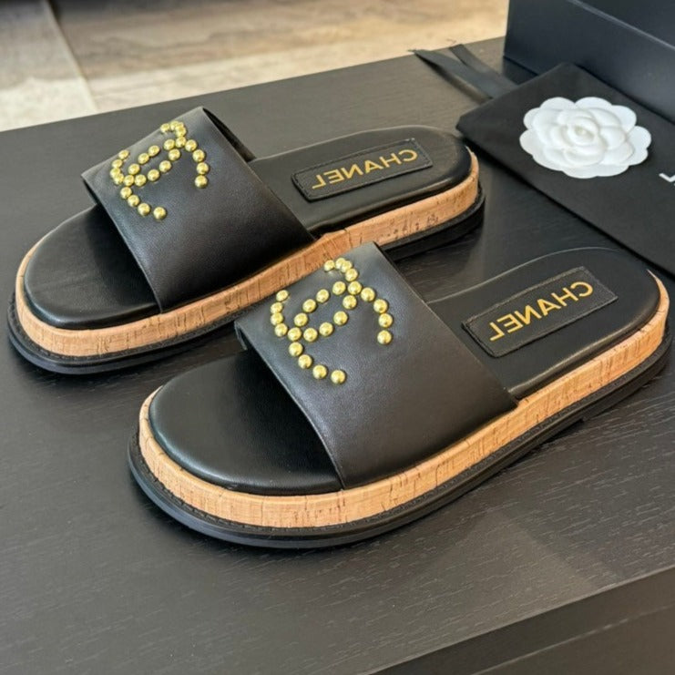 Double C Wood Grain Platform Slippers Black Sheepskin