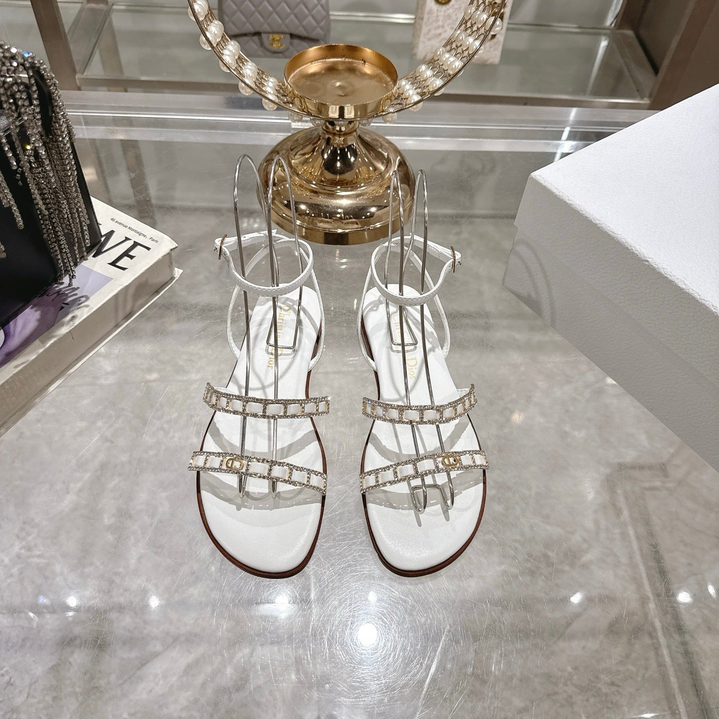FLAT SANDALS 25S IN WHITE CALFSKIN RHINESTONES STRAP